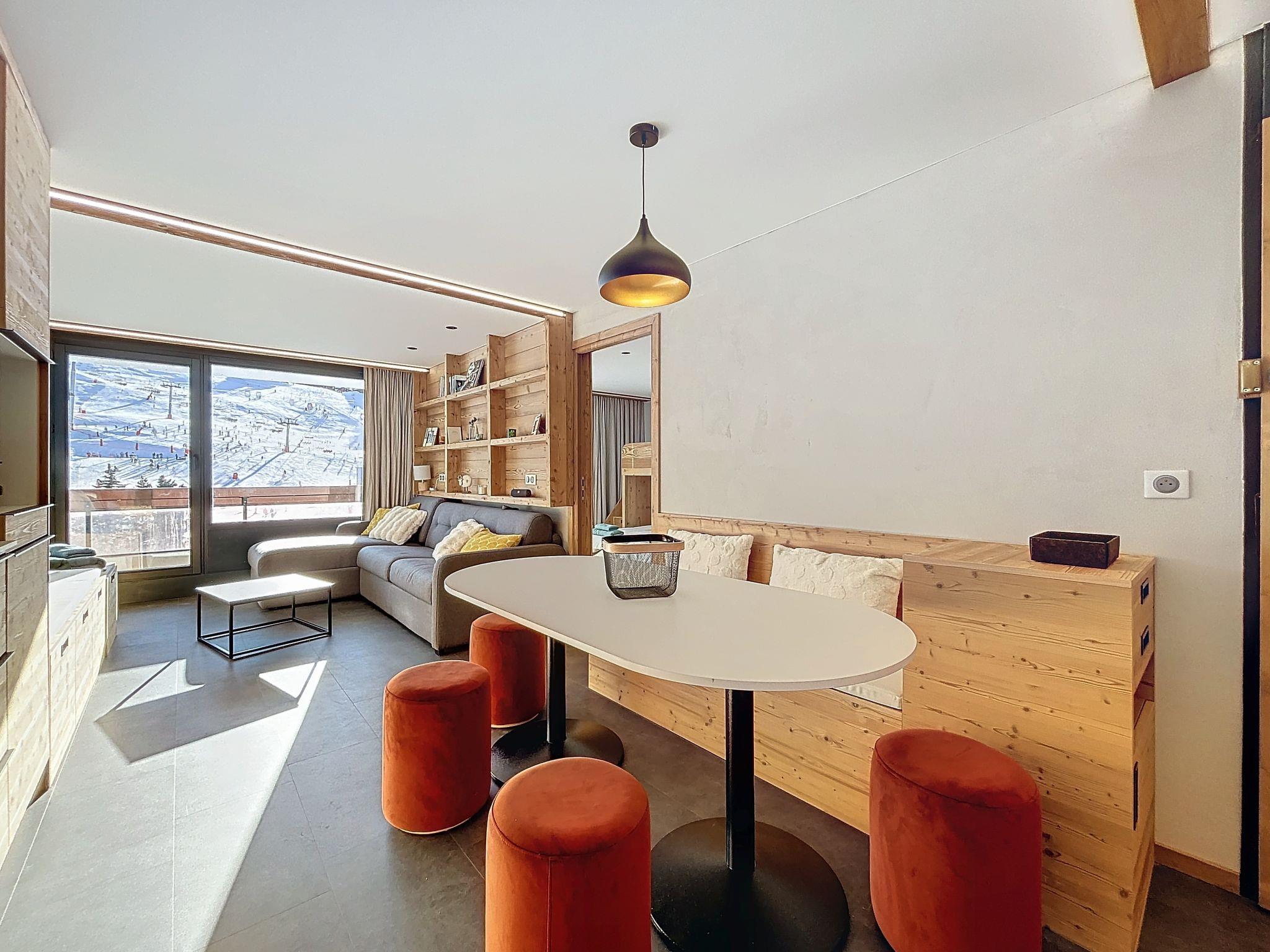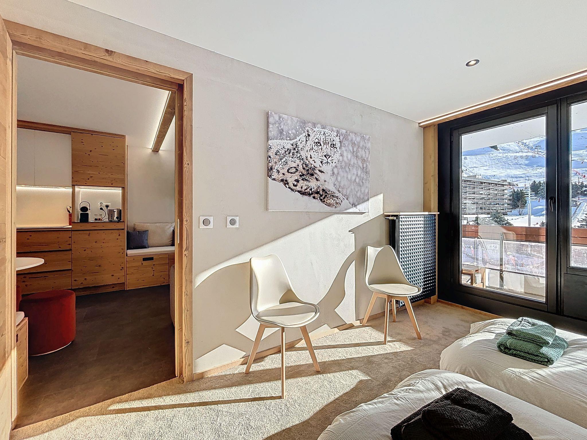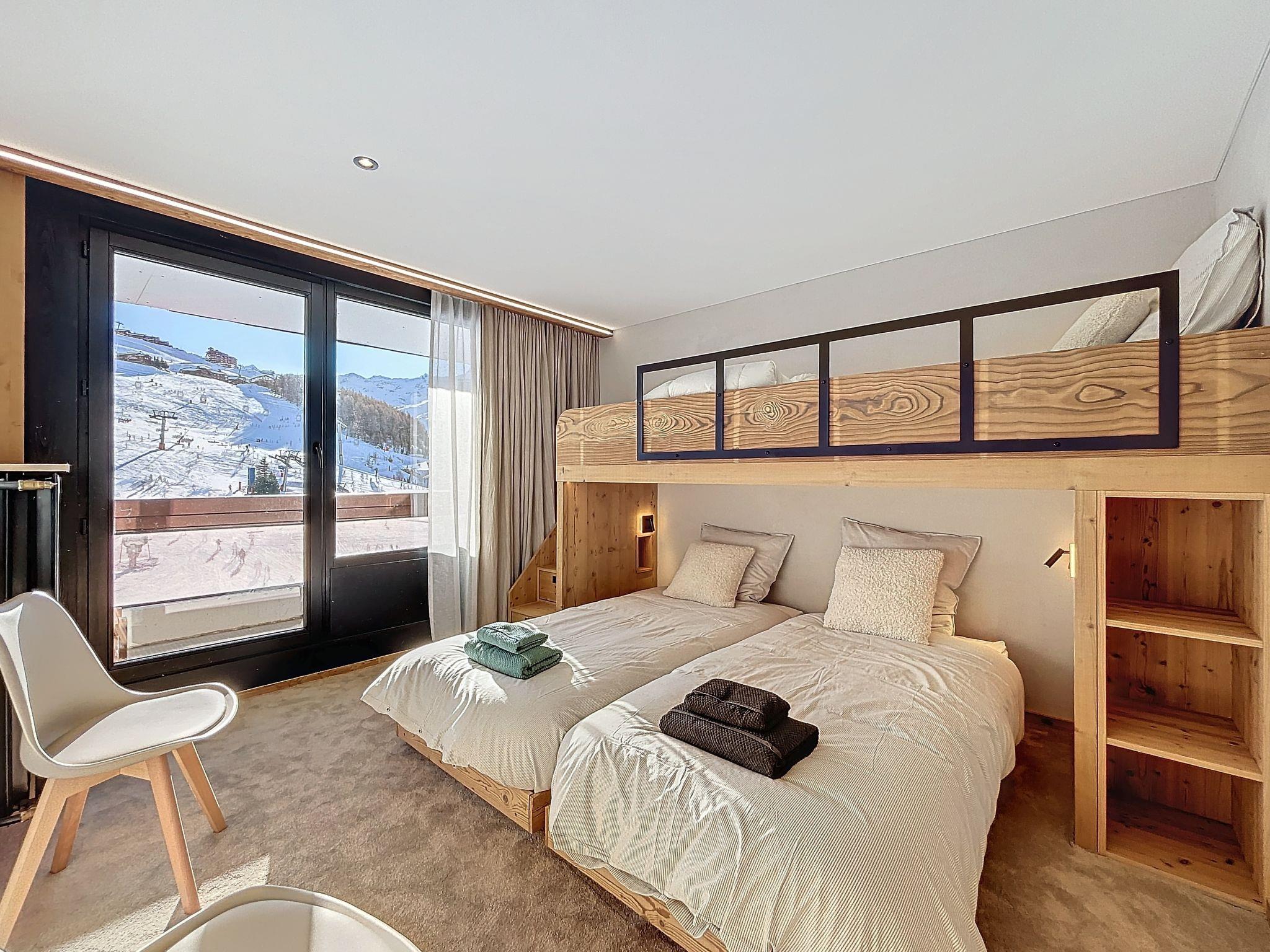 "Péclet 305", 3-room apartment 56 m2 on 3rd floor, south facing position. Fully renovated in 2024, very beautiful and modern furnishings: living/dining room with 1 double sofabed (160 cm, length 190 cm), TV (flat screen). Exit to the balcony, south facing position. 1 room with 1 french bed (160 cm, length 200 cm). Exit to the balcony, north facing position. 1 room with 3 beds (90 cm, length 200 cm), bath/WC. Exit to the balcony, south facing position. Kitchen (dishwasher, 4 induction hot plates, toaster, kettle, electric coffee machine, Capsules for coffee machine (Nespresso) extra, raclette grill, combination microwave). Shower, sep. WC. Electric heating. Parquet floors, carpet. Very beautiful view of the mountains and the ski run. Facilities: Internet (WiFi). Please note: non-smokers only. Smoke alarm. Offer by a commercial proprietor according to Art. 155, IV, CGI 73257005775MX