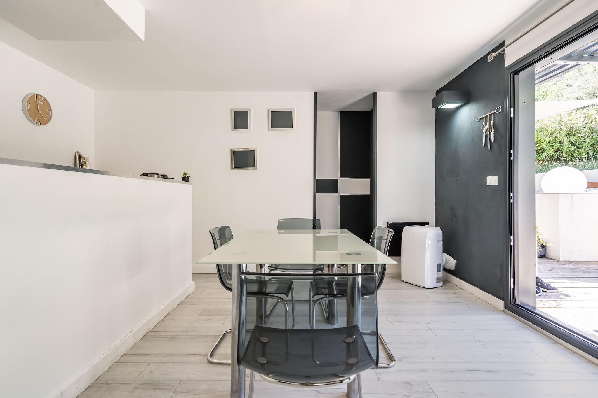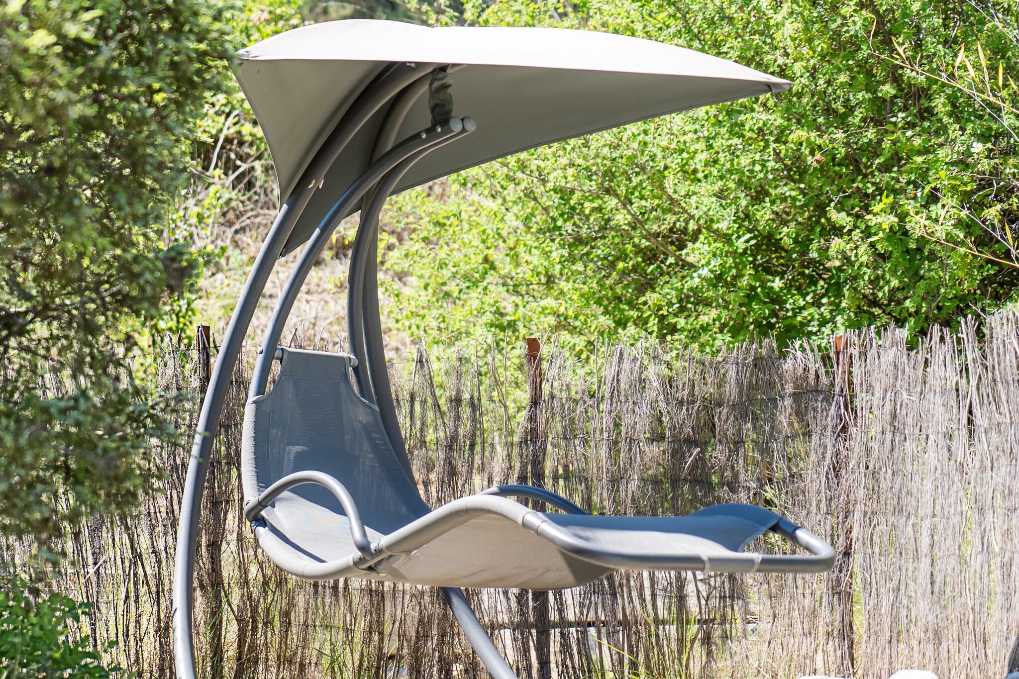 Ground floor: (Living room(TV, seating area, air conditioning), open kitchen(electric kettle, cooker(2 ring stoves, gas), coffee machine, oven, microwave, dishwasher, fridge, fridge-freezer), Bedroom with bathroom(double bed(two single duvets, 160 x 200 cm), shower, washbasin), Bedroom with bathroom(double bed(160 x 200 cm), shower, washbasin, toilet), toilet) washing machine, heating(electric), terrace, garden, garden furniture, BBQ, parking, deckchairs, swimming pool(private, opened from 1/2 Apr upto and including 1/2 Oct), boules court