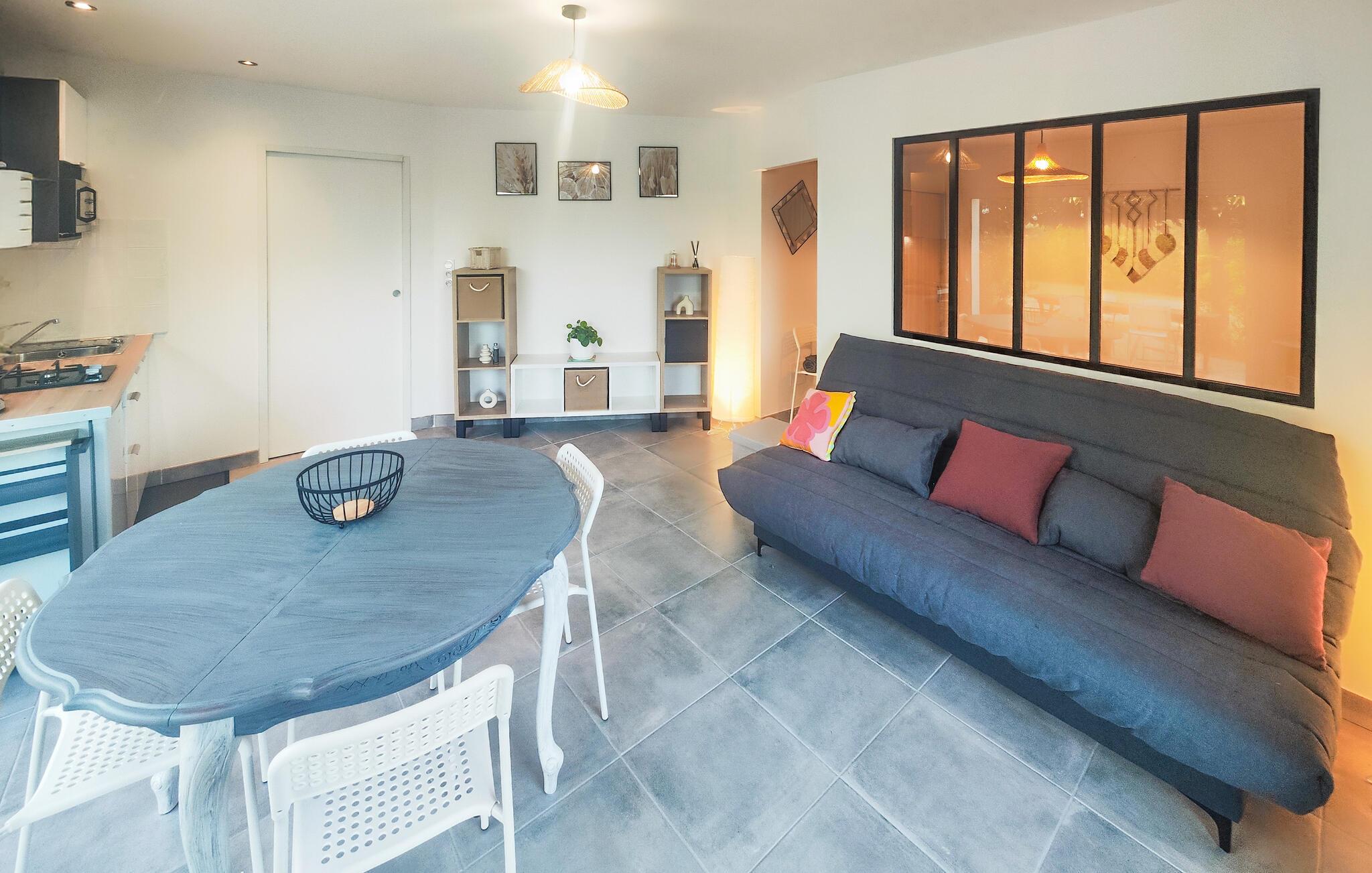 Diese Wohnung bietet Ihnen alles, was Sie für eine entspannte Auszeit brauchen – ein bequemes Sofa und einen Fernseher für gemütliche Stunden sowie eine funktional eingerichtete Küche. In dieser angenehmen Atmosphäre fällt es leicht, den Alltag hinter sich zu lassen und ganz in den Moment einzutauchen. Beginnen Sie den Tag mit einer frisch gebrühten Tasse Kaffee, vertiefen Sie sich in einen spannenden Podcast oder kochen Sie gemeinsam ein frisches Gericht.