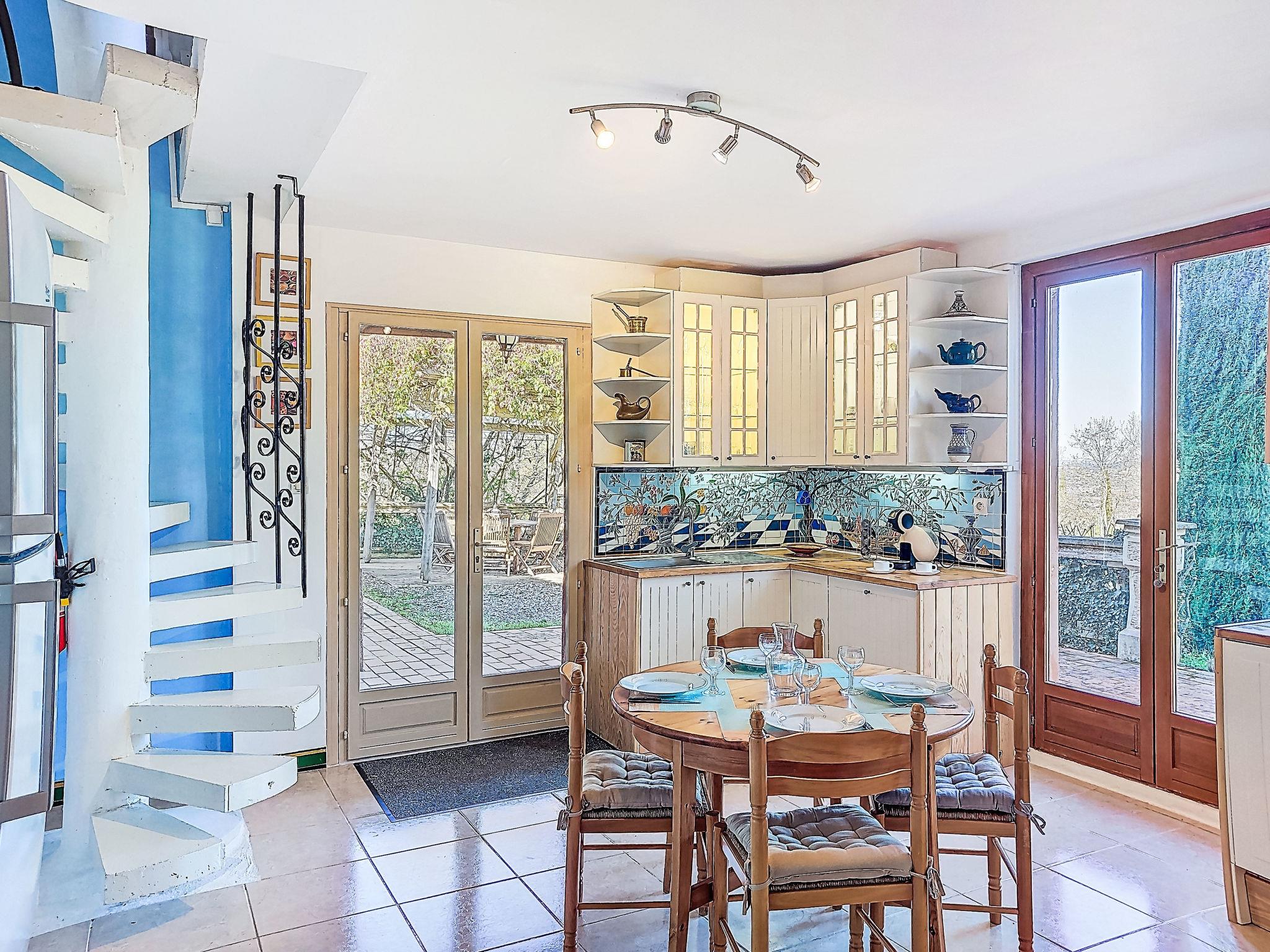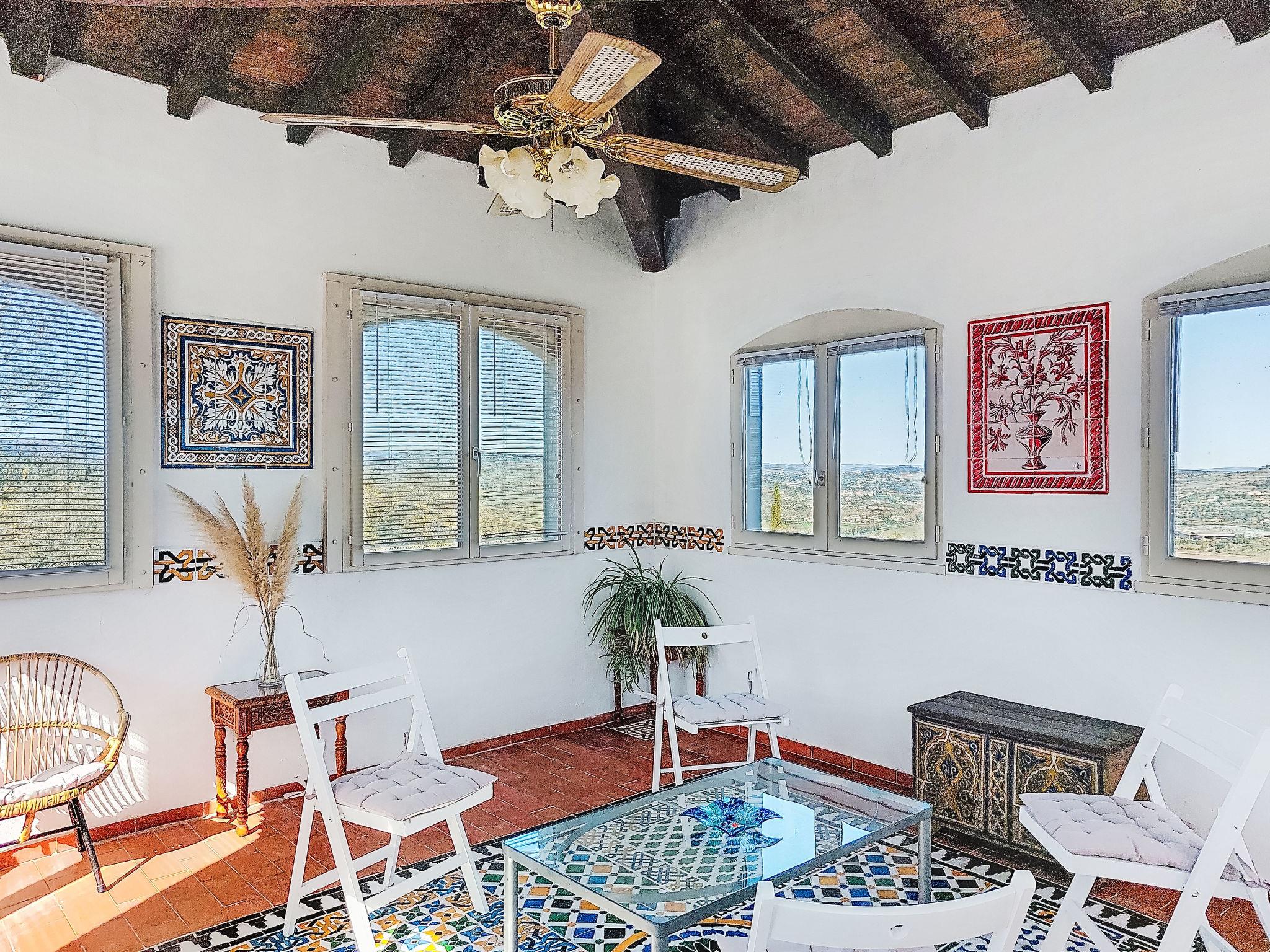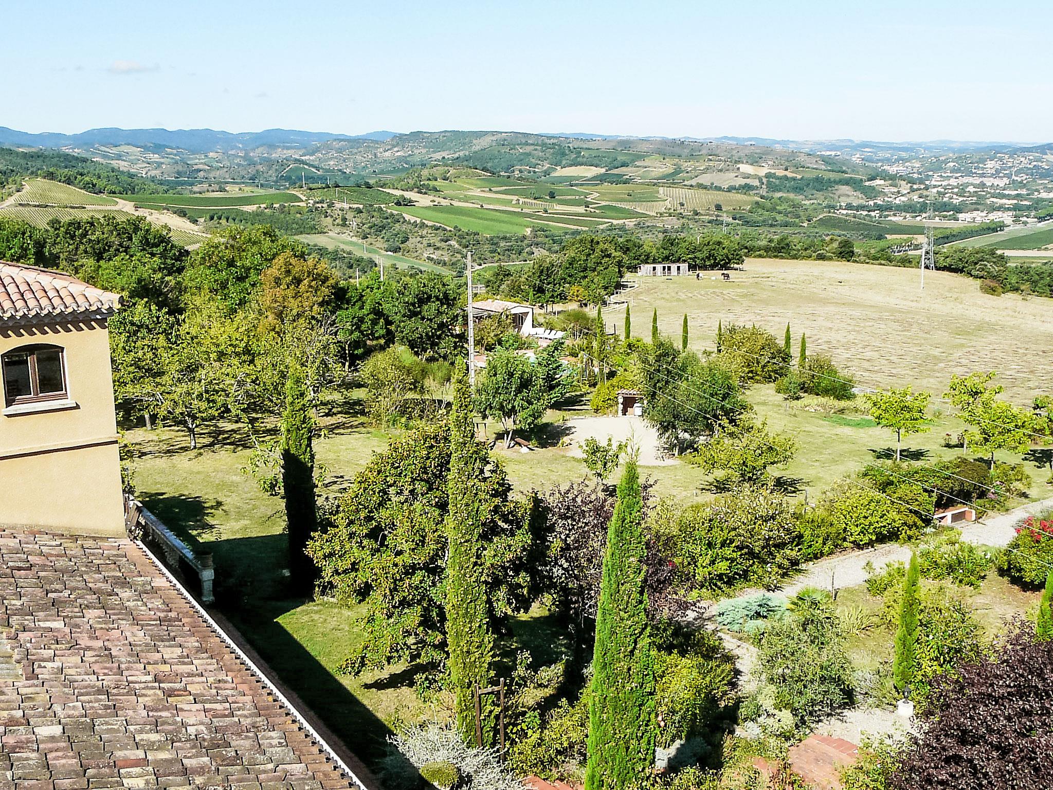 6-room house 300 m2 on 3 levels. Partly renovated in 2025, stylish furnishings: large living/dining room 120 m2 with TV and international TV channels (flat screen), DVD and air conditioning. Exit to the terrace. 1 room with 2 beds. 1 room with 1 french bed (160 cm, length 200 cm), separate WC and shower. 1 room with 1 french bed (140 cm), separate WC and shower. Open kitchen (oven, dishwasher, 4 ceramic glass hob hotplates, microwave, freezer, electric coffee machine, Capsules for coffee machine (dolce gusto) extra) with dining table. Shower/WC. Upper floor: (spiral staircase), 1 room with 1 french bed (160 cm, length 200 cm). 2nd upper floor: (spiral staircase) lounge. Electric heating. Porch 12 m2, south facing position. Terrace furniture, barbecue (portable), deck chairs (8). Marvellous panoramic view of the valley and the countryside. Facilities: washing machine, iron, hair dryer. Garage (2 cars), height 225 cm, width 237 cm. Please note: maximum 1 pet/ dog allowed. Smoke alarm. 3 wall fountains and a skylight in the living room. Alambra mosaics (Arabic type) throughout the house. The rooms located upstairs are in the tower, the living room is accessible via the double bedroom only from where we have a 180 degree view of the surrounding countryside. A plancha (gas) has been installed on the terrace near the kitchen. Please note: Air conditioning is only available in the bedrooms.