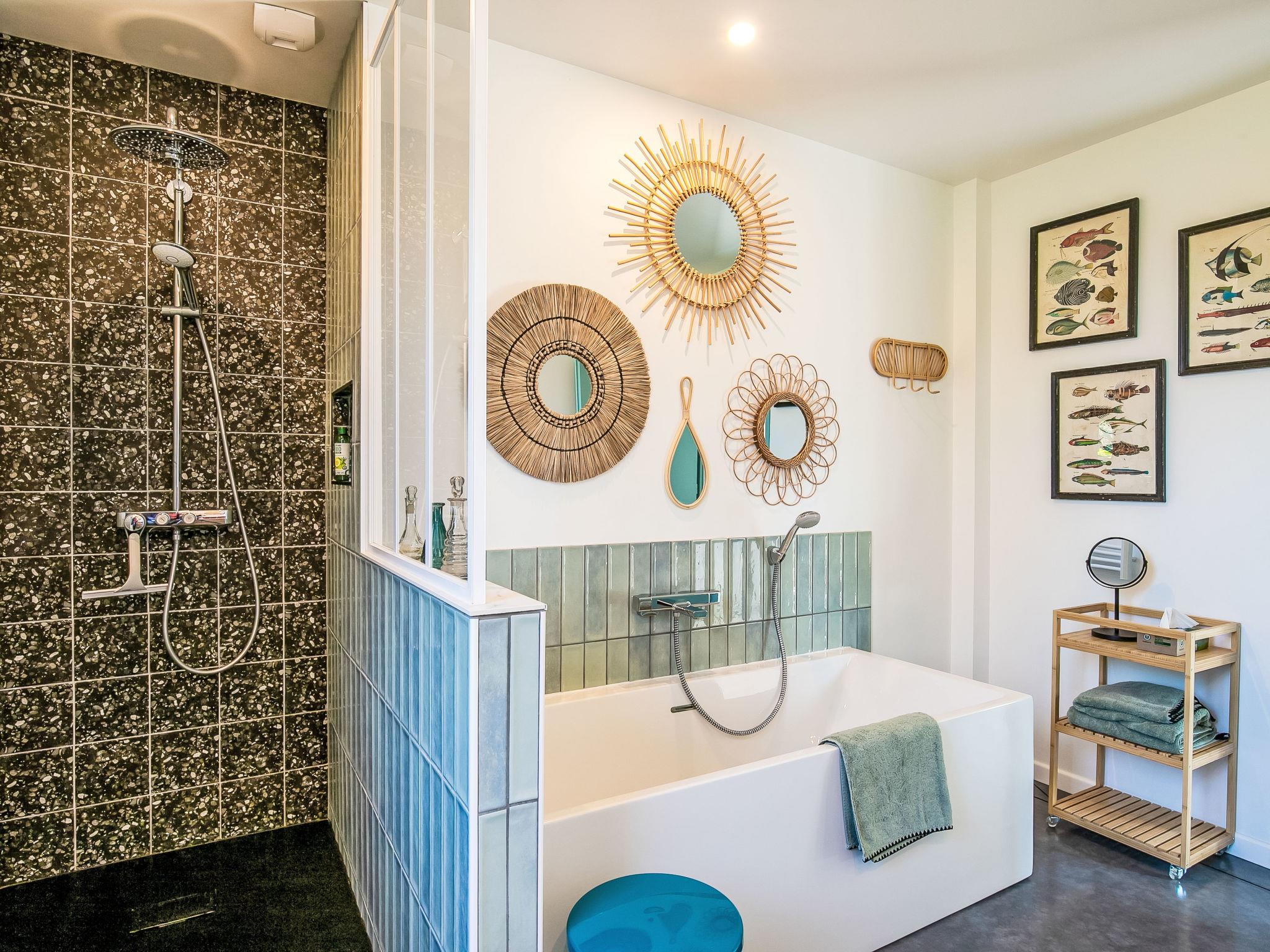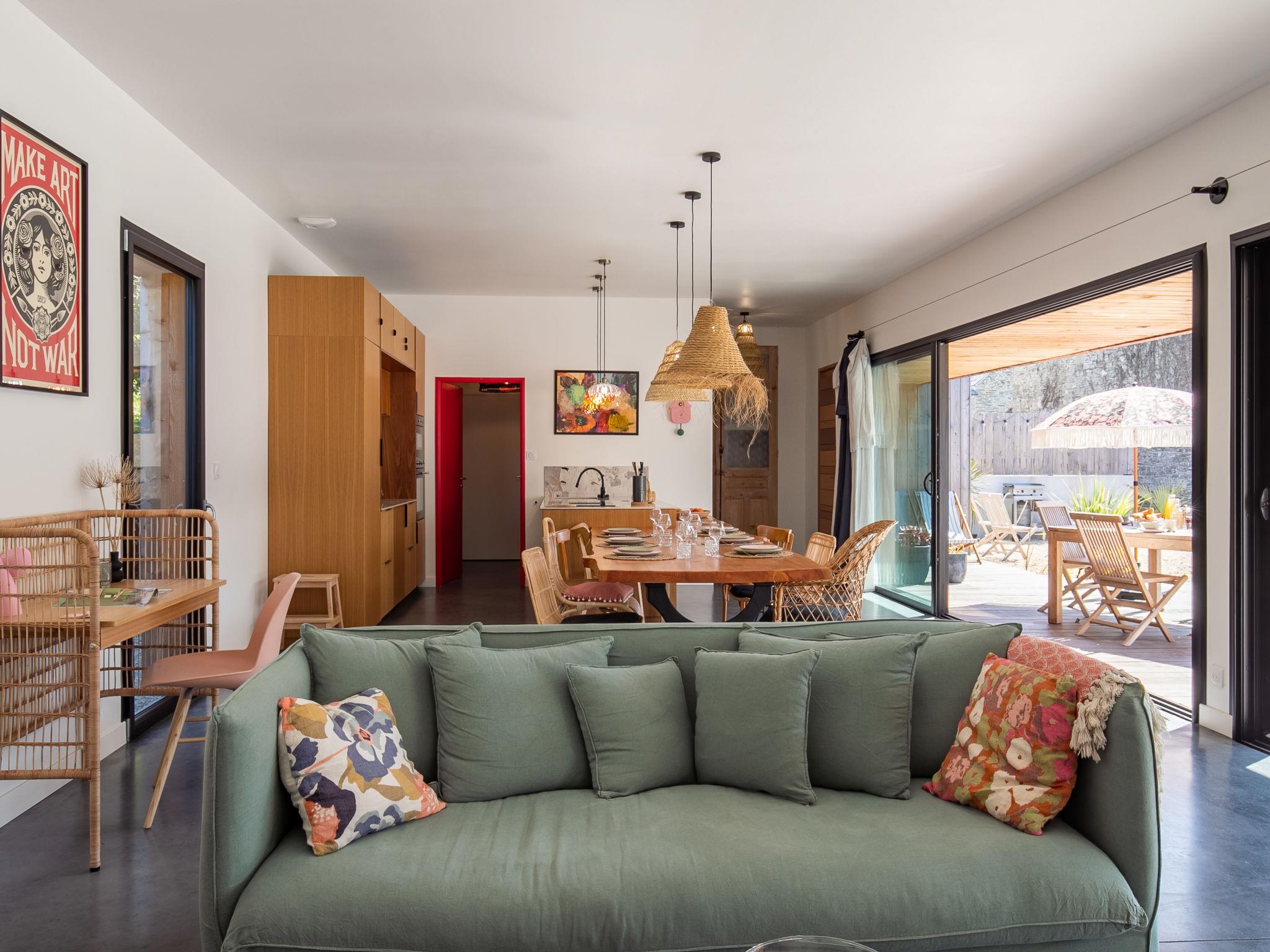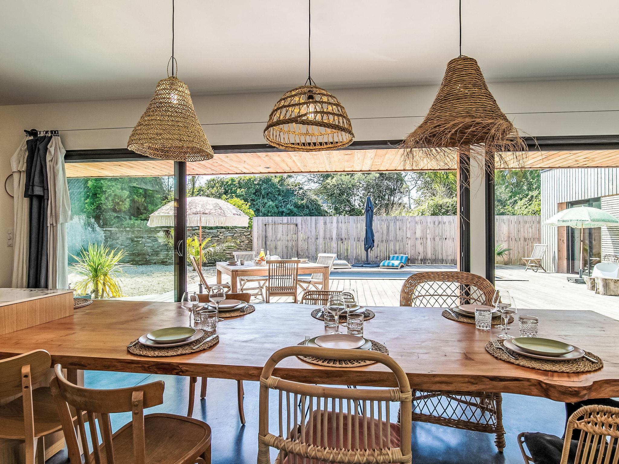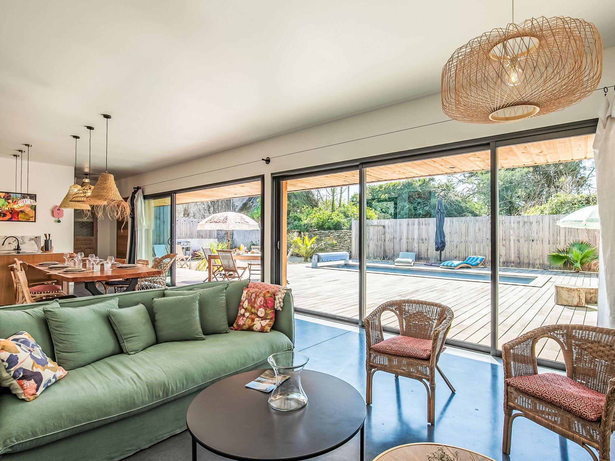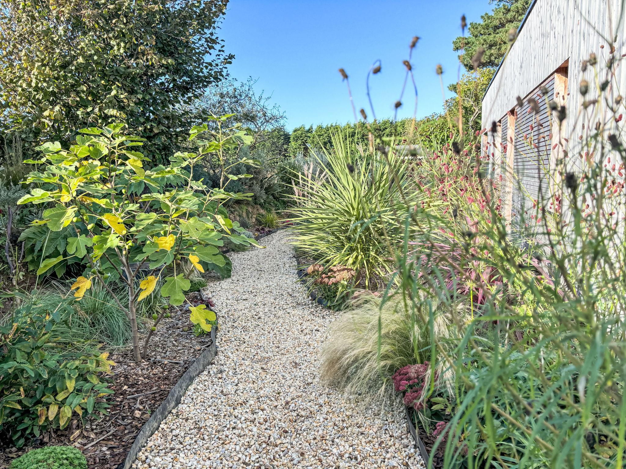 Locquirec: Very modern, beautiful, comfortable single-family house "La Villa Agapanthes", built in 2023. 1.3 km from the centre of Locquirec, 5.3 km from the centre of Plestin-les-Grèves, 750 m from the sea, from the beach. Private: property 663 m2, well-kept garden with lawn and wildlife garden, swimming pool angular, heated, secured (2 x 7 m, 14 m2, depth 135 cm, seasonal availability: 01.Apr. and 31.Oct.) with shutter cover. Terrace (100 m2), garden furniture, barbecue, pool maintenance by the owner/gardener. Parking (for 3 cars) on the premises. Shop 1.3 km, grocery 400 m, supermarket 5.3 km, restaurant 1 km, bar 1 km, bakery 4.8 km, bicycle rental 500 m, bus stop "Pennenez" 160 m, sandy beach "Les Sables Blancs" 750 m, diving center 20 km. Sports harbour 1 km, surf school 1 km, sailing school 1 km, walking paths from the house 750 m. Nearby attractions: Plougasnou 14 km, Morlaix 21 km, Lannion 30 km, Ploumanac'h, Côte du Granit Rose 44 km, Roscoff, Jardin exotique 46 km. Hiking paths: GR34, sentier des douaniers 600 m. Single-storey house, wheelchair accessible. Low consumption, DPE A, house and swimming pool heated by two heat pumps. Bread depot 400m away.