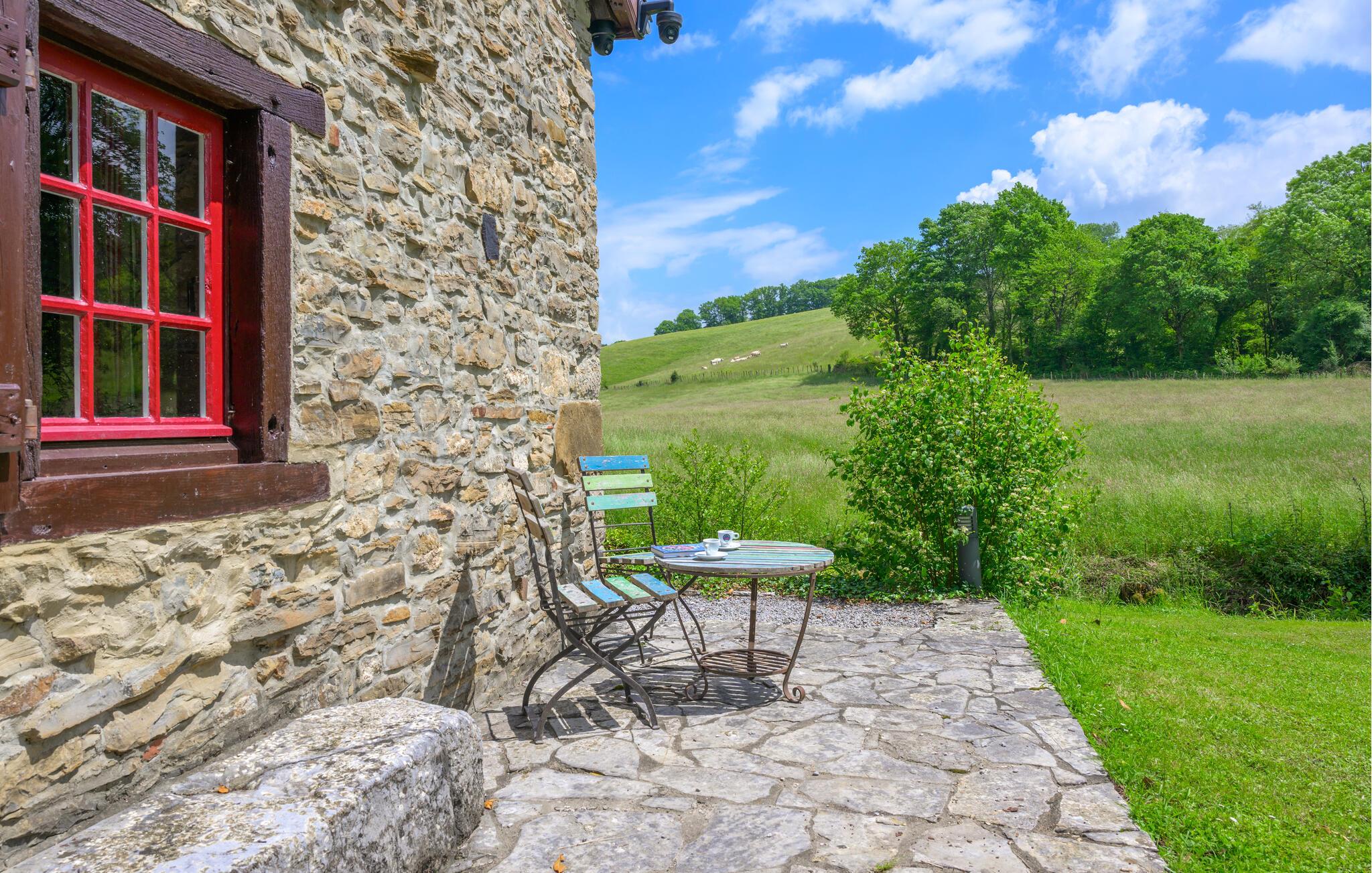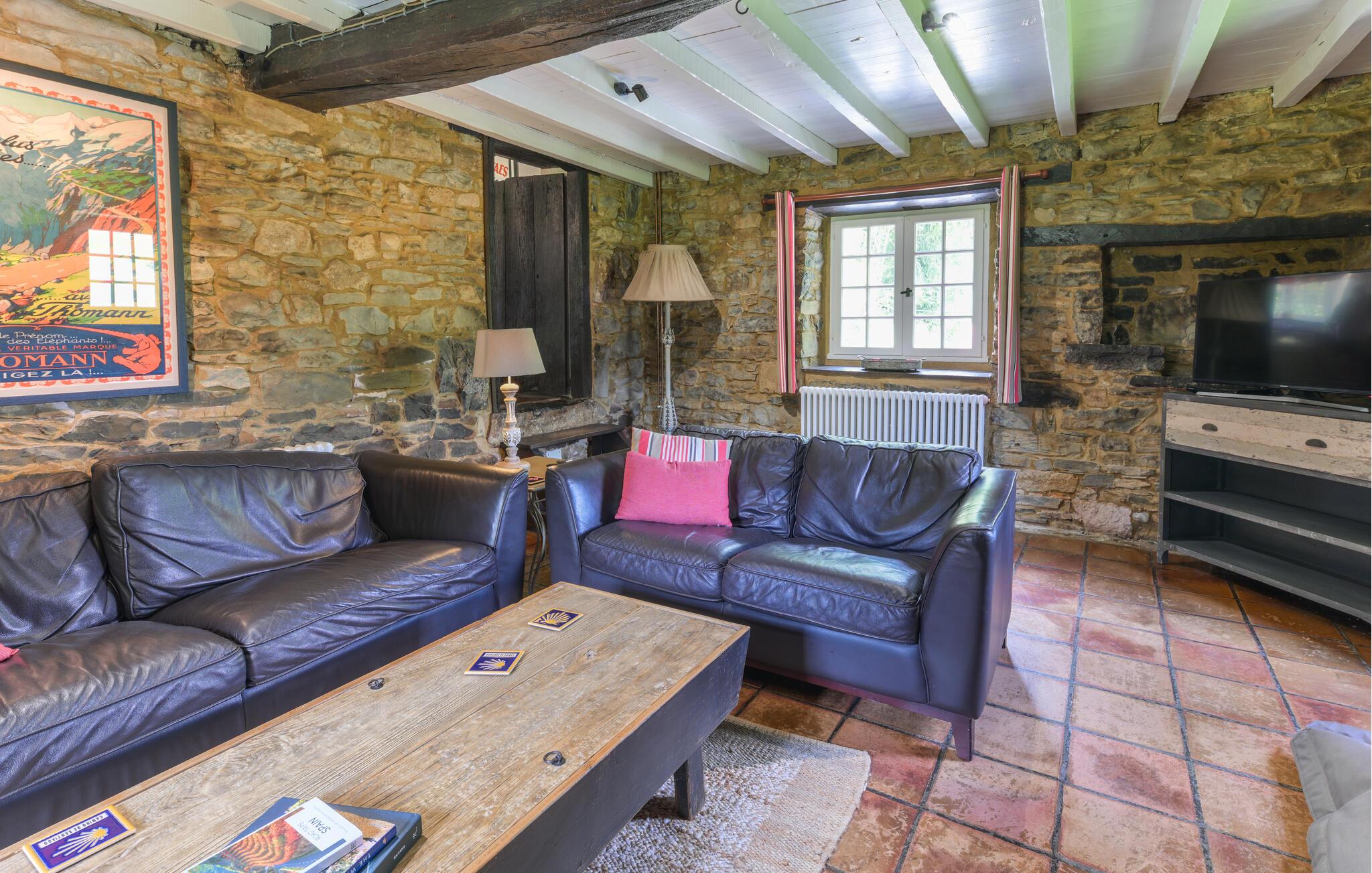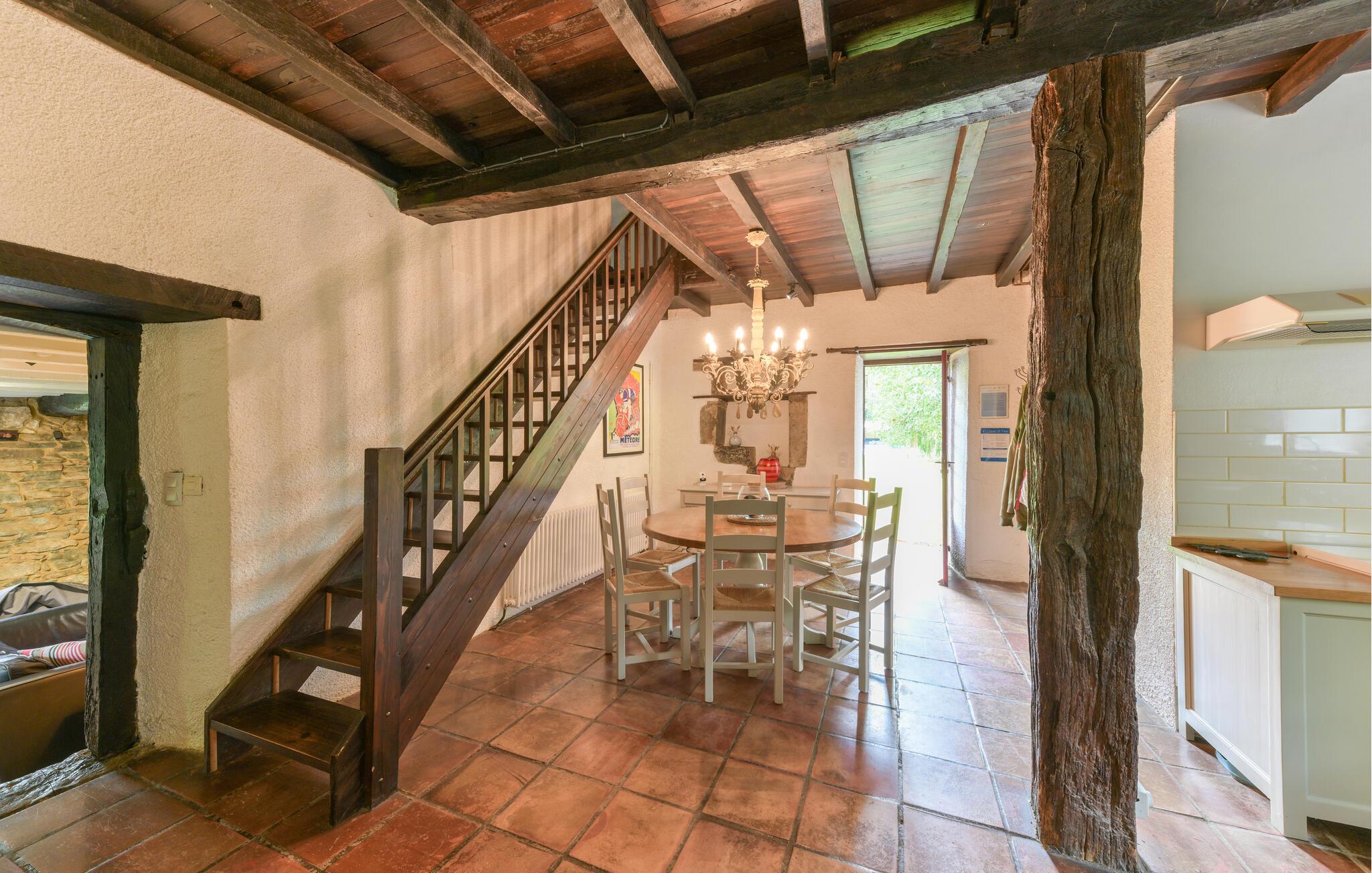 Ihr Ferienhaus liegt am Ende einer Schotterstraße und ganz ruhig. Die einzigen Laute, die Sie hören, kommen vom Bach, der auf dem Grundstück fließt und den Kühen, wenn Sie von den Bauern von einer Weide auf die nächste gebracht werden. Die freigelegten Steinmauern, die mächtigen Deckenbalken und der eindrucksvolle offene Kamin machen das Haus sehr gemütlich. Auf dem großen Grundstück werden Sie hauptsächlich Rasen finden, es ist von ausgewachsenen Bäumen umgeben und beherbergt eine überdachte Terrasse und daneben einen Pool, den Sie von Juni bis September benutzen können. Eine Toilette (WC und Waschbecken) im Obergeschoss. Nur über Schlafzimmer zugänglich.