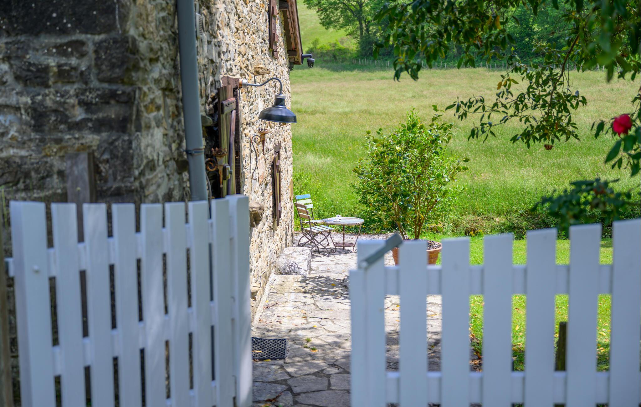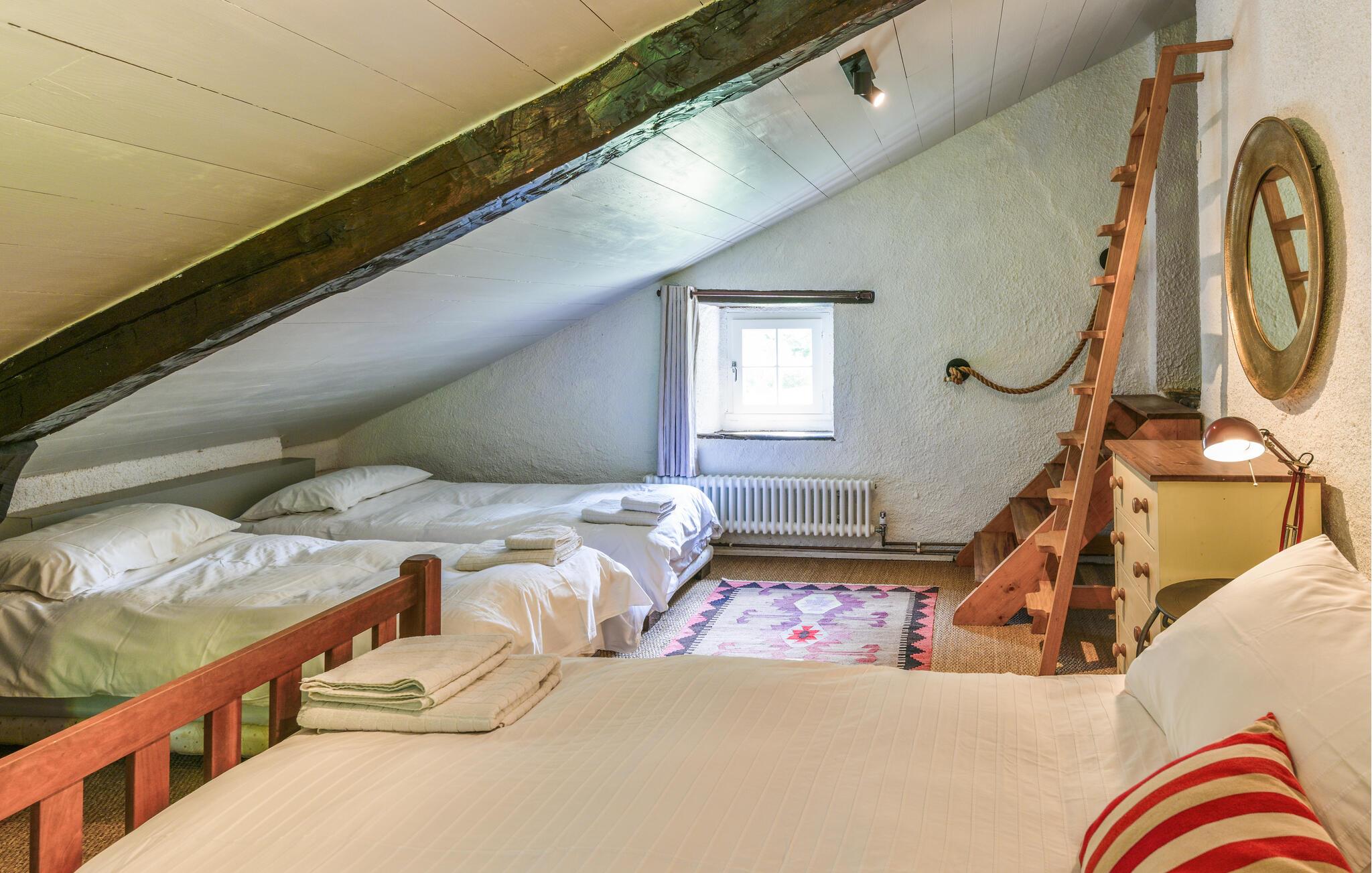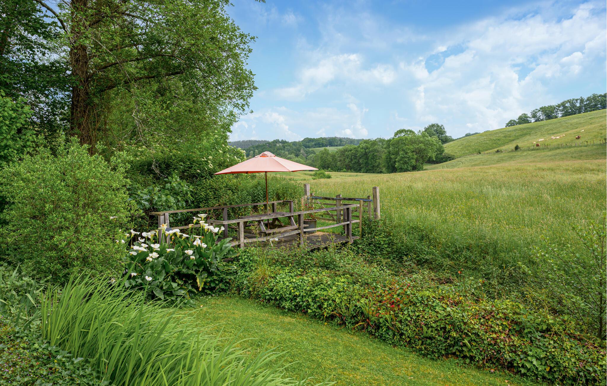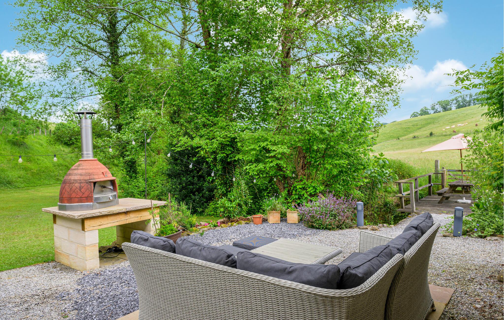 Ihr Ferienhaus liegt am Ende einer Schotterstraße und ganz ruhig. Die einzigen Laute, die Sie hören, kommen vom Bach, der auf dem Grundstück fließt und den Kühen, wenn Sie von den Bauern von einer Weide auf die nächste gebracht werden. Die freigelegten Steinmauern, die mächtigen Deckenbalken und der eindrucksvolle offene Kamin machen das Haus sehr gemütlich. Auf dem großen Grundstück werden Sie hauptsächlich Rasen finden, es ist von ausgewachsenen Bäumen umgeben und beherbergt eine überdachte Terrasse und daneben einen Pool, den Sie von Juni bis September benutzen können. Eine Toilette (WC und Waschbecken) im Obergeschoss. Nur über Schlafzimmer zugänglich.