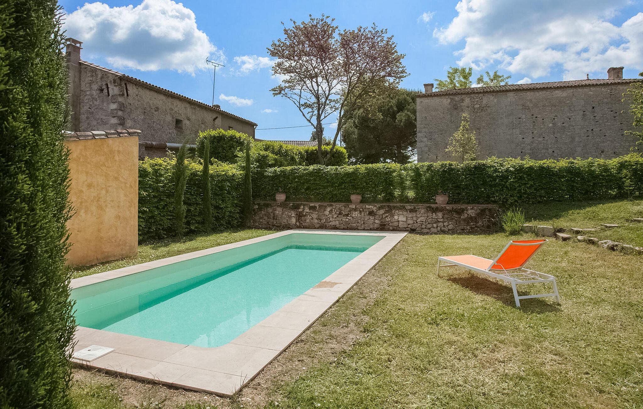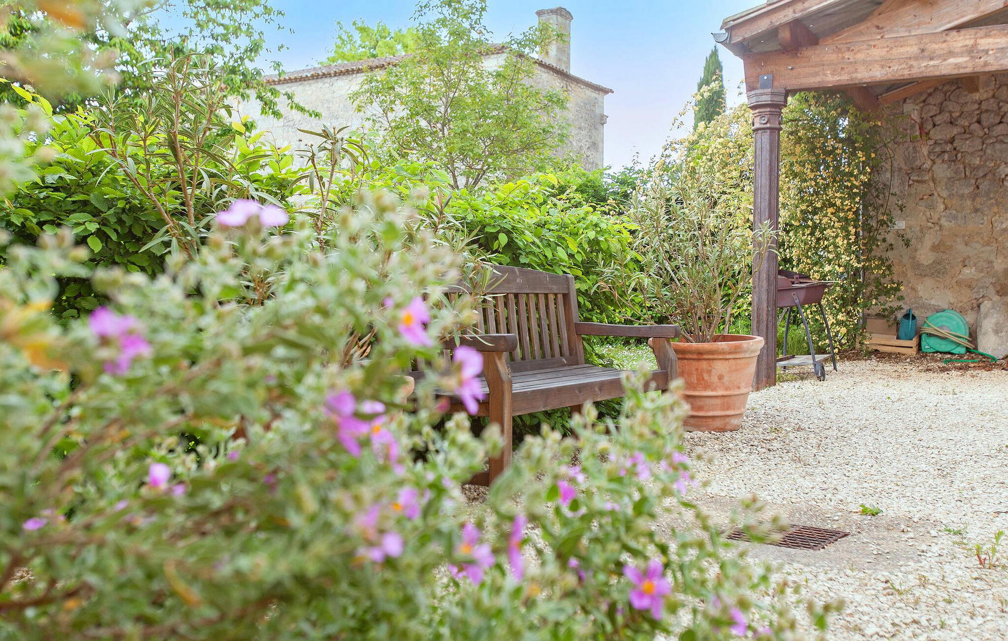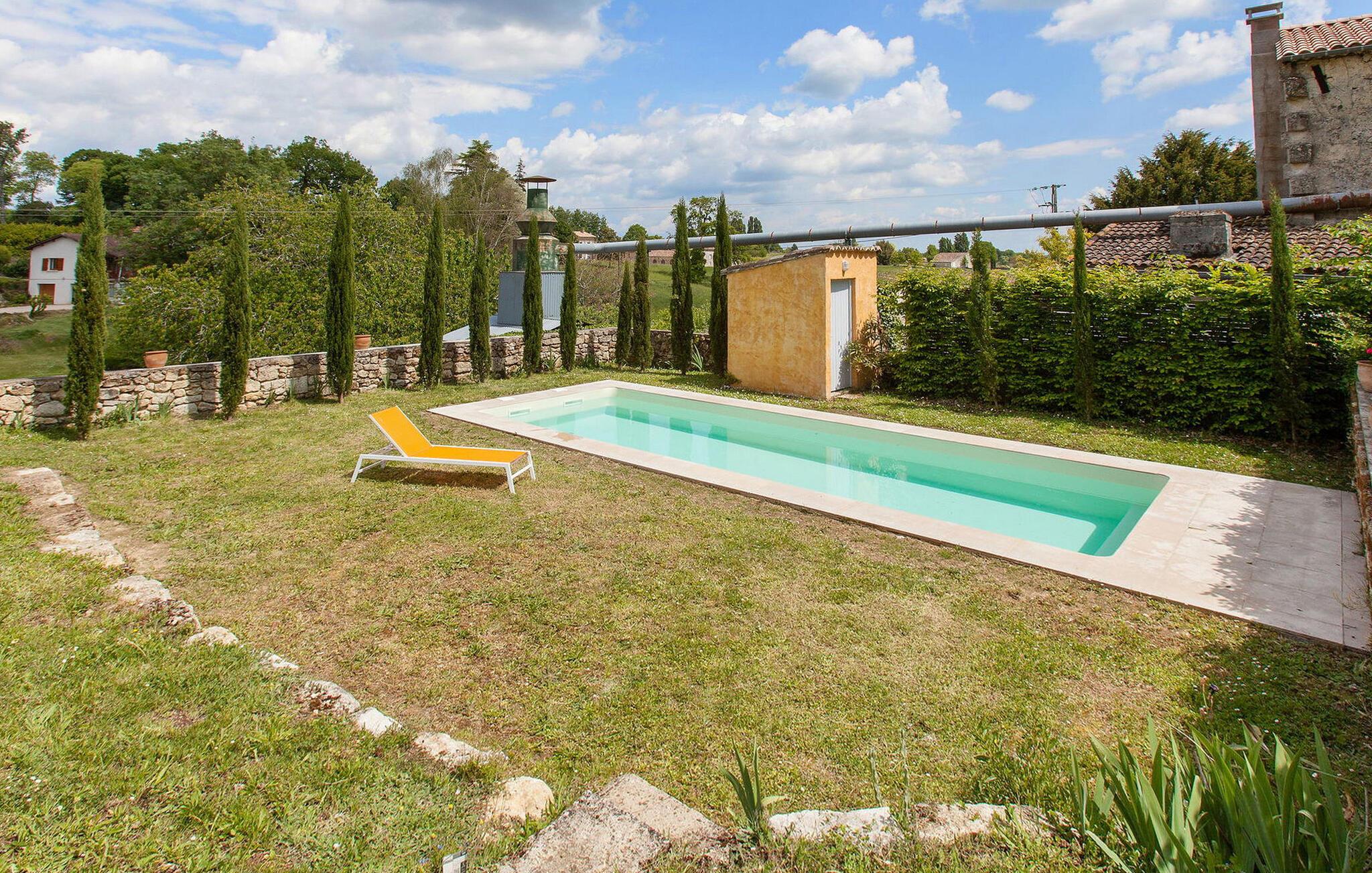 Dieses Ferienhaus in der Nähe von Saint Emilion in der Gironde ist ein komfortabler Rückzugsort. Im Erdgeschoss gibt es eine geräumige, voll ausgestattete Küche/Essbereich mit verschiedenen Geräten und einem Esstisch. Das Wohnzimmer verfügt über einen antiken Kamin und Unterhaltungsmöglichkeiten. Das Schlafzimmer und das Duschbad im Erdgeschoss sind für Personen mit eingeschränkter Mobilität zugänglich. Im Obergeschoss befinden sich drei weitere Schlafzimmer. Draußen runden ein umzäunter privater Pool und ein großer Garten mit Möbeln und einem Grill das Ambiente ab. Die Ferienwohnung befindet sich im kleinen und charmanten Dorf St. Cibard, 15 km östlich von St. Emilion, eingebettet rund um die romanische Kirche in einem Tal inmitten einer Weinberglandschaft. Zu besichtigen in der Nähe: Saint Émilion 15 km, Bordeaux 60 km, Zitadelle von Blaye 65 km. Viele architektonische Stätten, Kirchen, Klöster, die als historische Denkmäler eingestuft sind, in einem Umkreis von weniger als 50 km.