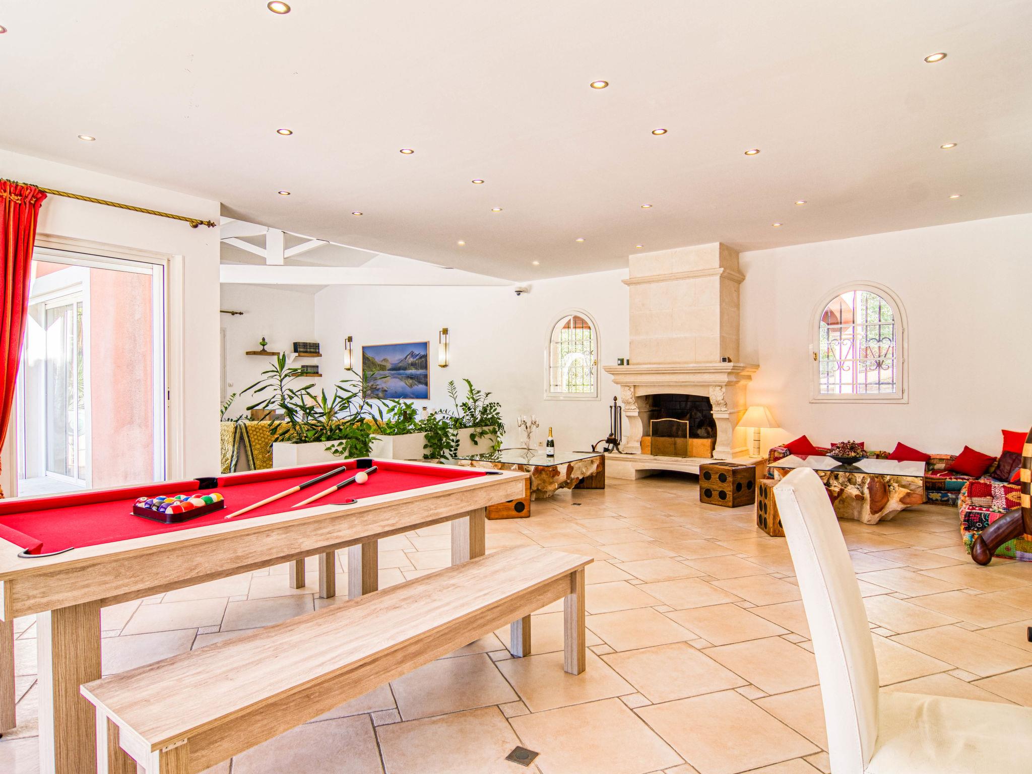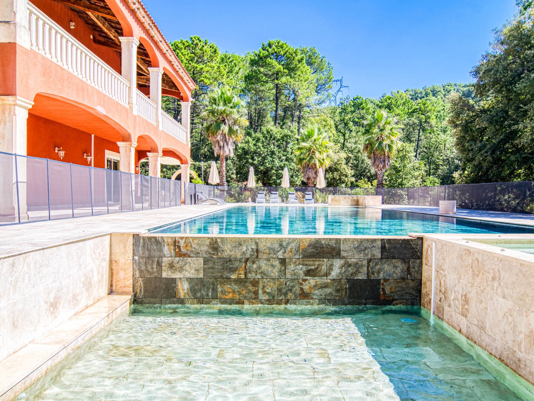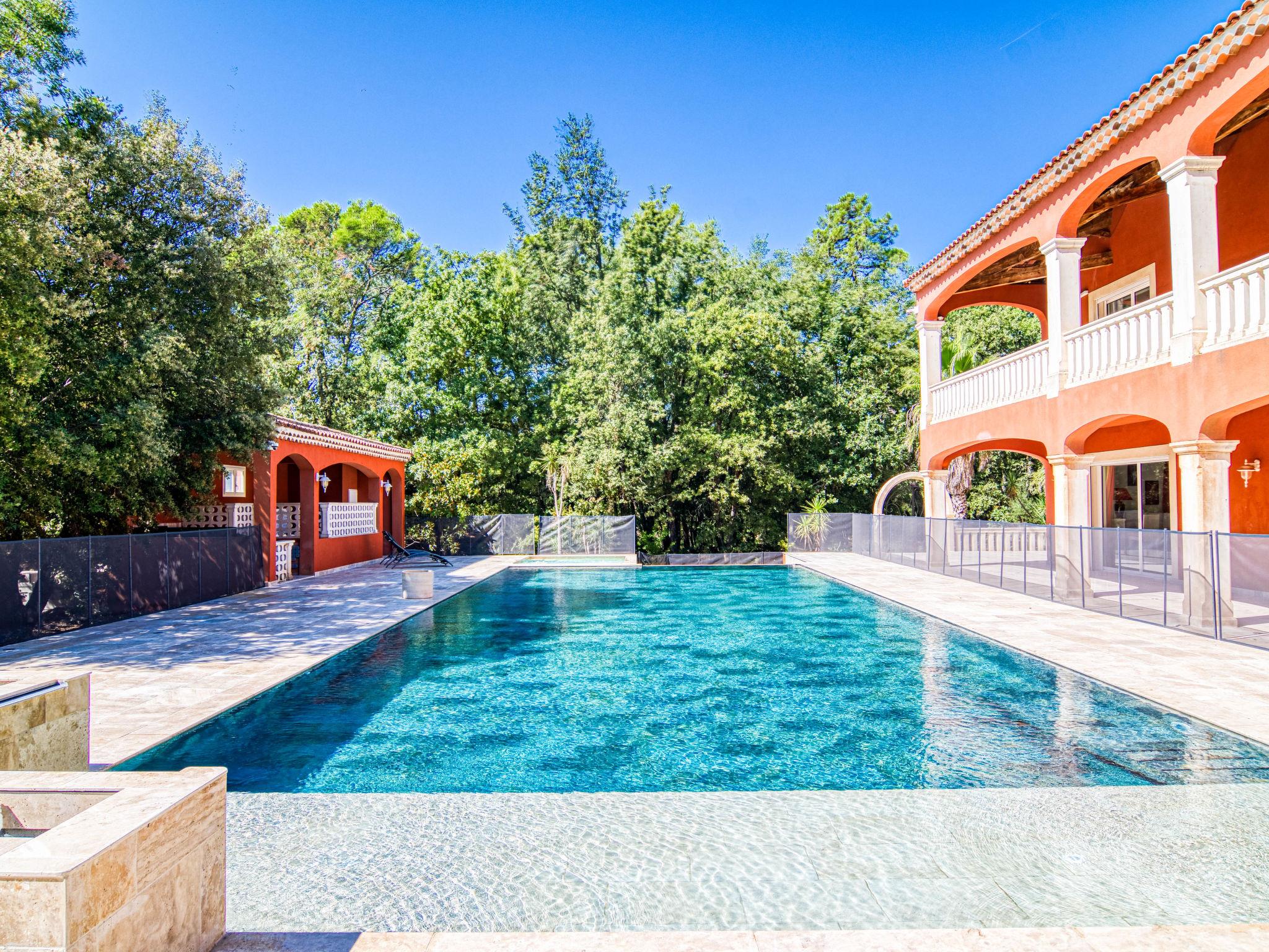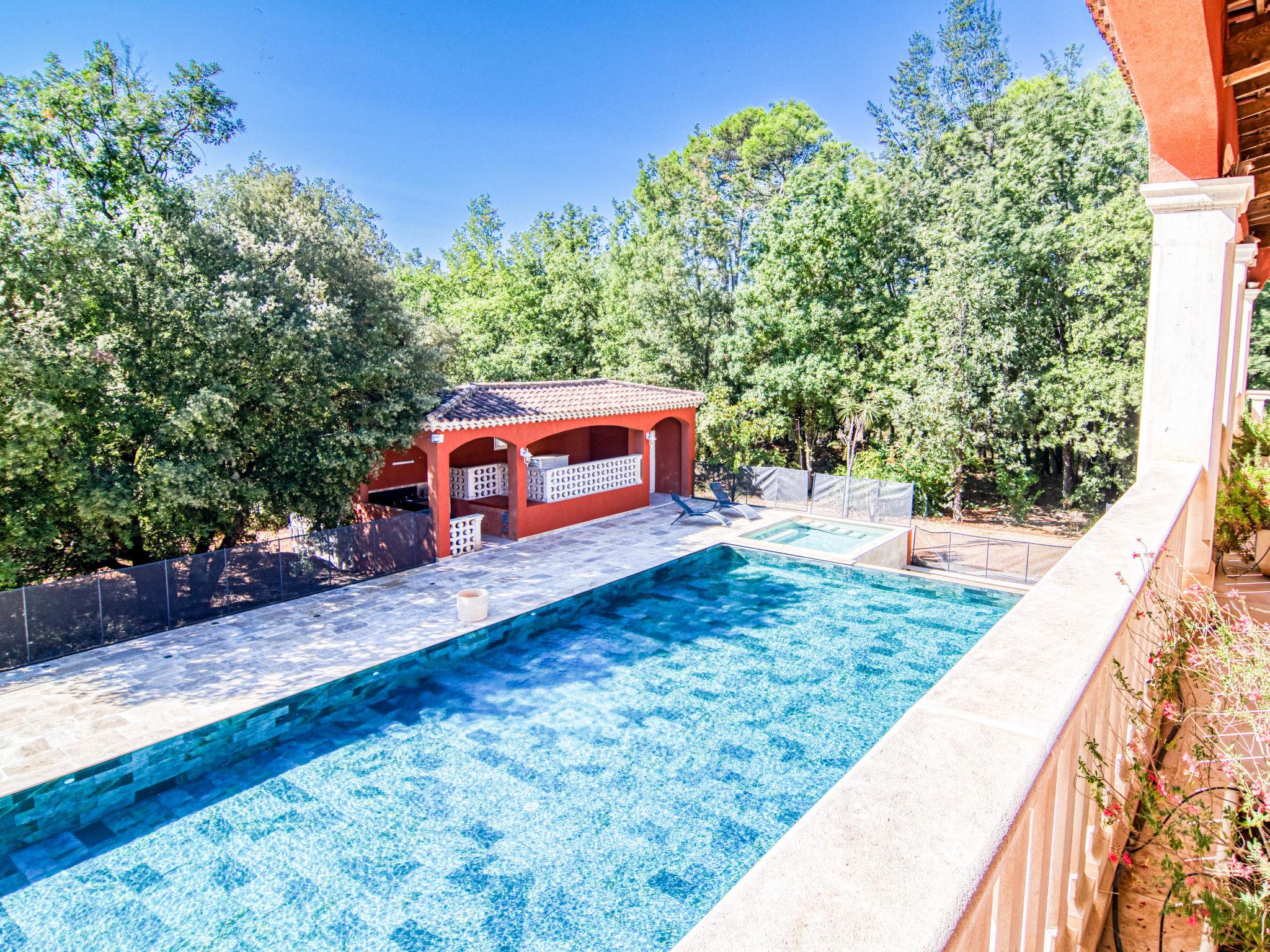 Very large, beautiful single-family house. 2.9 km from the centre of Méounes-les-Montrieux, 14 km from the centre of Rocbaron, 32 km from the centre of Hyeres, in the residential district, in the countryside. Private: property 3 ha (fenced), well-kept garden 3'000 m2, swimming pool angular, heated, fenced (20 x 8 m, depth 50 - 145 cm, seasonal availability: 01.Jan. - 31.Dec.) with salt-electrolysis pool-cleaning system. Paddling pool, hot tub, pool house with fridge, shower and WC. In the house: fitness room, billiard table. Shop 2.9 km, supermarket 12 km, restaurant 2.9 km, bakery 2.9 km, café 2.9 km, bus stop 2.5 km, railway station "Cuers-Pierrefeu" 20 km, sandy beach "Almanarre" 36 km. Golf course (18 hole) 26 km, riding stable 17 km. Nearby attractions: Iles de Porquerolles, Port Cros, Iles des Embiez, Circuit Paul Ricard. Hiking paths: Parc régional de la Sainte Baume. The owner does not accept any youth groups.