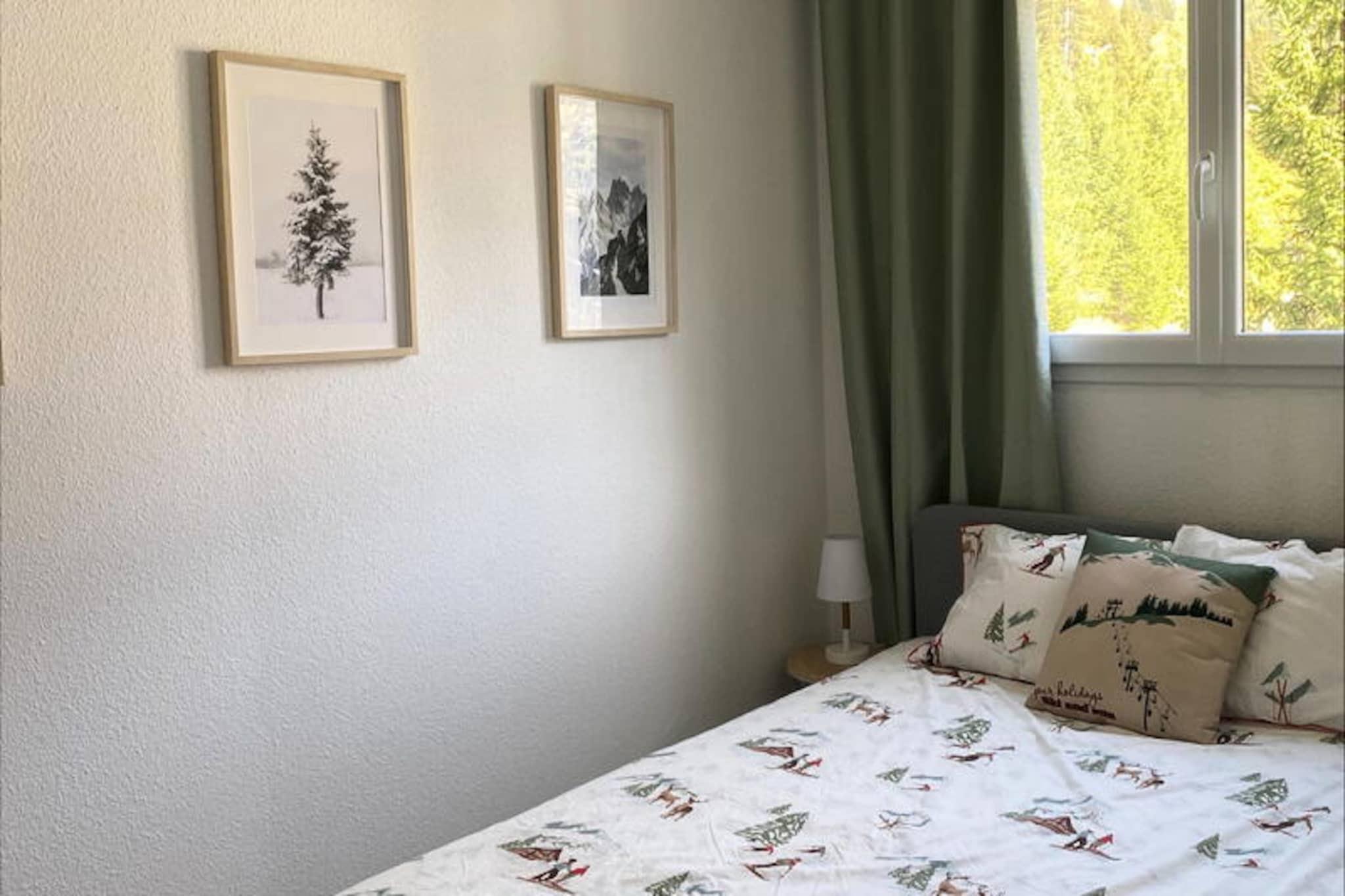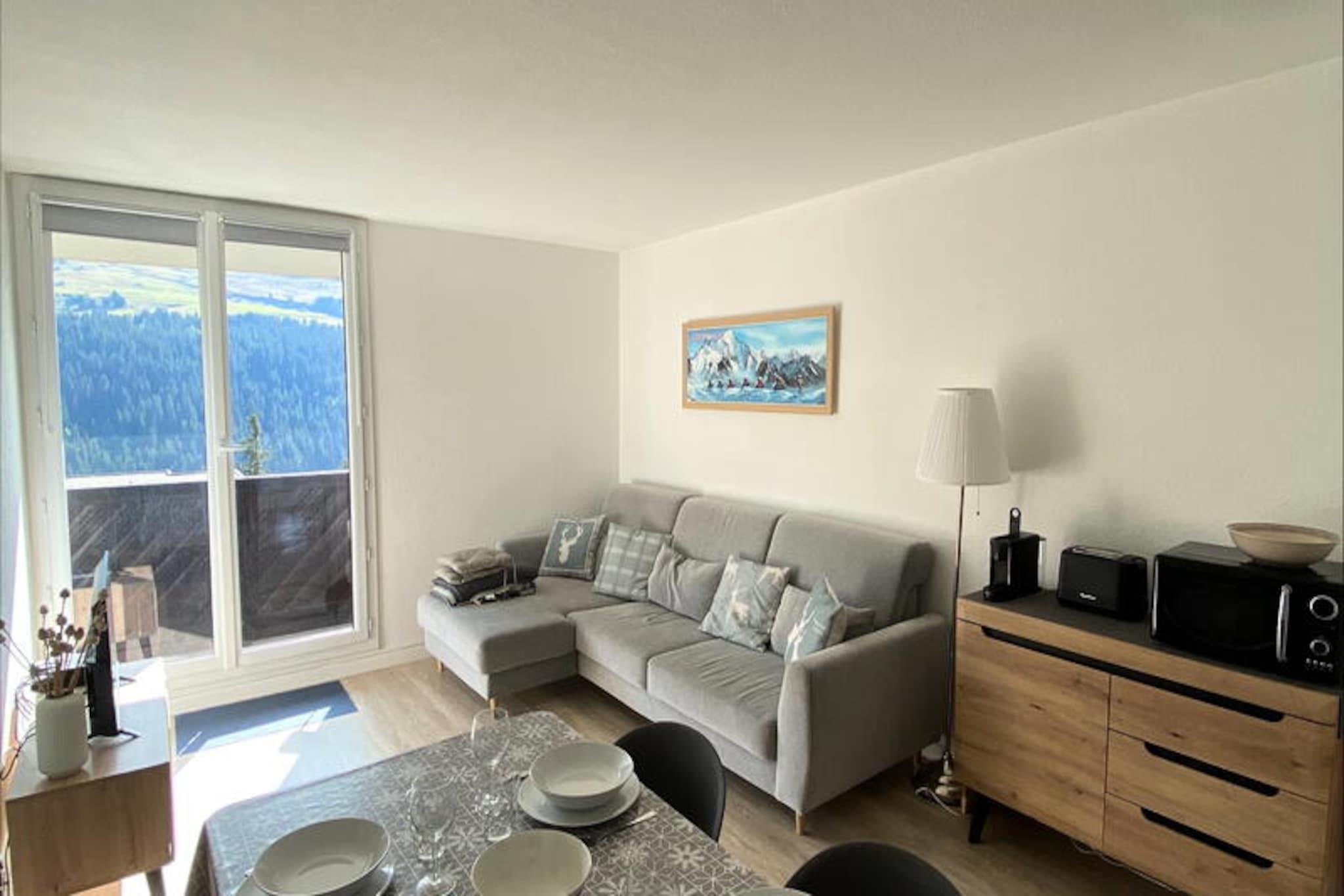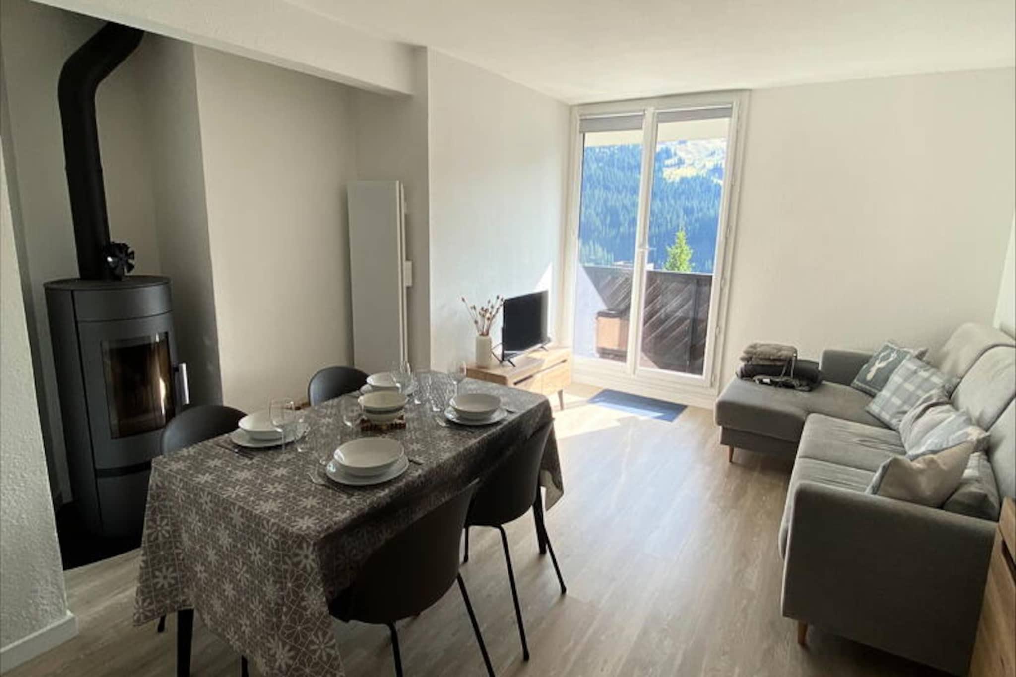 In the serene Flaine Forêt district, this beautifully renovated 3-room apartment offers a cozy alpine retreat just 150 meters from the Gérats chairlift and 500 meters from the slopes. With its south-facing balcony, wood-burning stove, and modern amenities, it’s the perfect base for your mountain adventures. Imagine waking up to the crisp mountain air, sipping your morning coffee on the balcony, and heading out for a day of skiing or hiking right at your doorstep. The nearby bus stop and shops, just 200 meters away, ensure convenience throughout your stay. \n\nThe apartment spans 48 m² and is thoughtfully designed to accommodate up to six guests. It features a warm and inviting living room with a flat-screen TV and a non-convertible sofa, a fully equipped kitchenette with induction hobs, an oven, microwave, dishwasher, and a Nespresso coffee machine for your morning brews. The sleeping arrangements include a double bed in the main bedroom, another double bed in a cozy windowless room, and a charming cabin with bunk beds, perfect for children over six. The modern shower room with a heated towel rail and a separate toilet add to the comfort. \n\nFor ski enthusiasts, the dedicated ski locker ensures your gear is always ready for action. In summer, the Flaine Summer Pass, included for stays of six nights or more, opens the door to a variety of exciting activities, making this property a year-round destination. Whether you’re here to carve the slopes, explore scenic hiking trails, or simply relax by the wood-burning stove, this apartment promises an unforgettable alpine escape. With its prime location and thoughtful amenities, it’s the ideal choice for families and friends seeking both adventure and relaxation in the heart of the French Alps.