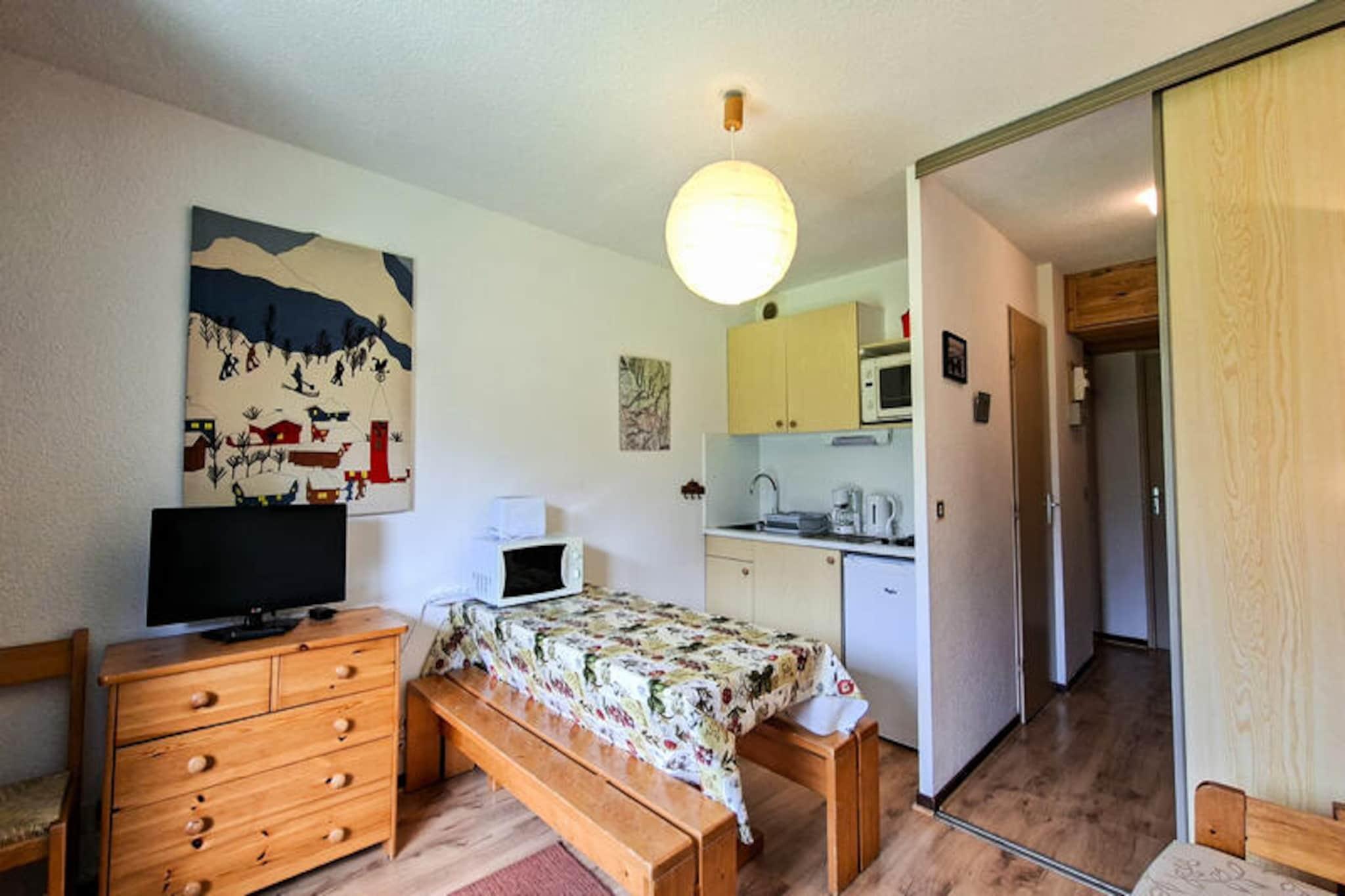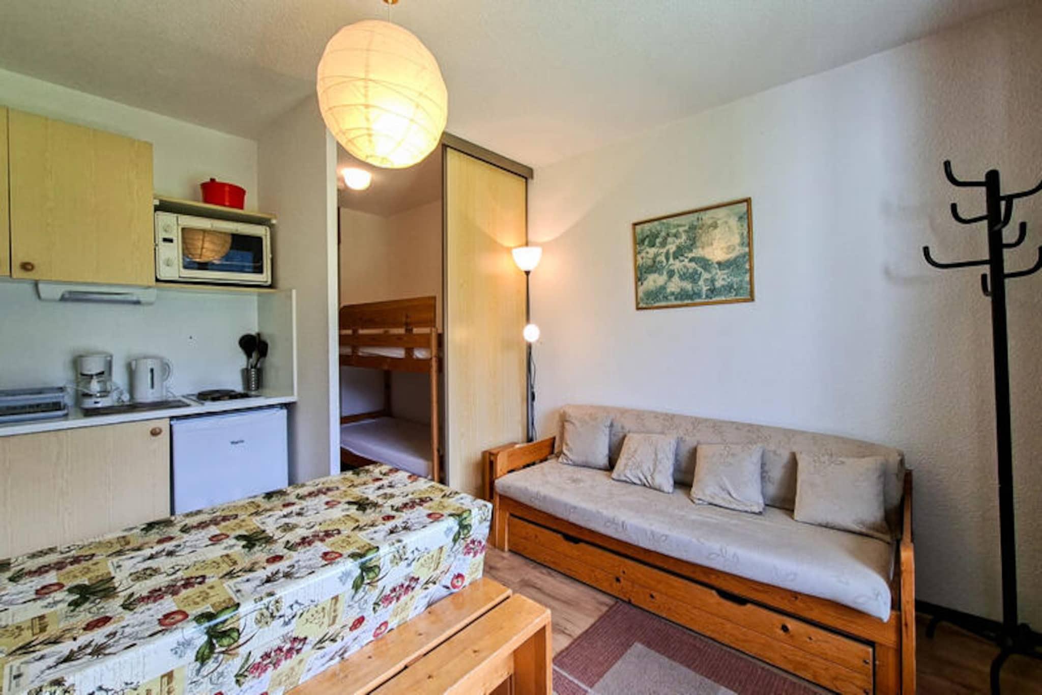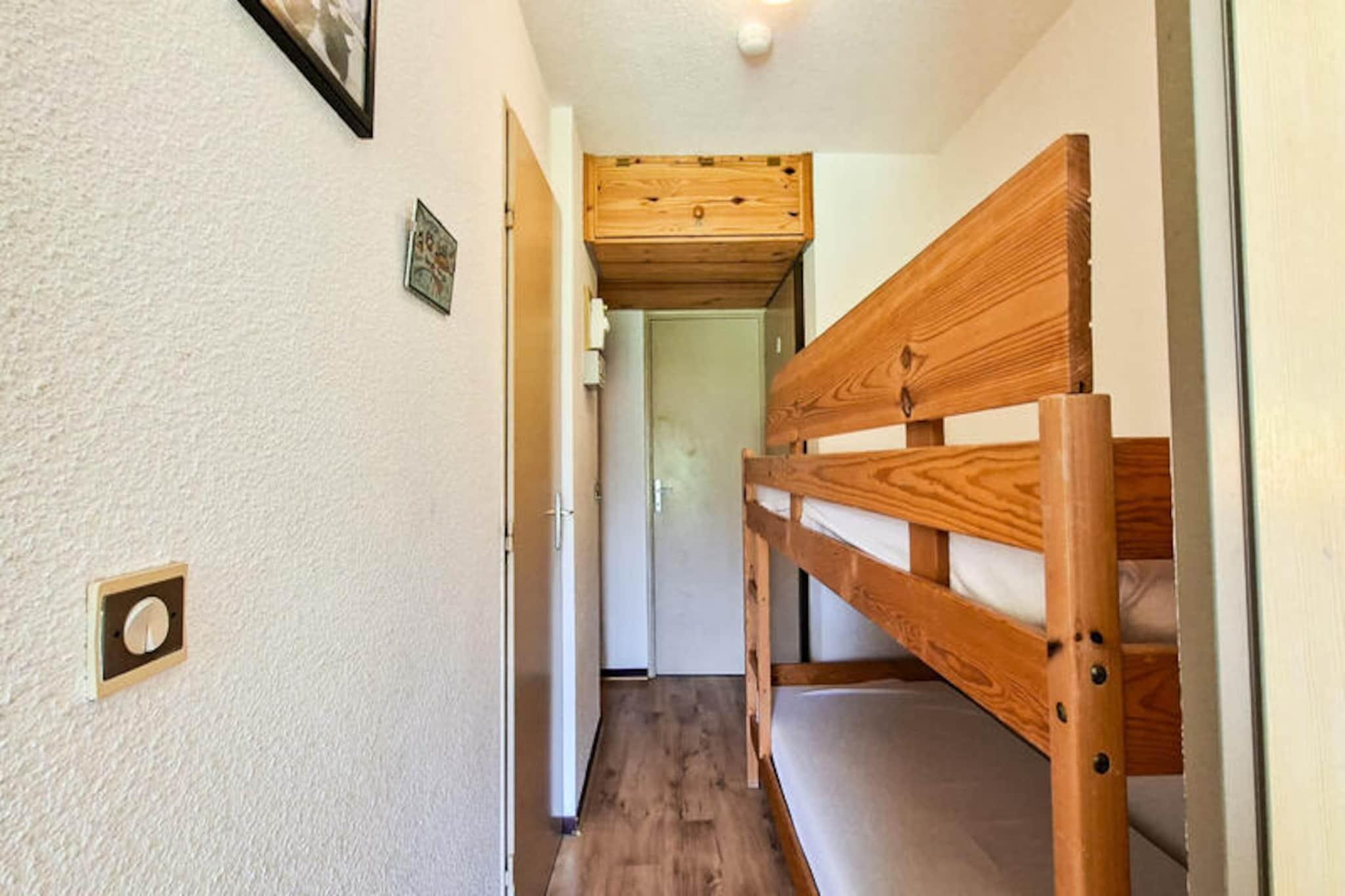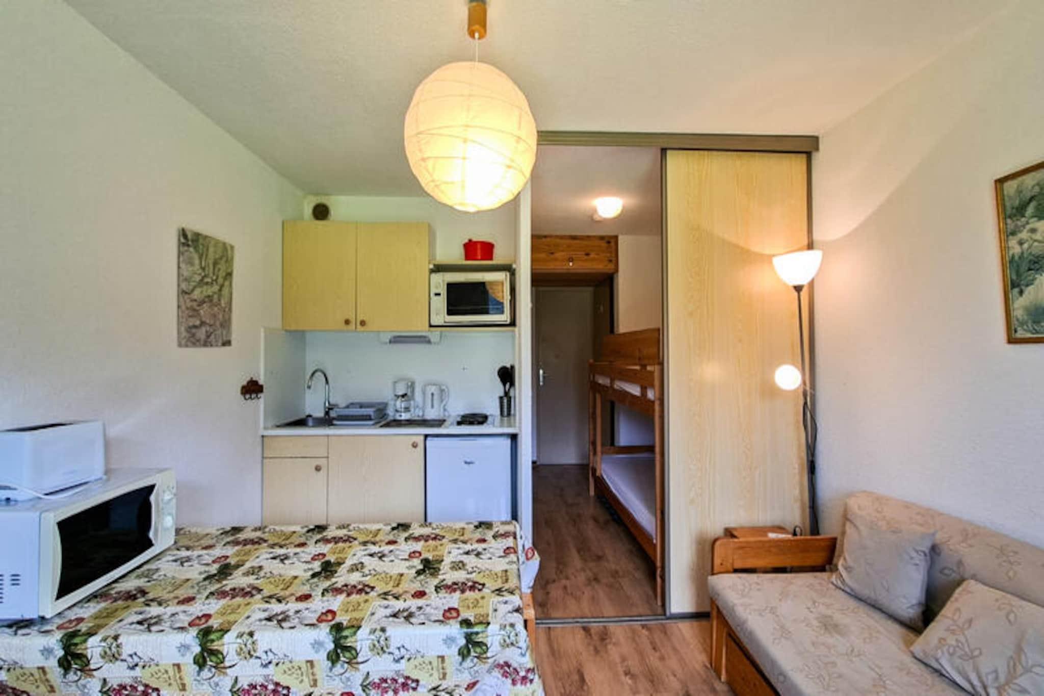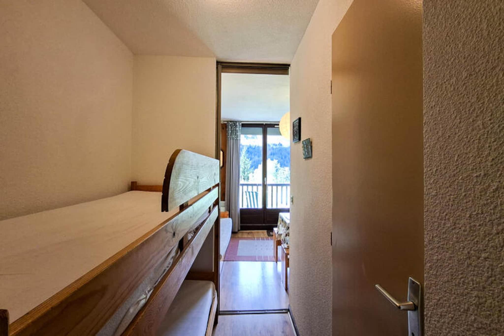 High in the serene French Alps, this charming studio cabin in Flaine Forêt offers a delightful retreat for adventurers and nature lovers alike. With its south-facing balcony overlooking the pristine mountain scenery, you’ll wake up to the crisp alpine air and the promise of thrilling days ahead. The residence is conveniently located just 250 meters from the slopes and ski school meeting points, making it an ideal base for winter sports enthusiasts. Shops and a bus stop are also within easy reach, ensuring everything you need is close at hand. \n\nDesigned to accommodate up to four guests, the studio features a cozy layout with a double bed in the cabin and bunk beds in the entrance area. The kitchenette is equipped with two electric hotplates, a microwave, and an oven, allowing you to prepare hearty meals after a day of skiing or hiking. Additional amenities include a flat-screen TV, a bathroom with a bathtub, and a separate toilet for added convenience. The south-facing balcony is the perfect spot to unwind and soak in the tranquil mountain views. Please note that the upper bunk is not suitable for children under six years old, and bed linen and towels are not provided. \n\nIn the summer, guests staying for six nights or more can enjoy the Flaine Summer Pass, which includes access to a variety of activities such as hiking, mountain biking, and cultural events. The area transforms into a vibrant hub of outdoor adventure, with trails that lead to breathtaking vistas and opportunities to explore the natural beauty of the Alps. \n\nWhether you’re seeking the thrill of the slopes or the serenity of alpine summers, this studio cabin in Flaine Forêt offers a cozy and convenient base for creating unforgettable memories in the heart of the French Alps.