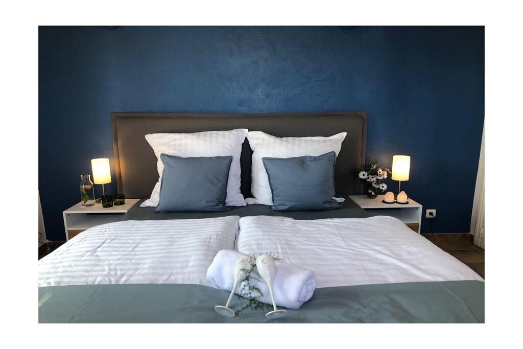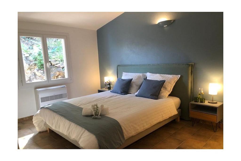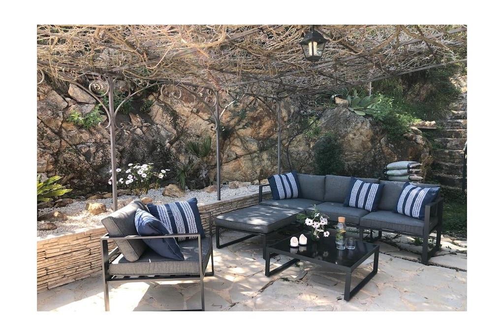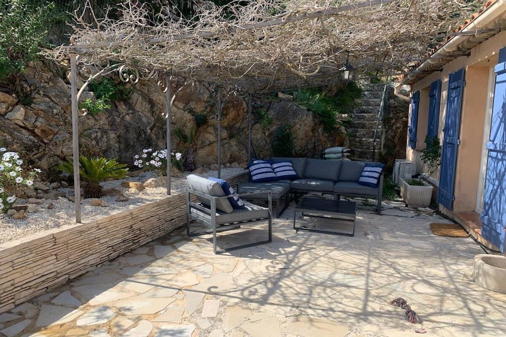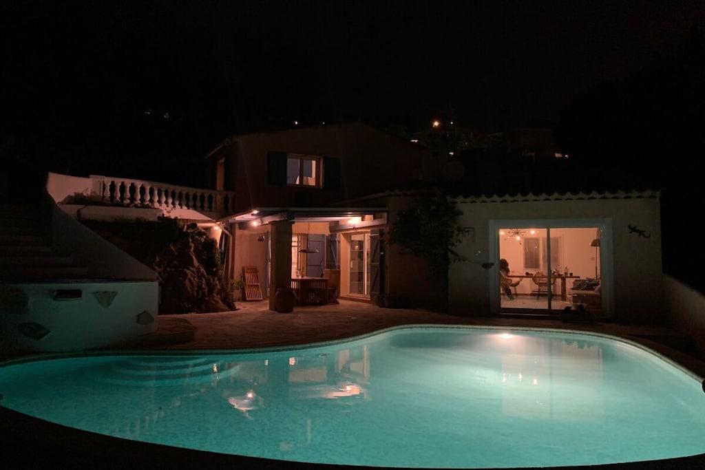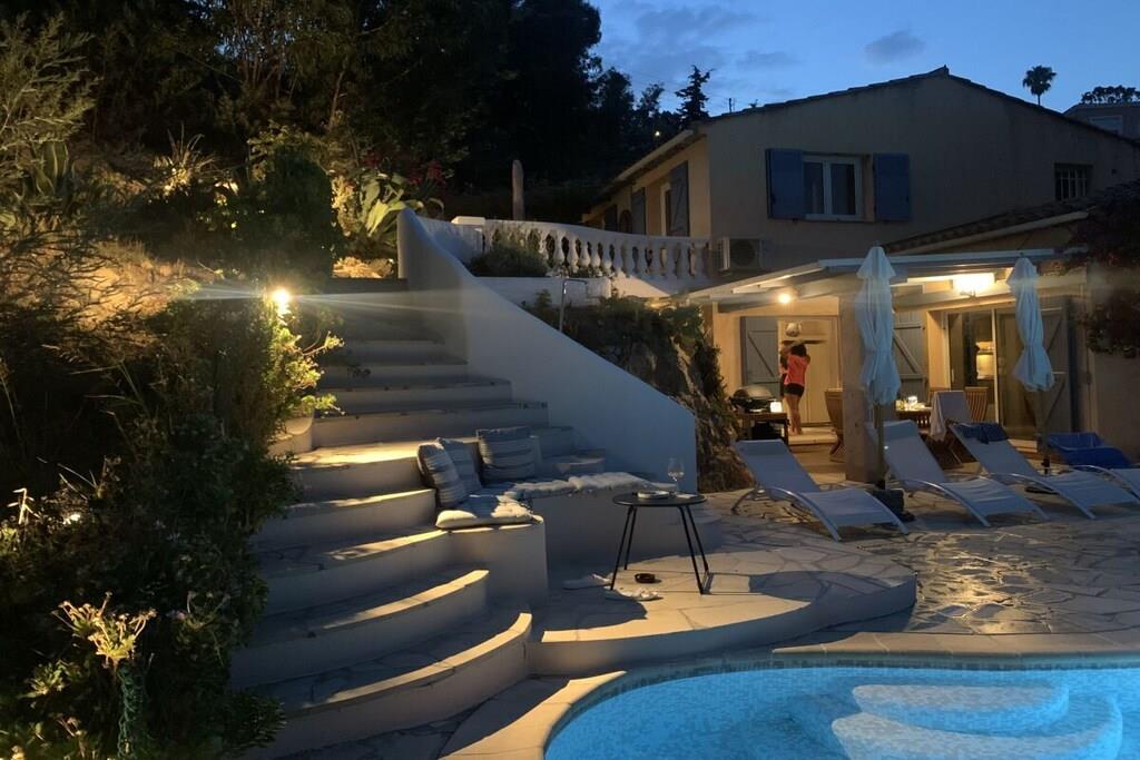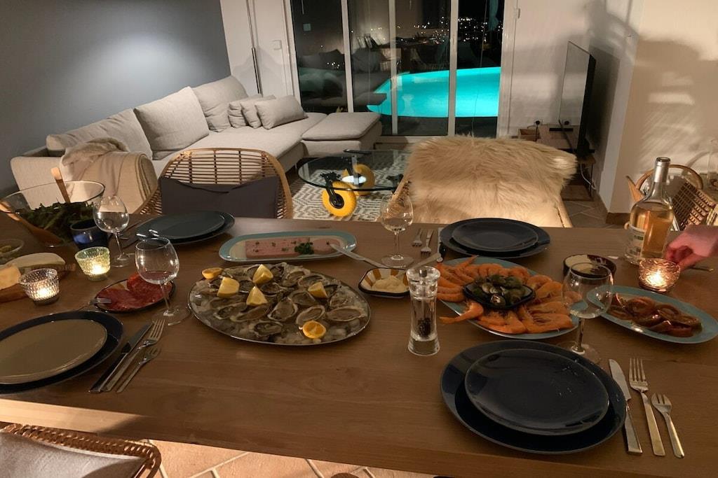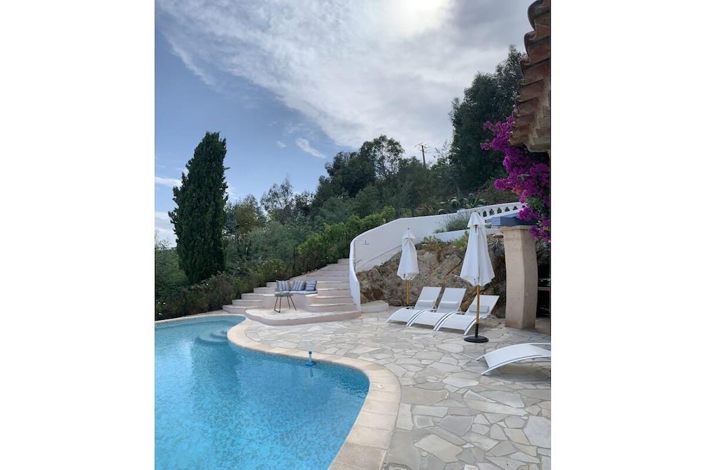 Villa La Roche is an absolute gem on the south coast of France, right near Cannes. Whether you're relaxing in the living room, enjoying French delicacies in the indoor or outdoor dining area, or lounging on the upper terrace, your gaze will always be drawn to the infinity pool and the beautiful view of the sea and the Bay of Cannes. The spacious house is ideal for a large family, two couples and their children, or a multi-generational getaway with grandma and grandpa. The house is perfectly situated in the hills of Mandelieu-La Napoule. It's a five-minute drive or a 15-minute walk from the village of Capitou, where you can buy your baguette from the bakery, enjoy a great lunch or dinner at Bistro Joseph, or simply pick up a few essentials at the supermarket or pharmacy. Another five minutes' drive and you're at the beach, where you can choose from a huge selection of restaurants near the beach or right on the beach. You have a huge selection of highlights nearby, including St. Tropez, Monaco, Cannes, and Nice. Alternatively, you can simply relax in the house, swim, read, or simply watch your Netflix series on the smart TV. There are also beautiful walks above the house in the forest/nature reserve.
