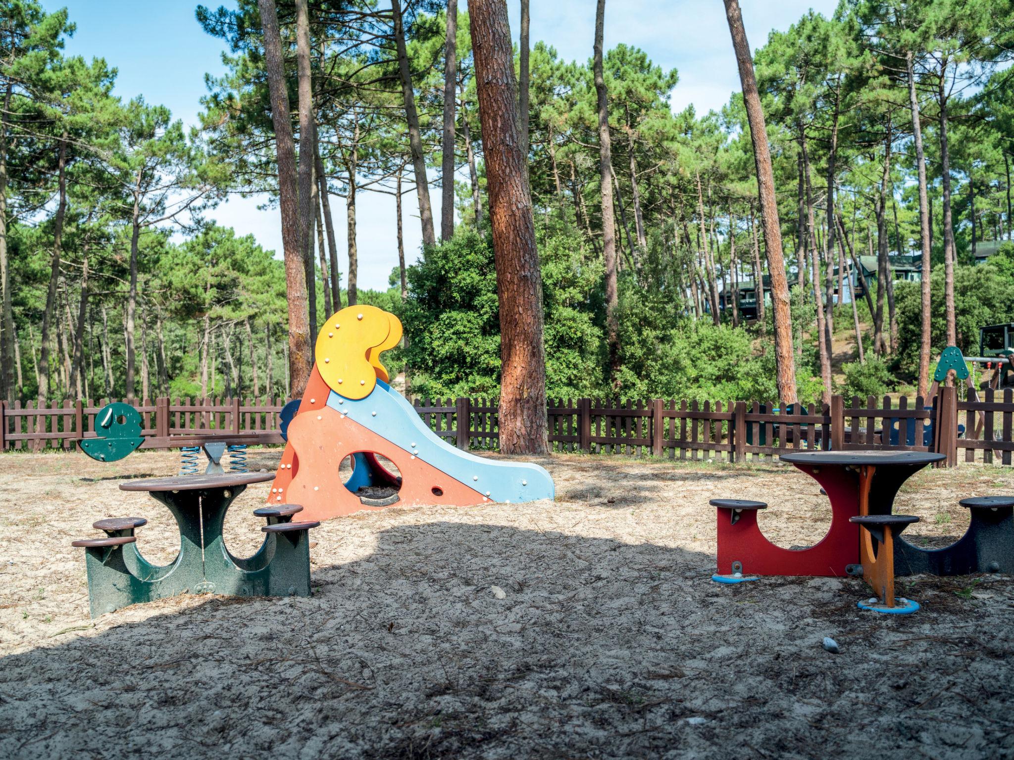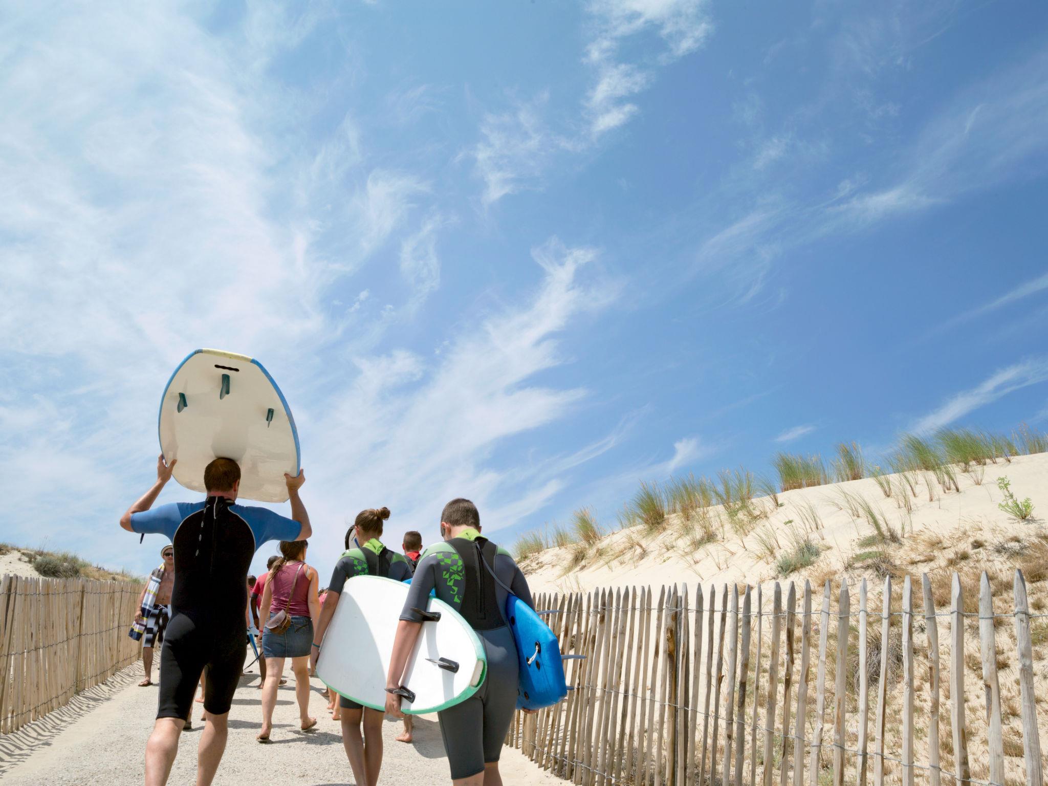 Maubuisson 5 km from Carcans-Plage: Simple holiday village "Les Cavales". 2.5 km from the centre of Maubuisson, 5 km from the centre of Carcans-Plage, 14 km from the centre of Lacanau-Océan, in a quiet position, 5.5 km from the sea, 2.5 km from the lake, 2.5 km from the beach, in the woods. For shared use: swimming pool fenced (240 m2, seasonal availability: 01.Jul. - 31.Aug.). WC in the pool area, children's pool, outdoor shower, table tennis, boccia, volleyball court, children's playground. In the complex: reception, washing machine, tumble dryer (for shared use, extra). Parking. Shop 2.5 km, supermarket 11 km, restaurant 2.5 km, sandy beach "Carcans-Plage" 5.5 km, bathing lake "Maubuisson" 2.5 km. Golf course (18 hole) 15 km, surf school 5.5 km, sailing school 2 km, walking paths from the house 10 m, cycle lane 200 m. Nearby attractions: Pauillac (route des vins) 40 km, Bordeaux 60 km, Soulac / Cap-Ferret 70 km, Royan (par le bac) 80 km. Please note: car-free holiday complex. Loading and unloading of baggage is possible at the holiday house. The photograph shows a typical example.