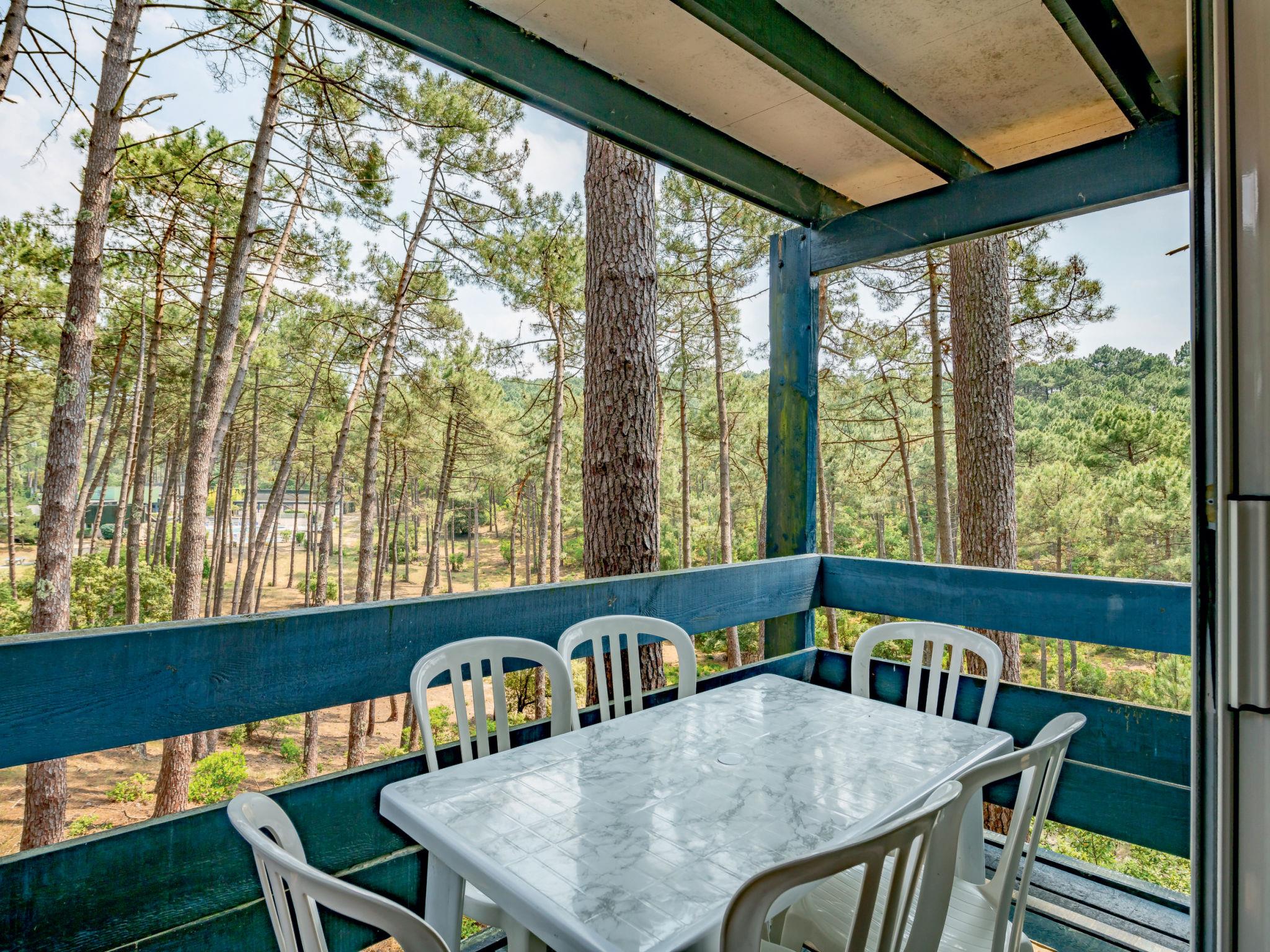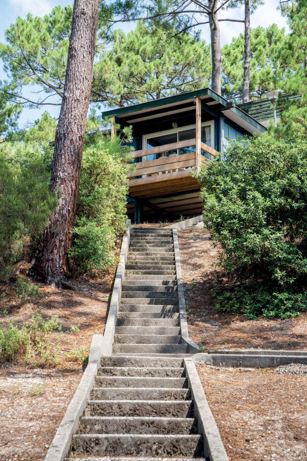Maubuisson 5 km from Carcans-Plage: Simple holiday village "Les Cavales". 2.5 km from the centre of Maubuisson, 5 km from the centre of Carcans-Plage, 14 km from the centre of Lacanau-Océan, in a quiet position, 5.5 km from the sea, 2.5 km from the lake, 2.5 km from the beach, in the woods. For shared use: swimming pool fenced (240 m2, seasonal availability: 01.Jul. - 31.Aug.). WC in the pool area, children's pool, outdoor shower, table tennis, boccia, volleyball court, children's playground. In the complex: reception, washing machine, tumble dryer (for shared use, extra). Parking. Shop 2.5 km, supermarket 11 km, restaurant 2.5 km, sandy beach "Carcans-Plage" 5.5 km, bathing lake "Maubuisson" 2.5 km. Golf course (18 hole) 15 km, surf school 5.5 km, sailing school 2 km, walking paths from the house 10 m, cycle lane 200 m. Nearby attractions: Pauillac (route des vins) 40 km, Bordeaux 60 km, Soulac / Cap-Ferret 70 km, Royan (par le bac) 80 km. Please note: car-free holiday complex. Loading and unloading of baggage is possible at the holiday house. The photograph shows a typical example.
