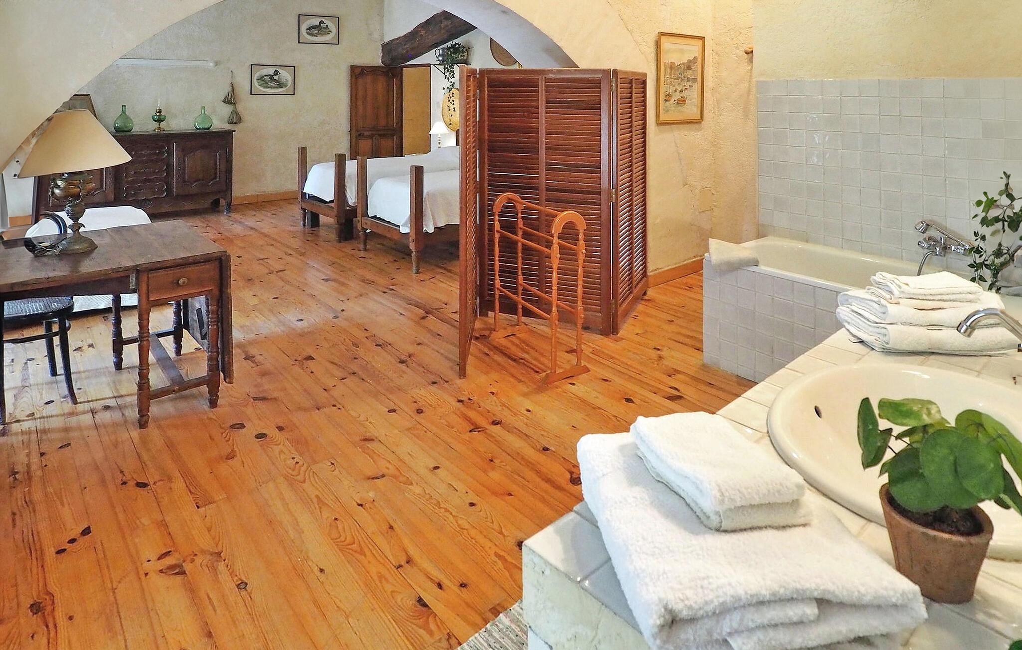 Eingebettet im ruhigen Tal der Baux de Provence bietet diese authentische Ölmühle eine charmante Ferienunterkunft. Auf einem Olivenanbaugebiet gelegen, gibt es einen gemeinsamen Außenpool. Das Erdgeschoss verfügt über eine Küche mit Familienessbereich und einem Innengrill im Kamin, ausgestattet mit Holz, ein großzügiges Schlafzimmer mit eigenem Duschbad und darüber hinaus ein einladendes Wohnzimmer mit bequemen Sitzgelegenheiten, einem Billardtisch usw ein Klavier. Im Obergeschoss führt ein geräumiger Flur zu einem weiteren Schlafzimmer. Zwei miteinander verbundene Schlafzimmer teilen sich ein Badezimmer und sind ideal für kleine Kinder oder Jugendliche. Zu den Außenbereichen gehört ein privater Innenhof mit einem herrlichen Brunnen, in dem Sie Ihr Frühstück genießen können. Der Weg daneben ist ausschließlich den Bewohnern der Immobilie vorbehalten. Zugang zu einem Gemeinschaftspool mit Sicherheitsalarm, Sonnenliegen und Zugang zum Pool über das Bauernhaus des Eigentümers sind möglich. Wichtige Punkte, die Sie beachten sollten: Der Verleih ist Teil eines aktiven Olivenölunternehmens, das hochwertiges AOC-Öl herstellt. Der Olivenbaumschnitt im März und die Ernte im November und Dezember gehören zur Routine. Kleinkindern wird in der Nähe des Hofbrunnens eine strenge Aufsicht empfohlen.