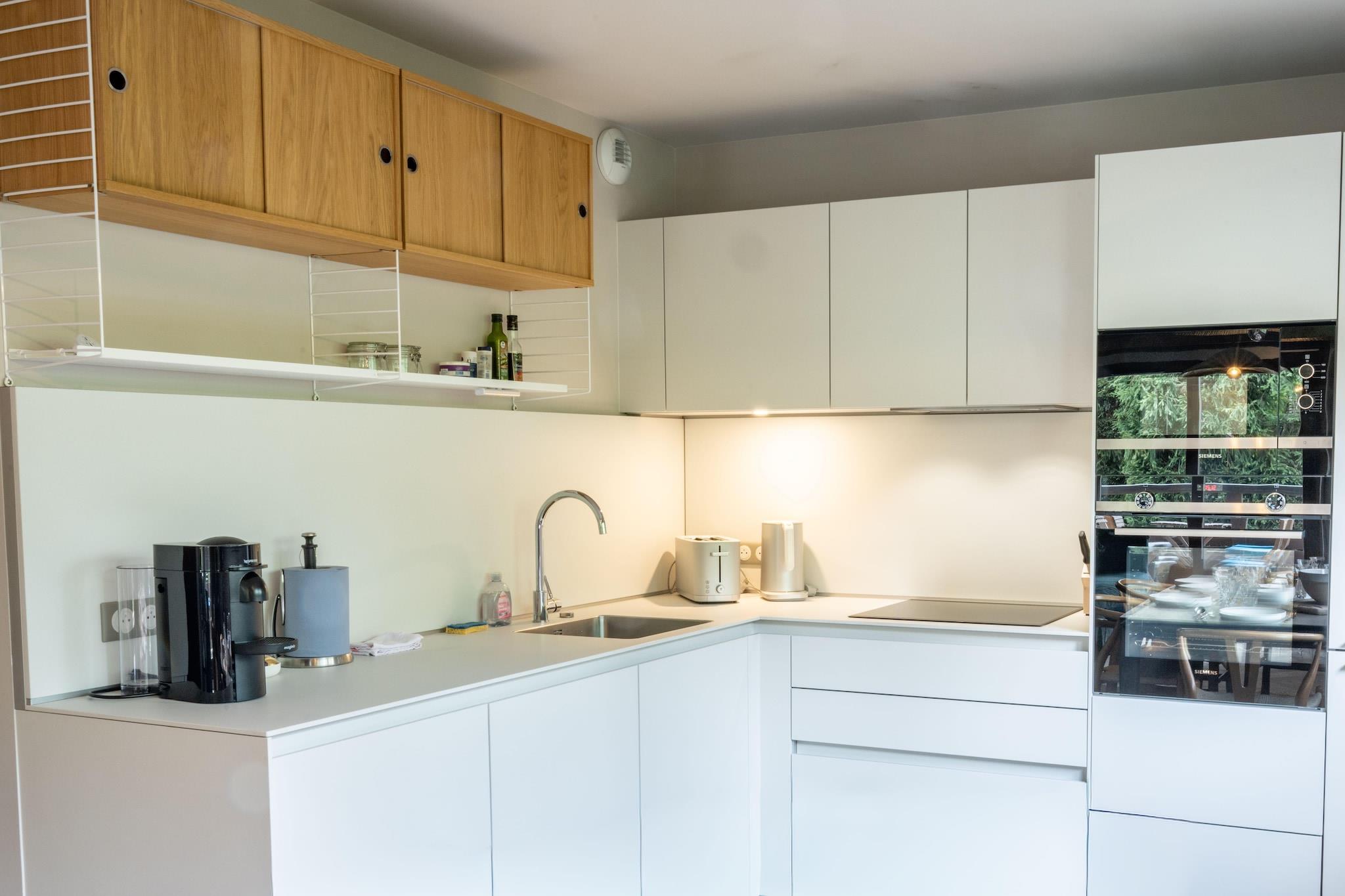 On the 1st floor: (Living room(TV), Kitchen(dining table, electric kettle, toaster, coffee machine, microwave, dishwasher, fridge, freezer, heating, dishes and cutlery, Cooking basics, Baking sheet, Wine glasses), bedroom(Queen Bed), bedroom(single bed, bunk bed), bathroom(shower), bathroom(bath tub, shower, toilet), toilet(toilet)) Bed Linen, Hot Water, Wardrobe, First Aid, TV, air conditioning, iron, hairdryer, body soap, Dedicated workspace, heating, Carbon monoxide detector, Cleaning products, Coffee, Downtown, Extra pillows and blankets, Room-darkening shades, Shower gel