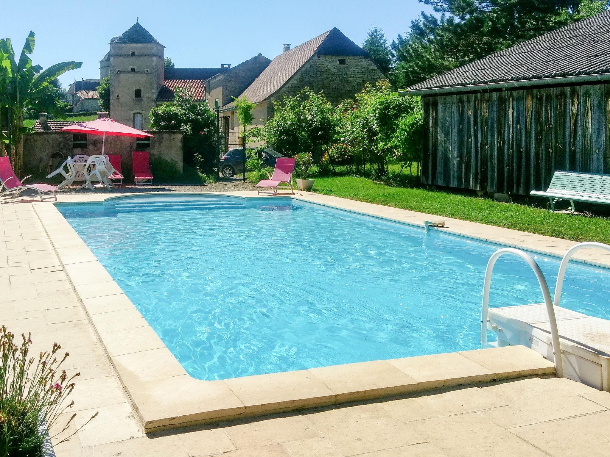 Rustic, historical farmhouse "Le Mas de Serre", semi-detached, surrounded by meadows, fields and vineyards. In a hamlet 5 km from the centre of Mercuès, 4 km from the centre of Espère, 8 km from the centre of Cahors, in a quiet position, 6 km from the lake. Private: natural state property 1'000 m2 (fenced), courtyard, swimming pool fenced (10 x 5 m, seasonal availability: 01.Jan. - 31.Dec.) with internal staircase and alarm system. Terrace, garden furniture. Stepped path to the house. Parking at the house on the premises. Supermarket 4 km, bus stop "Pont de campagne,Cahors" 10 km, bathing lake "Lac vert à Catus" 6 km.