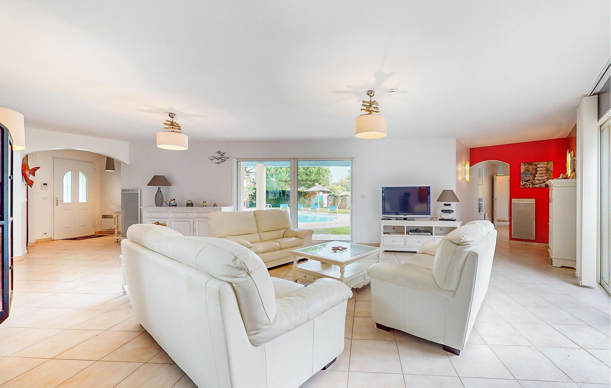 Draußen erwartet Sie ein großzügiger Swimmingpool mit weitläufigen Terrassenbereichen, ideal zum Sonnenbaden, Schwimmen und Entspannen mit einem kühlen Getränk. Verbringen Sie hier entspannte Stunden und gesellige Abende unter freiem Himmel.