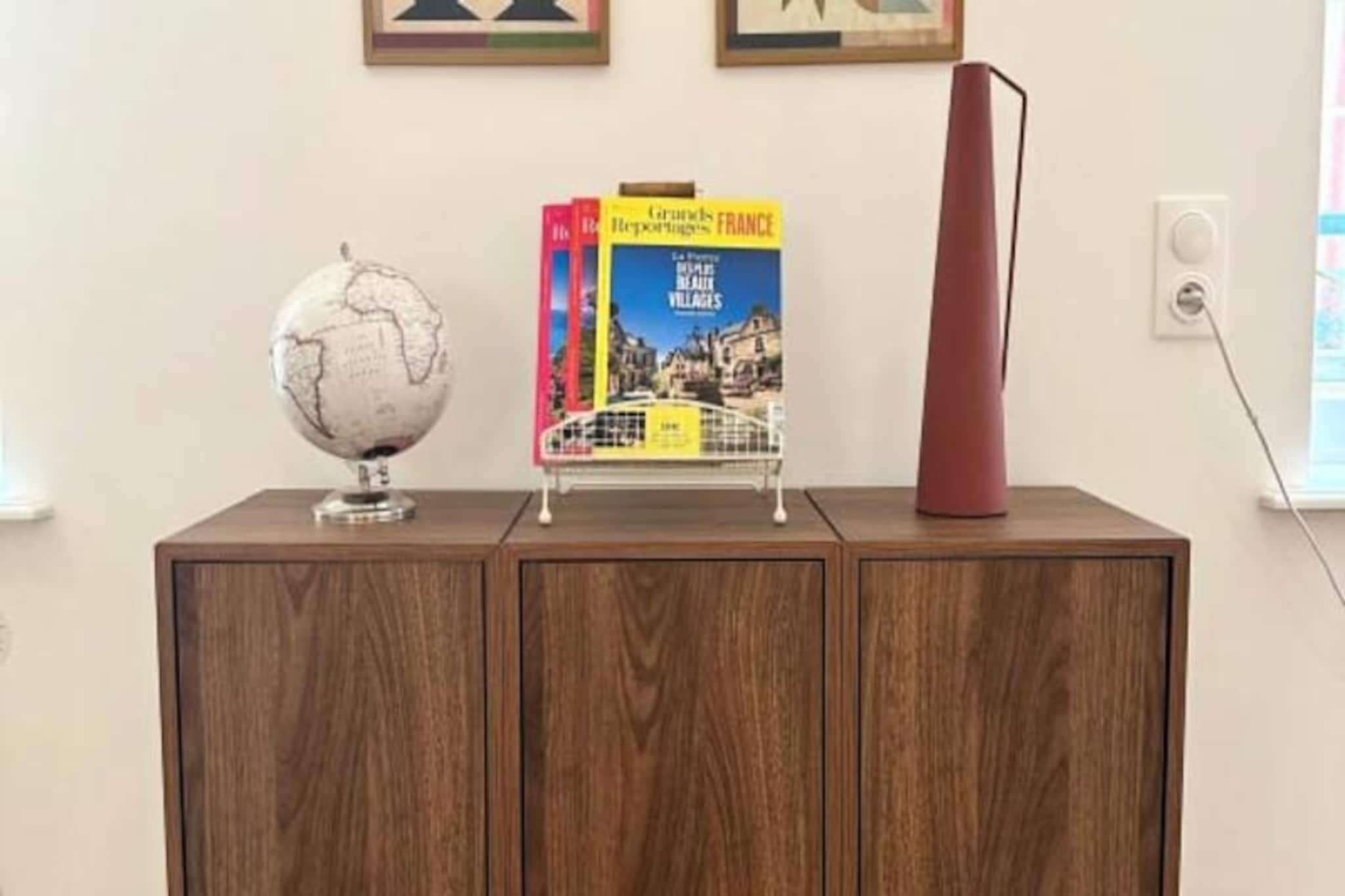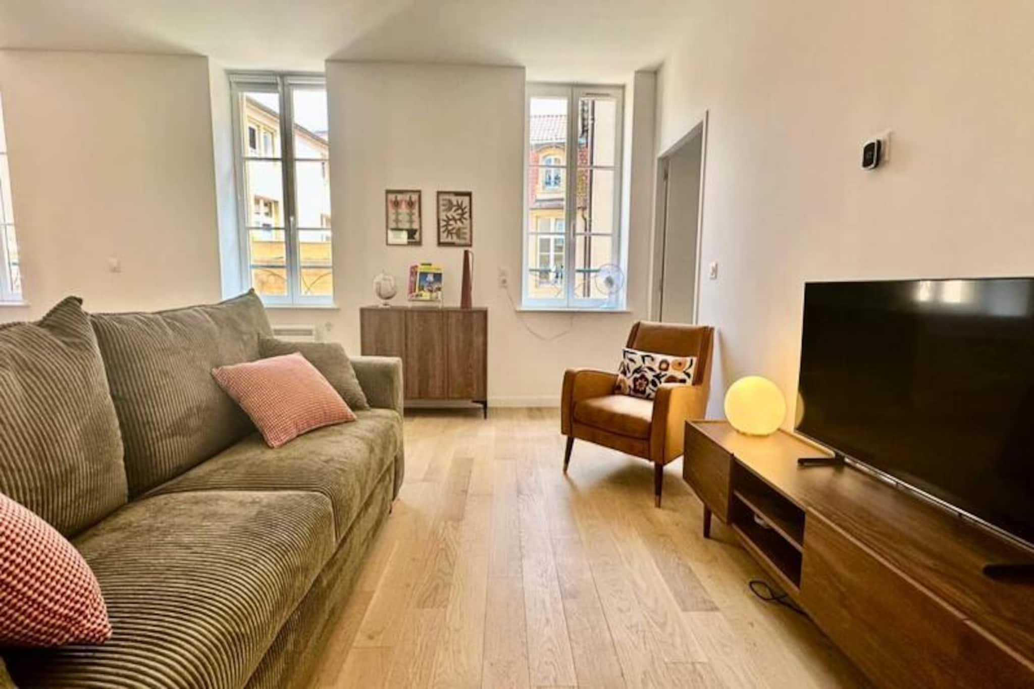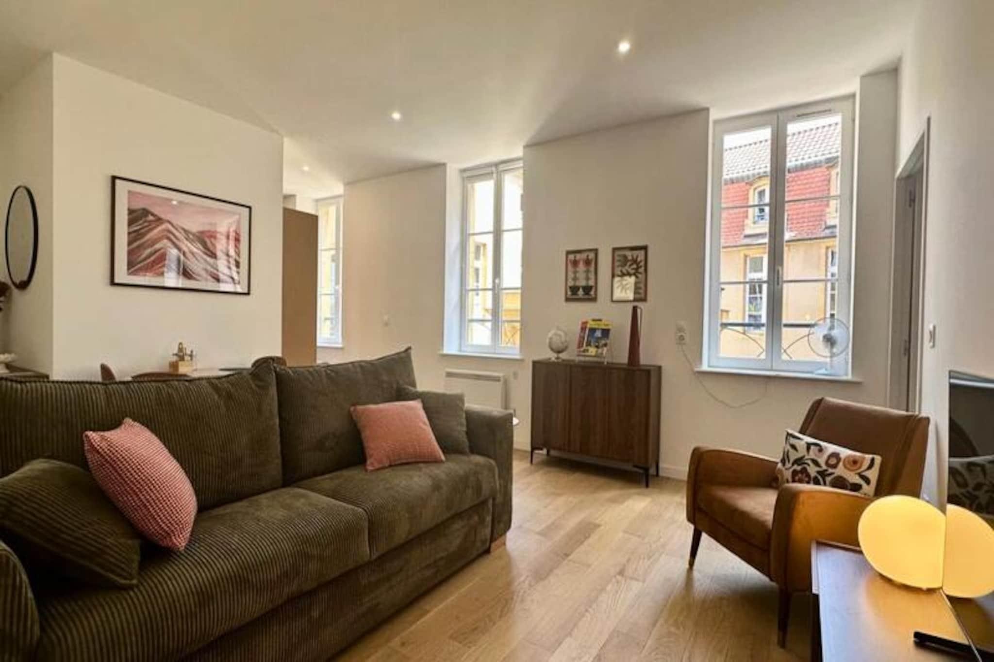 In the heart of Metz’s historic center, where cobblestone streets whisper stories of centuries past, Le Repaire des Remparts offers a serene retreat for travelers seeking both charm and modern comfort. Tucked away on the quiet and picturesque En Jurue alley, this fully renovated one-bedroom apartment invites you to experience the perfect blend of history and contemporary elegance. Whether you’re visiting as a couple, with friends, or on a business trip, this space promises a memorable stay. Step inside to discover a thoughtfully designed interior where natural tones and warm accents create a welcoming ambiance. The spacious living room is ideal for relaxing after a day of exploration, while the dining area invites convivial meals. The bedroom features premium bedding for restful nights, and the sofa bed in the living room, equipped with an ultra-comfortable mattress, ensures additional guests are equally pampered. Modern amenities such as high-speed Wi-Fi, a fully equipped kitchen with a dishwasher, and a washing machine cater to every need, while self-check-in with a smart lock adds convenience to your stay. Just steps from the apartment, immerse yourself in Metz’s vibrant atmosphere. Visit the majestic Saint-Étienne Cathedral, marvel at the contemporary art of the Centre Pompidou, or unwind at a nearby café terrace. The city’s rich history and cultural treasures are at your doorstep, offering endless opportunities for discovery. For a truly special touch, surprise a loved one with our romantic or anniversary packages, designed to make your stay unforgettable. Book now and let Le Repaire des Remparts be your gateway to the elegance and charm of Metz.