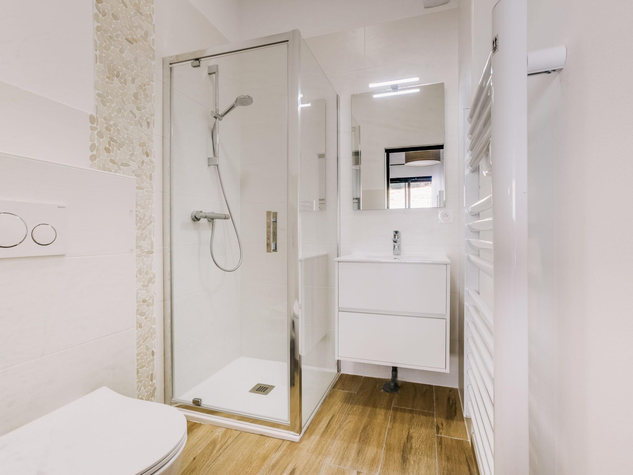 4-room house 78 m2 on 3 levels on 1st floor. Comfortable and modern furnishings: living/dining room with TV and international TV channels (flat screen), air conditioning and electric shutters. Exit to the terrace. Upper floor: kitchen (oven, dishwasher, 1 induction hot plates, 3 gas rings, toaster, kettle, microwave, freezer, electric coffee machine, Capsules for coffee machine (Nespresso) extra) with air conditioning. Exit to the terrace. Shower, sep. WC. Air-conditioning, forced-air heating. 2nd upper floor: 1 room with 1 french bed (160 cm, length 200 cm), shower/WC. Exit to the terrace. 1 room with 1 x 2 bunk beds (90 cm, length 190 cm), 1 french bed (160 cm, length 200 cm). Wooden floors. 2 terraces 40 m2. Terrace furniture, barbecue, deck chairs. Facilities: washing machine, iron. Internet (WiFi, free). Parking (2 cars). Please note: non-smoking house. Maximum 1 pet/ dog allowed. Smoke alarm. Please note : bunk beds and french bed are separated by a glass door, between the living room and the kitchen 6 steps, between the kitchen and the bedrooms 6 steps. Works in progress in the housing estate..