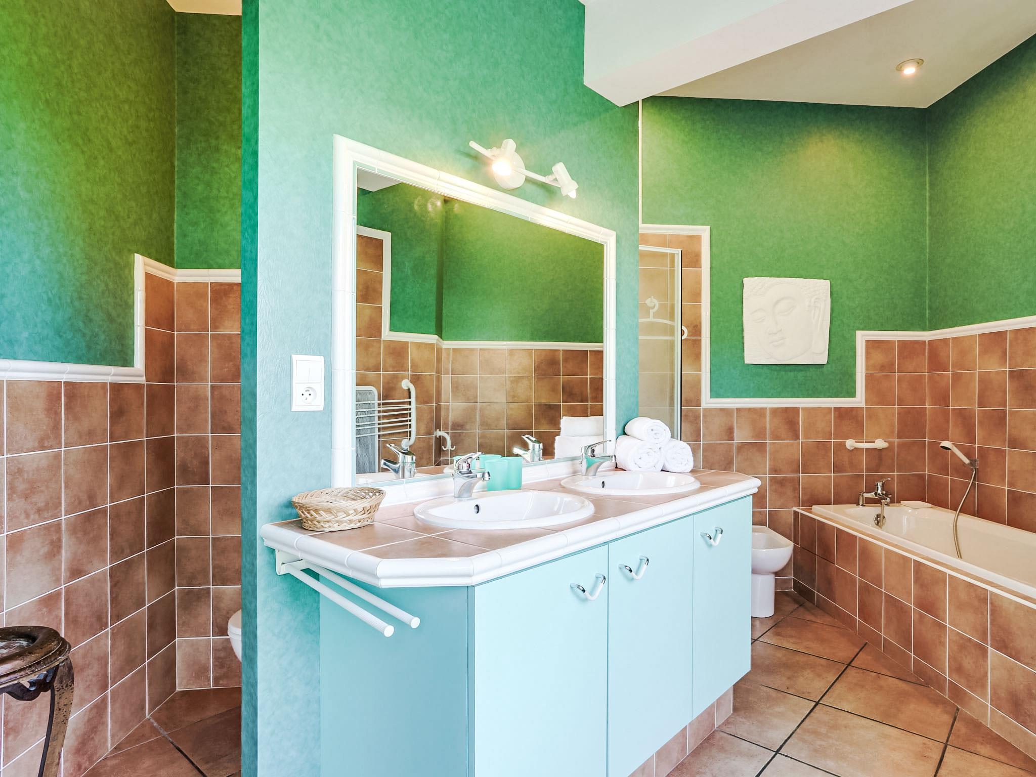 7-room house 240 m2 on 2 levels. Comfortable furnishings: living/dining room. Exit to the terrace. 1 room with 1 french bed (1 x 140 cm, length 190 cm), shower. 1 room with 1 french bed (1 x 140 cm, length 190 cm), bath/WC. 1 room with 2 beds (90 cm, length 190 cm). 1 room with 2 beds (90 cm, length 190 cm). Kitchenette (4 hot plates, oven). Shower, sep. WC. Upper floor: living/dining room with satellite TV and international TV channels (flat screen). Exit to the balcony. 1 room with 1 french bed (1 x 140 cm, length 190 cm), bath/shower/WC and double hand-basin. Kitchenette (oven, dishwasher, 4 ceramic glass hob hotplates, microwave). Sep. WC. Electric heating. Balcony, south facing position, terrace partly roofed, south facing position. Terrace furniture, balcony furniture, barbecue, deck chairs (6). Beautiful view of the river. Facilities: washing machine. Internet (WiFi, free). Please note: suitable for families. Smoke alarm.