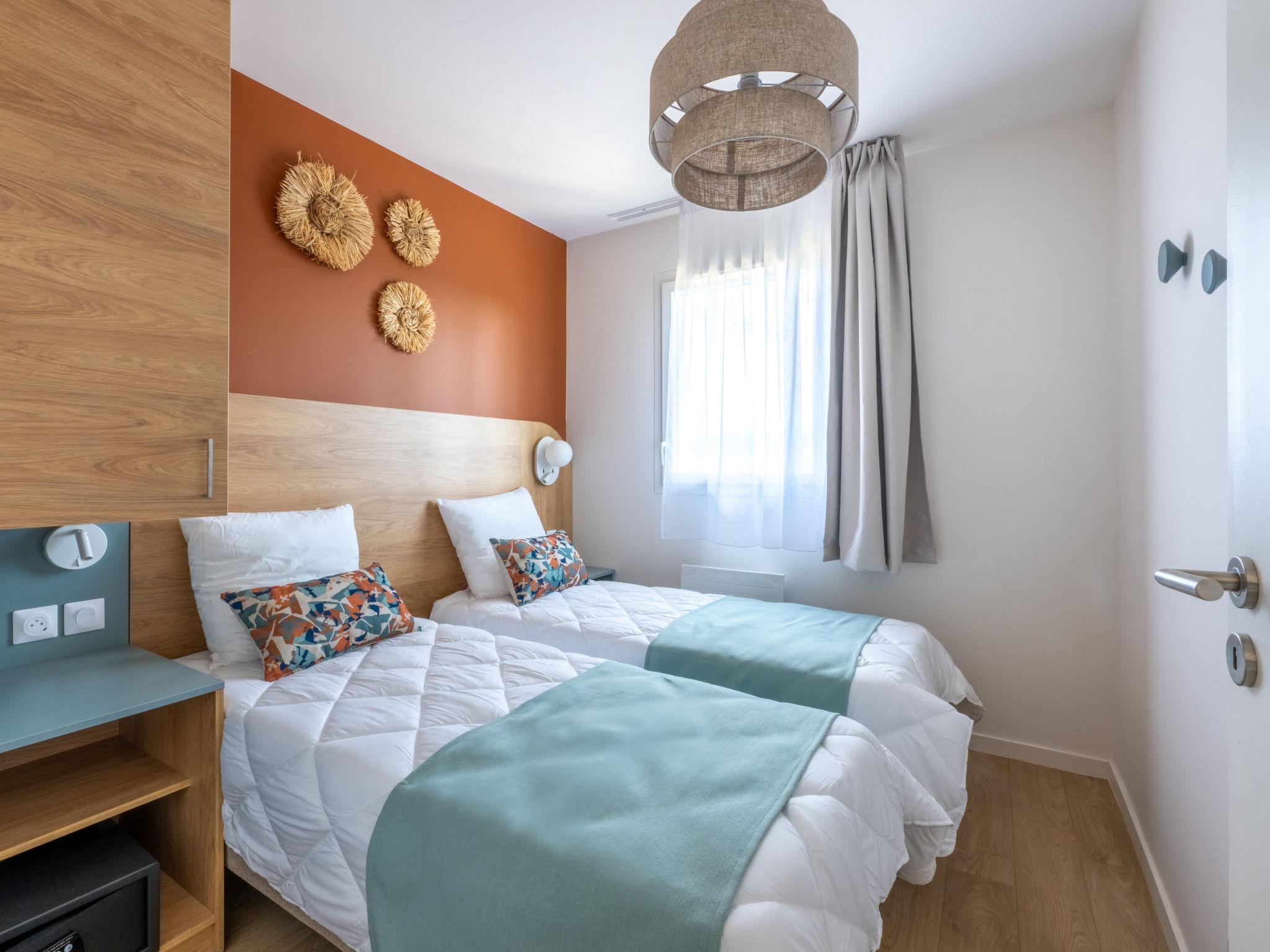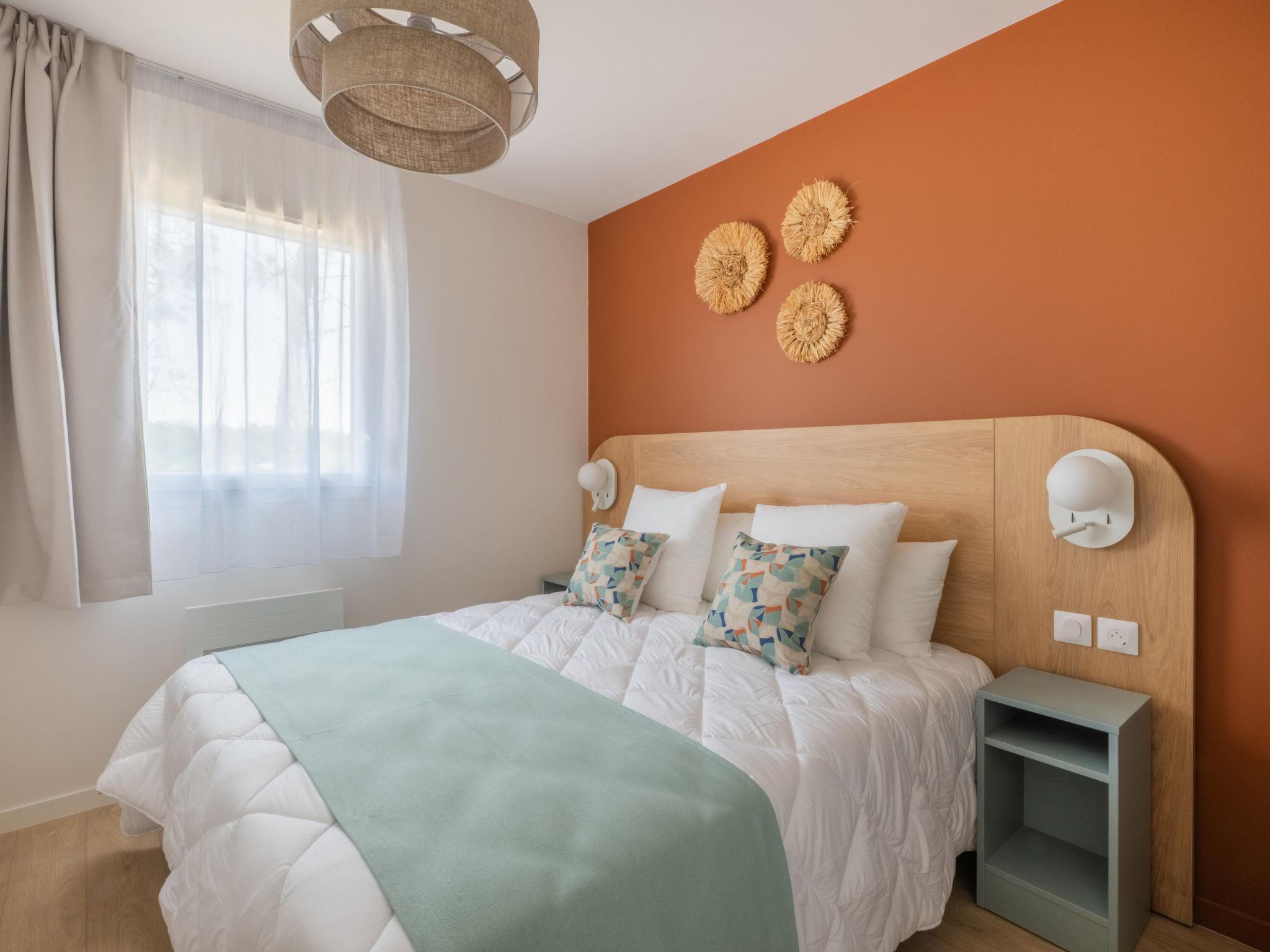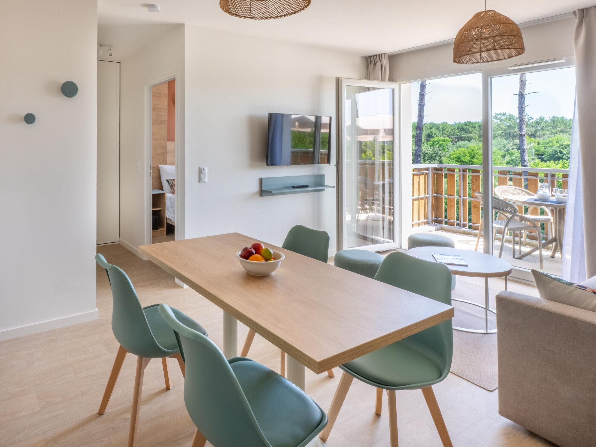 Residence "Bleu Canopée", 3 storeys, built in 2025. 100 apartments in the residence. 5 km from the centre of Mimizan, in the residential district, 650 m from the sea, 650 m from the beach. For shared use: property with lawn, swimming pool fenced (98 m2, depth 80 - 140 cm, seasonal availability: 01.May. - 30.Sep.) with internal staircase. Children's pool. In the complex: reception, WiFi, sauna (extra). Fitness room, washing machine, tumble dryer (for shared use, extra). Parking. Supermarket 1.4 km, restaurant 1 km, bus stop "Office de tourisme Mimizan" 1.3 km, railway station "Labouheyre" 30 km, sandy beach 650 m, park "Landes aventures" 6 km, bathing lake "Aureilhan" 10 km. Golf course (9 hole) 7 km. Nearby attractions: Bassin Arcachon 70 km, Biscarrosse 35 km, Casino Mimizan - Plage 1 km, Centre Nautique 6 km, Bordeaux 110 km. Please note: the photograph shows a typical example.
