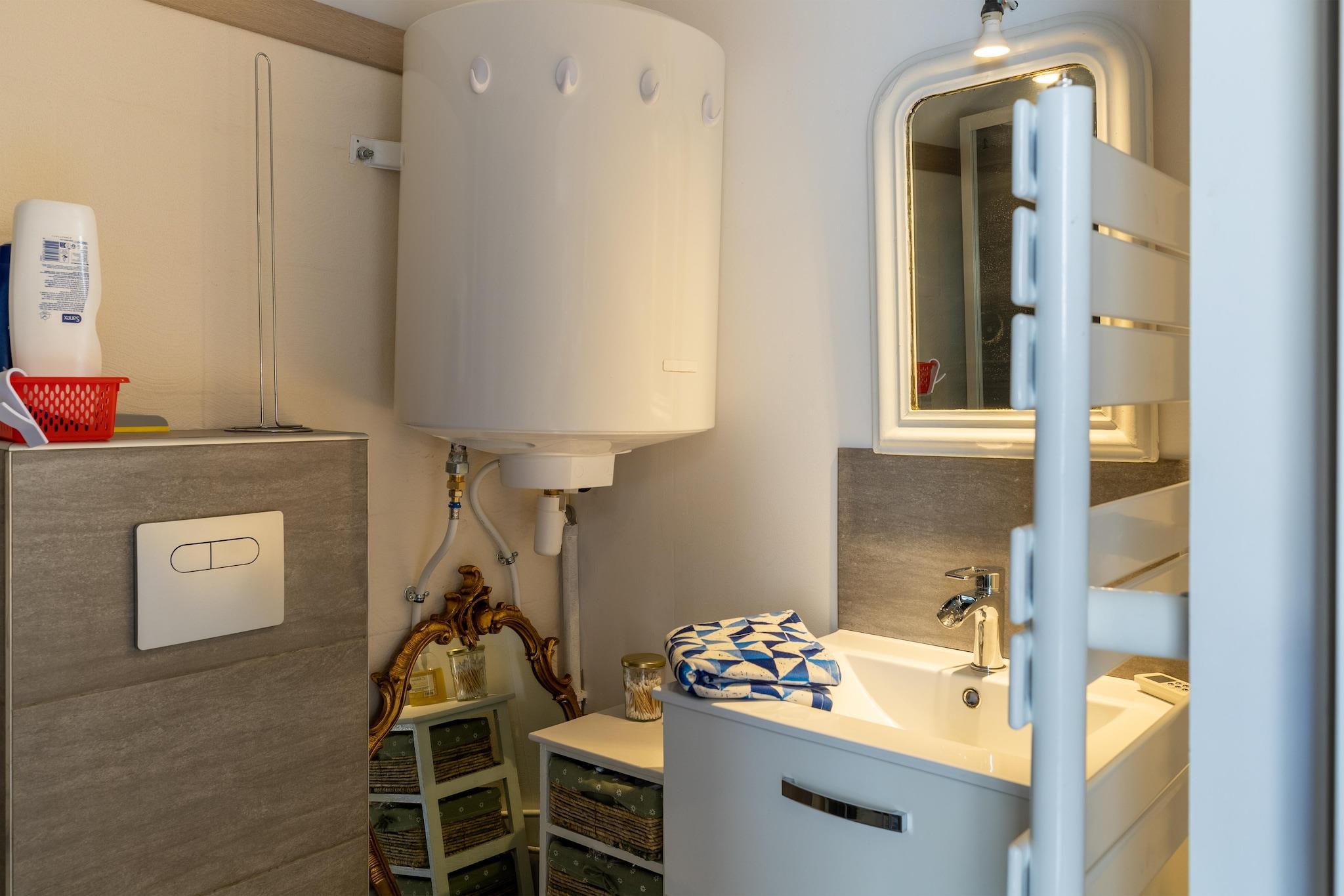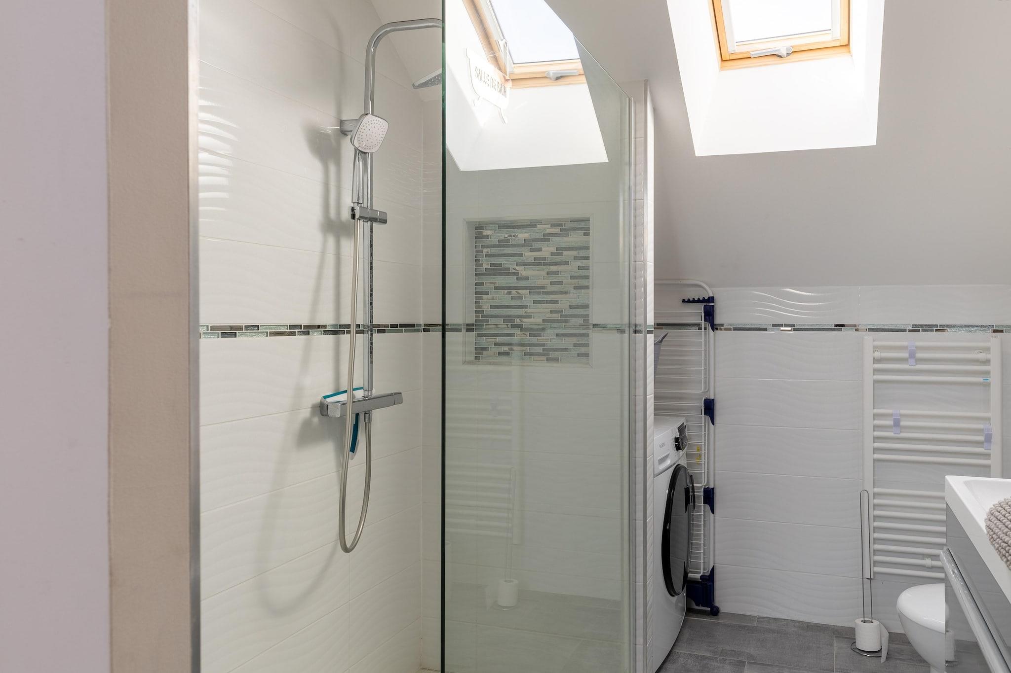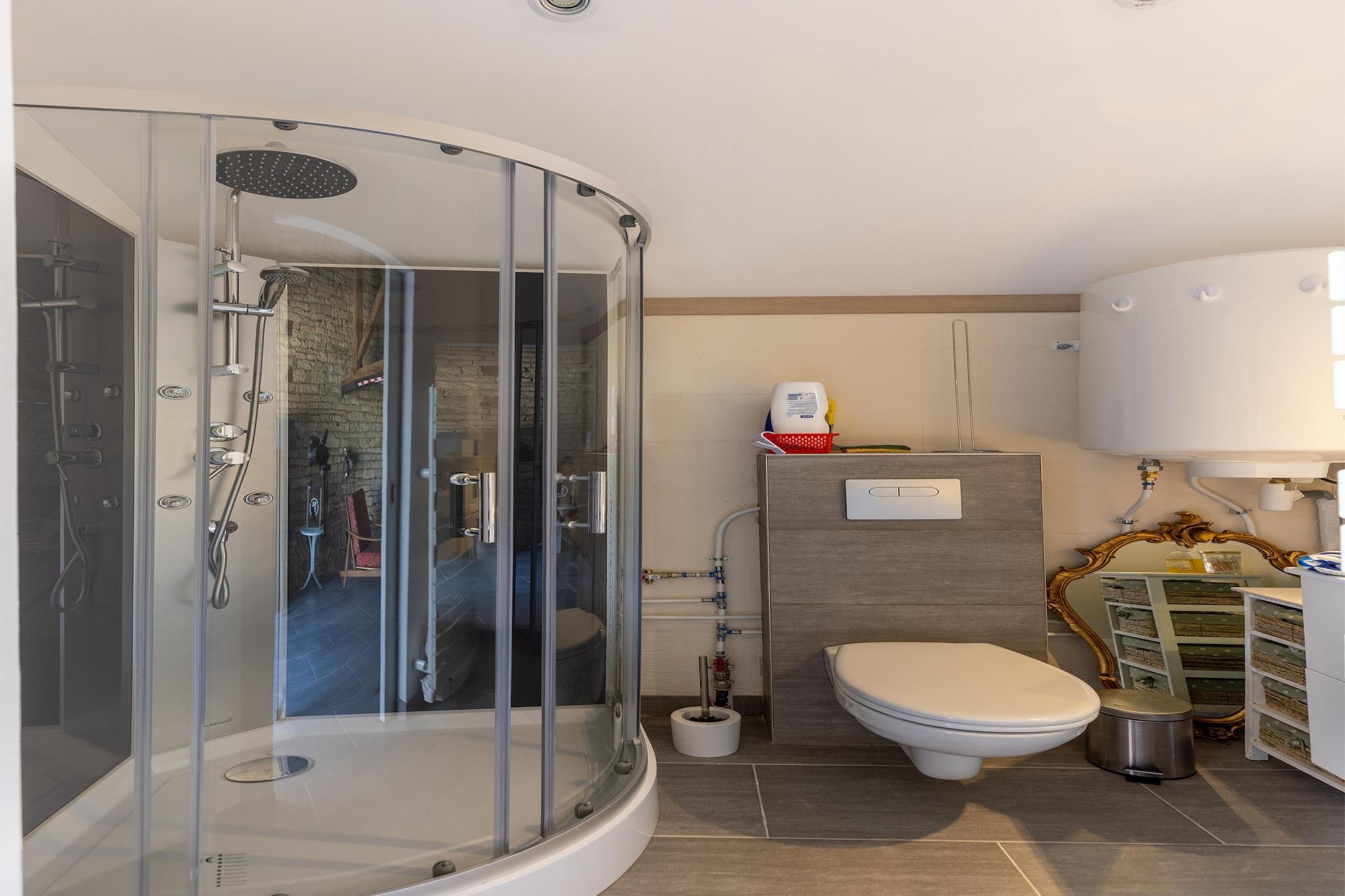 Ground floor: (Sitting room(double sofa bed, TV, stove(Pellet), seating area, DVD player, wireless music system), dining room(double sofa bed(160 x 200 cm), dining table), open kitchen(electric kettle, toaster, cooker(induction), coffee machine, espresso machine, microwave, dishwasher, fridge, fridge-freezer, Blender)) On the 1st floor: (bedroom(double bed or 2 single beds(90 x 200 cm), TV), bathroom(shower(walk-in shower), washbasin, toilet, washing machine, hairdryer)) Guest house ground floor: (bedroom(double sofa bed(160 x 200 cm), TV, radio), bathroom(massage shower, washbasin, toilet)) cot, courtyard, terrace, garden, BBQ(charcoal), parking, boules court, bicycles available, high chair, party games