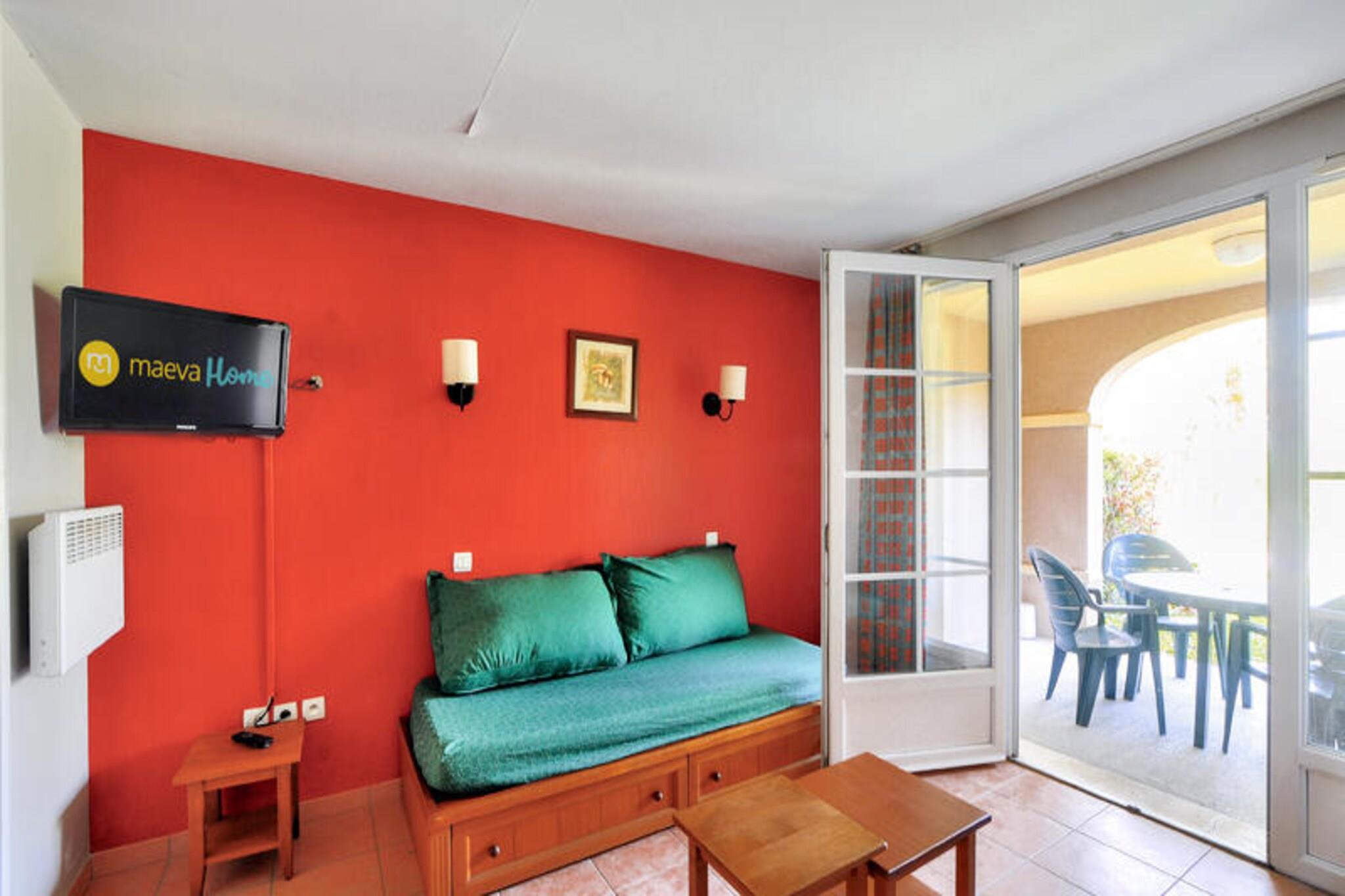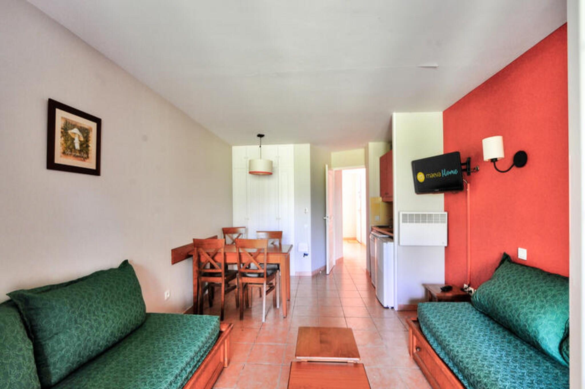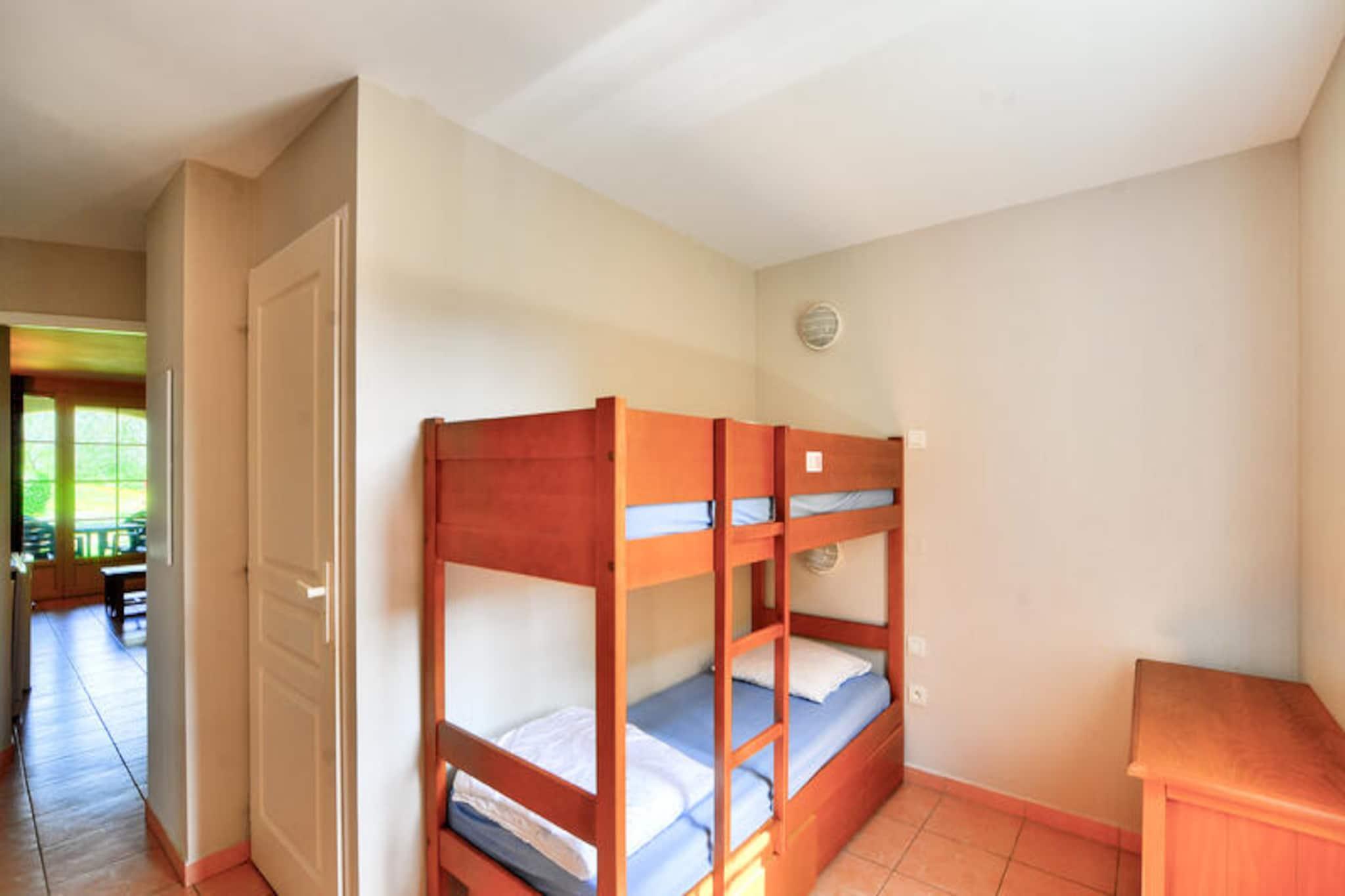 This cozy holiday apartment is ideal for families or small groups, featuring a living area with a sofa bed and an additional pull-out bed. The cabin area includes bunk beds, providing flexible sleeping arrangements. Pets are welcome for an additional fee, ensuring that your furry friends can join you on your getaway. The apartment also includes a private parking spot for your convenience. The property is set in the picturesque village of Monflanquin, surrounded by lush landscapes and just a short walk from local attractions. You can explore the region's rich cultural heritage, including nearby castles and historical sites. For outdoor enthusiasts, there are plenty of hiking and cycling trails, as well as opportunities for horseback riding, kayaking, and golf. The area also boasts a municipal swimming pool, and a nearby natural lake for swimming in summer. Inside, the apartment features a well-equipped American-style kitchen, perfect for preparing meals during your stay. The bathroom includes a bathtub with a column and a WC, while the covered terrace offers a relaxing space with forest views to enjoy meals or unwind in the evenings. The apartment is designed for maximum comfort and convenience, ensuring a peaceful and enjoyable stay.