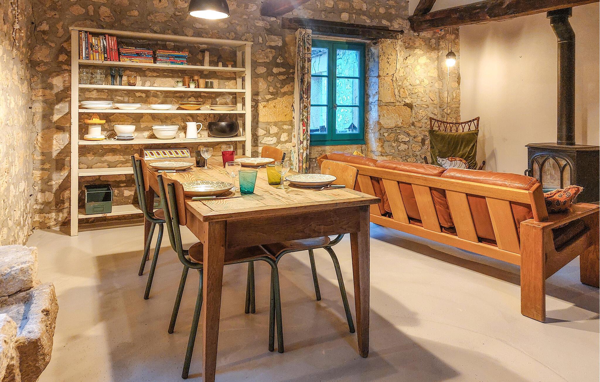 Dieses Ferienhaus ist der ideale Ort, um zur Ruhe zu kommen und die Einfachheit des Landlebens zu erleben. Der große Wohnraum ist offen gestaltet und verbindet Tradition mit gemütlichem Komfort. Spüren Sie die besondere Atmosphäre der alten Steinmauern und Holzbalken. Entspannen Sie auf dem Sofa oder lesen Sie ein Buch am Kaminofen. Der Essbereich mit Holztisch lädt zu gemeinsamen Mahlzeiten ein. Die Küche ist individuell gestaltet, mit handgefertigten Details und offenen Regalen.