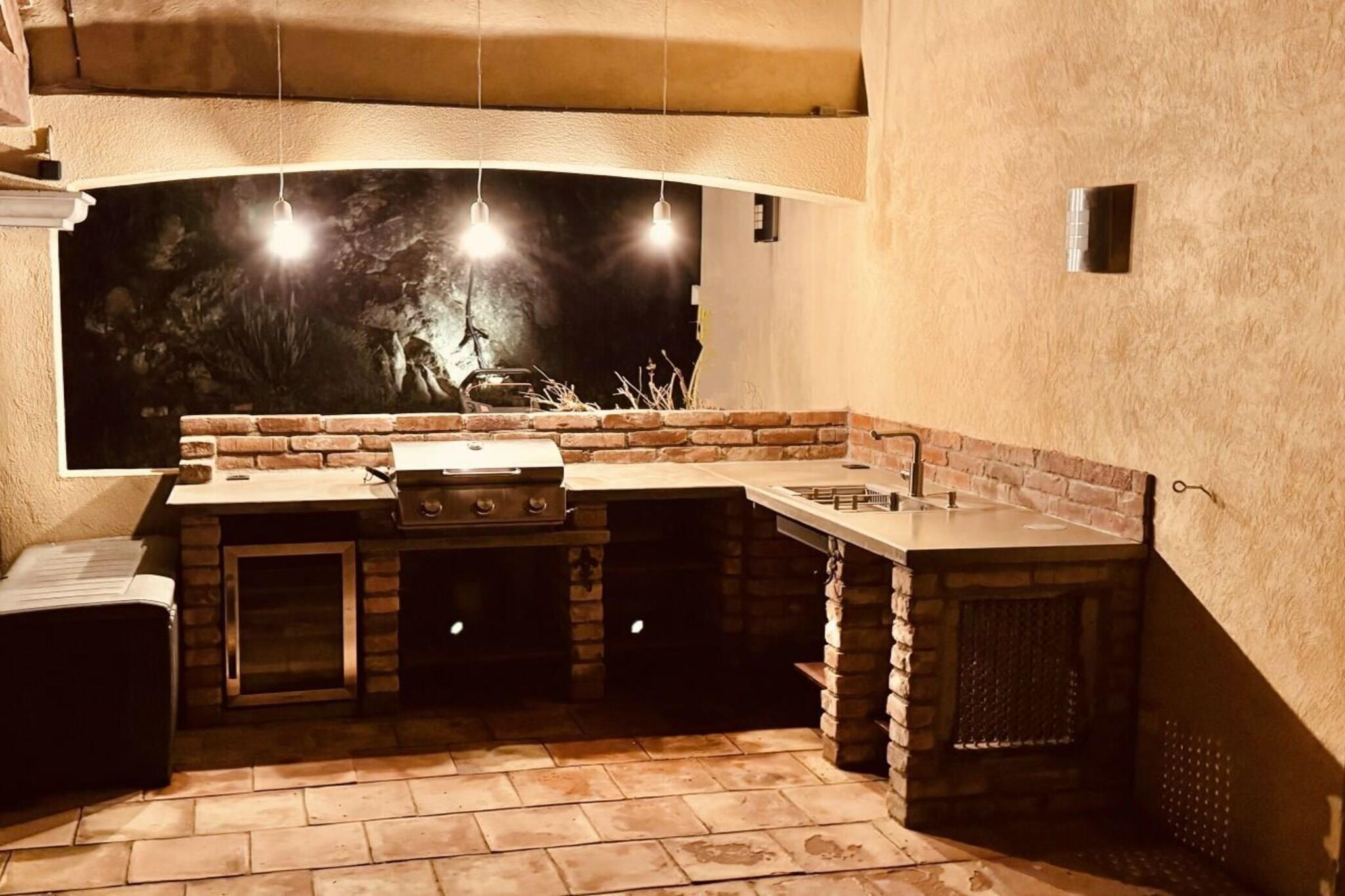 Ground floor: (Kitchen(Mixer, Tea Towels, Kitchenette, Lawn, stove, electric kettle, toaster, cooker, coffee machine, oven, microwave, dishwasher, fridge, freezer, heating, insect screens, Food processor)) Fire Alarm, Hot Water, Internet Access DSL, Safe, Vacuum Cleaner, hall(toilet, shower, washbasin, heating), Living room(Games, library, TV, TV, fireplace, DVD player, DVD player, radio, heating), dining room(dining table, heating), bedroom(Bed Linen, Wardrobe, double bed, radio, heating, air conditioning), bedroom(Bed Linen, Wardrobe, double bed, heating, air conditioning), bedroom(Bed Linen, Wardrobe, double bed, TV, heating, air conditioning), Gallery bedroom, Children's bedroom(Bed Linen, single sofa bed, single loft bed, cot, cot, heating, air conditioning, children's bed), bathroom(Mirror, toilet, bath tub, washbasin, heating), guest toilet(Mirror, toilet, washbasin), relaxation area(sauna, shower), veranda(garden furniture, sun loungers), Internet access, Internet access, First Aid, washing machine, heating, terrace(Sun Umbrella, sauna, Table tennis, garden furniture, sun loungers, swimming pool), garden(Lawn, grill, garden furniture, sun loungers, swimming pool, high chair), ironing board, iron, drying cabinet, Alarm, telephone, parking (paying)
