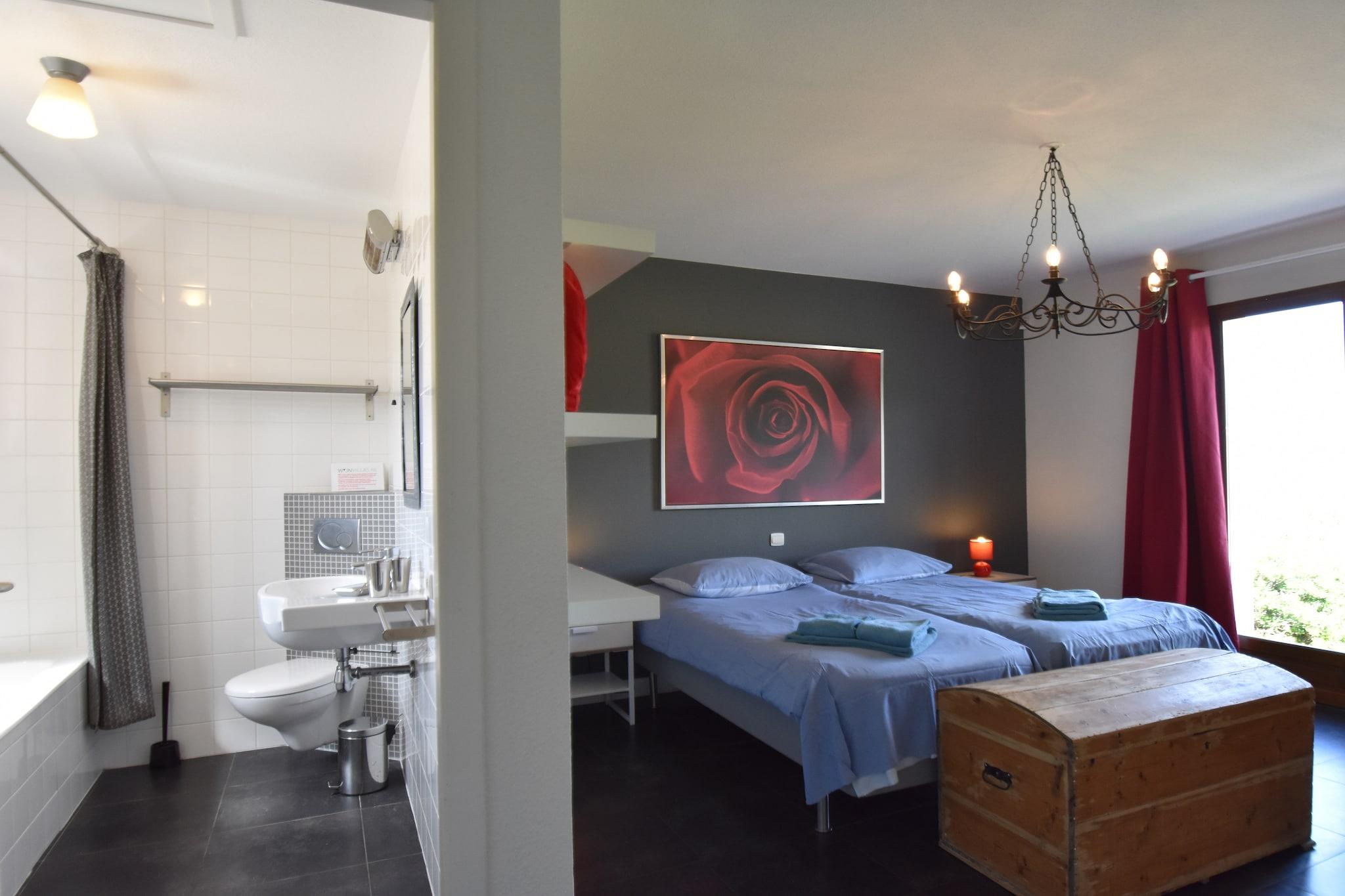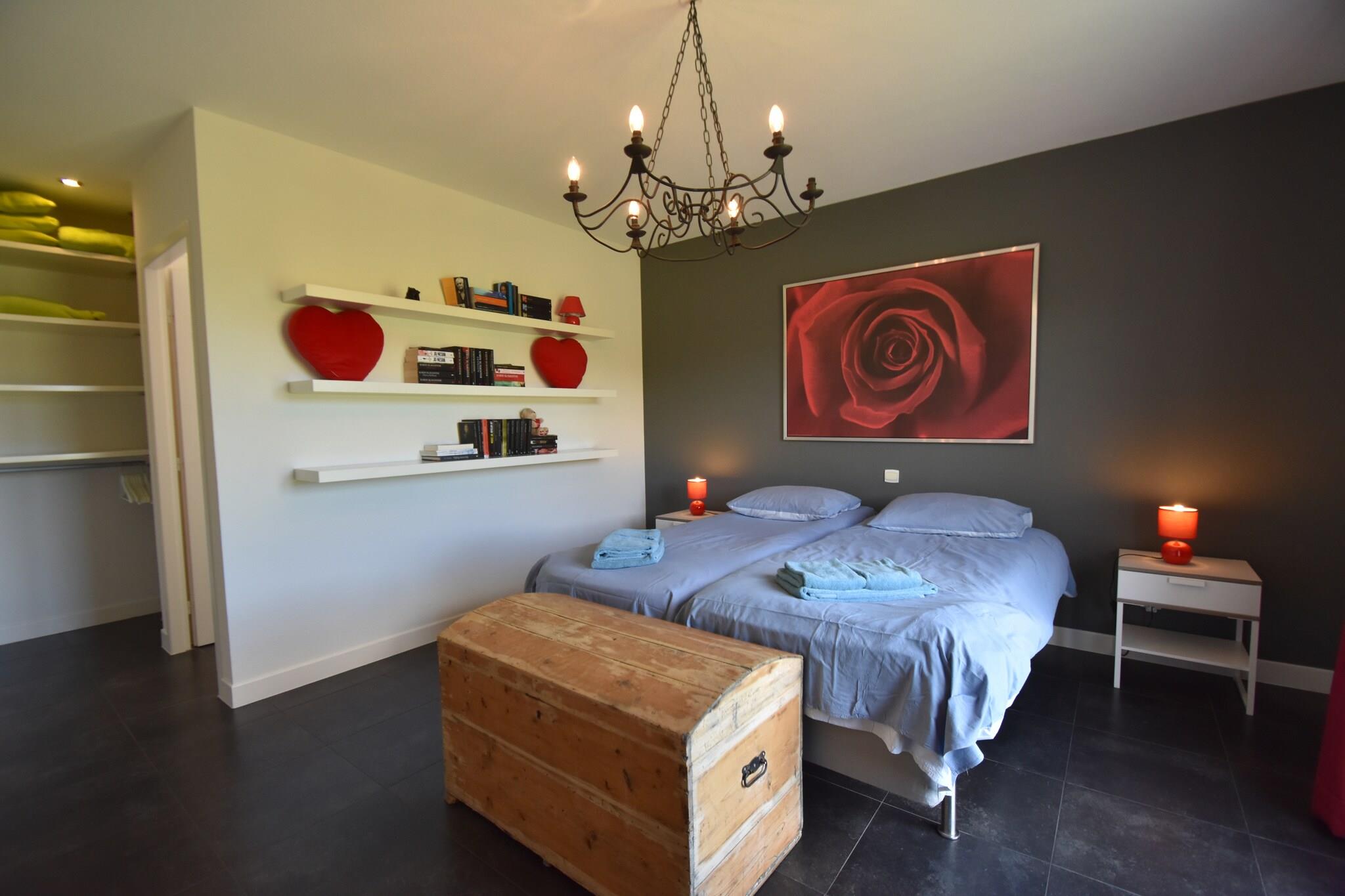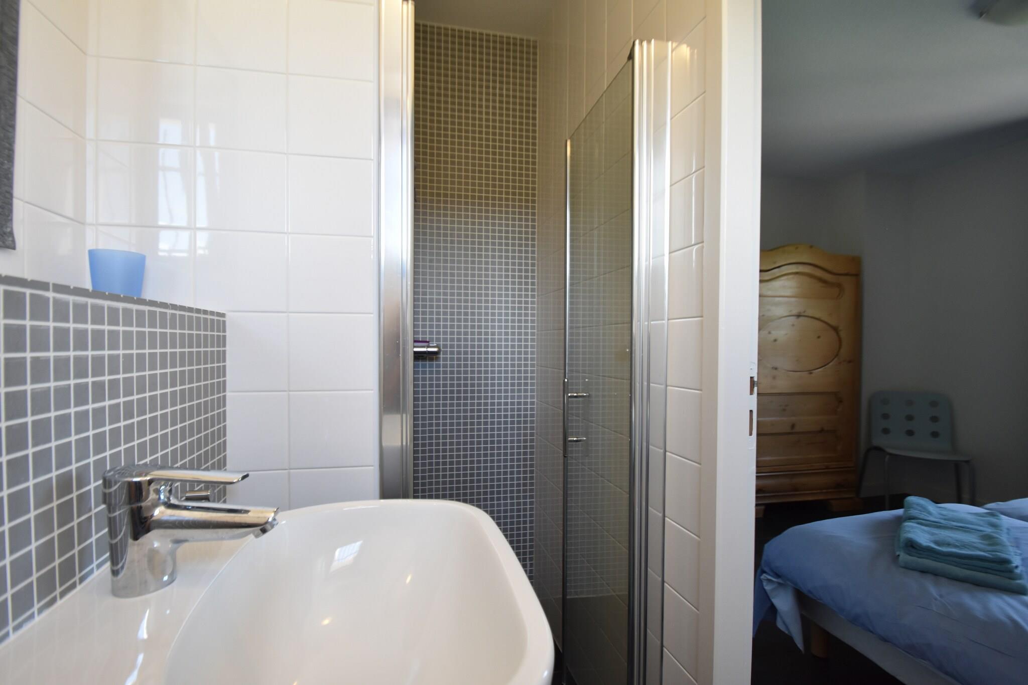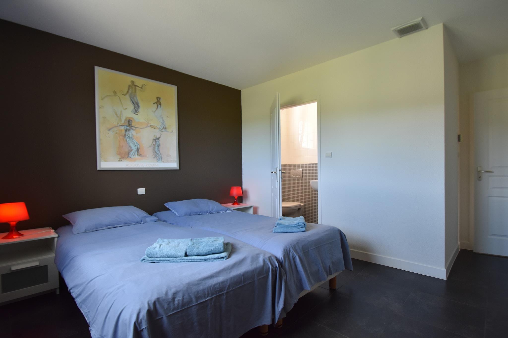 Ground floor: (Living room(39 m2)(TV(flatscreen, smart TV, dutch television channels), stove(wood), seating area, DVD player, CD player, stereo unit), Kitchen(24 m2)(dining table, electric kettle, toaster, cooker, hood, oven, microwave, dishwasher, fridge-freezer), Bedroom with bathroom(double bed or 2 single beds(boxspring), bath tub, washbasin, toilet), toilet(2 m2), pantry(8 m2)(fridge-freezer, tumble dryer, washing machine, terrace(roofed), ironing board, iron), garden doors, air conditioning, children's bed, high chair) On the 1st floor: (bedroom(16 m2)(double bed or 2 single beds(boxspring)), bedroom(8 m2)(bunk bed(80 x 200 cm)), Bedroom with bathroom(15 m2)(double bed or 2 single beds(boxspring), shower, washbasin, toilet), bathroom(3 m2)(shower, washbasin, toilet), air conditioning) carport, shower, garden doors, air conditioning, terrace, garden(private, landscaped garden, partially fenced, illuminated, 6400 m2), garden furniture, sun loungers, BBQ, parking, swimming pool(private, opened from May upto and including Oct), tennis court(private), boules court, table tennis table