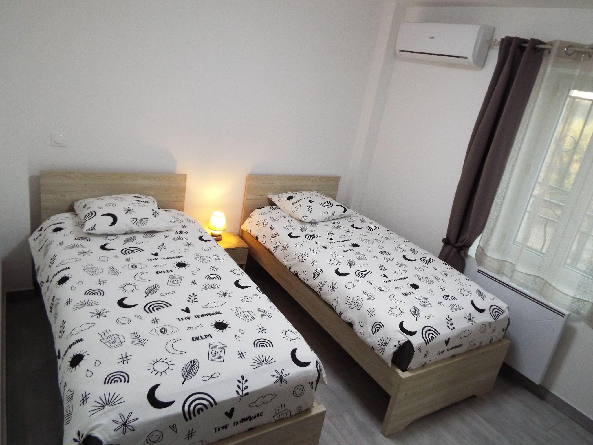 The second bedroom has two separate beds and a large wardrobe.