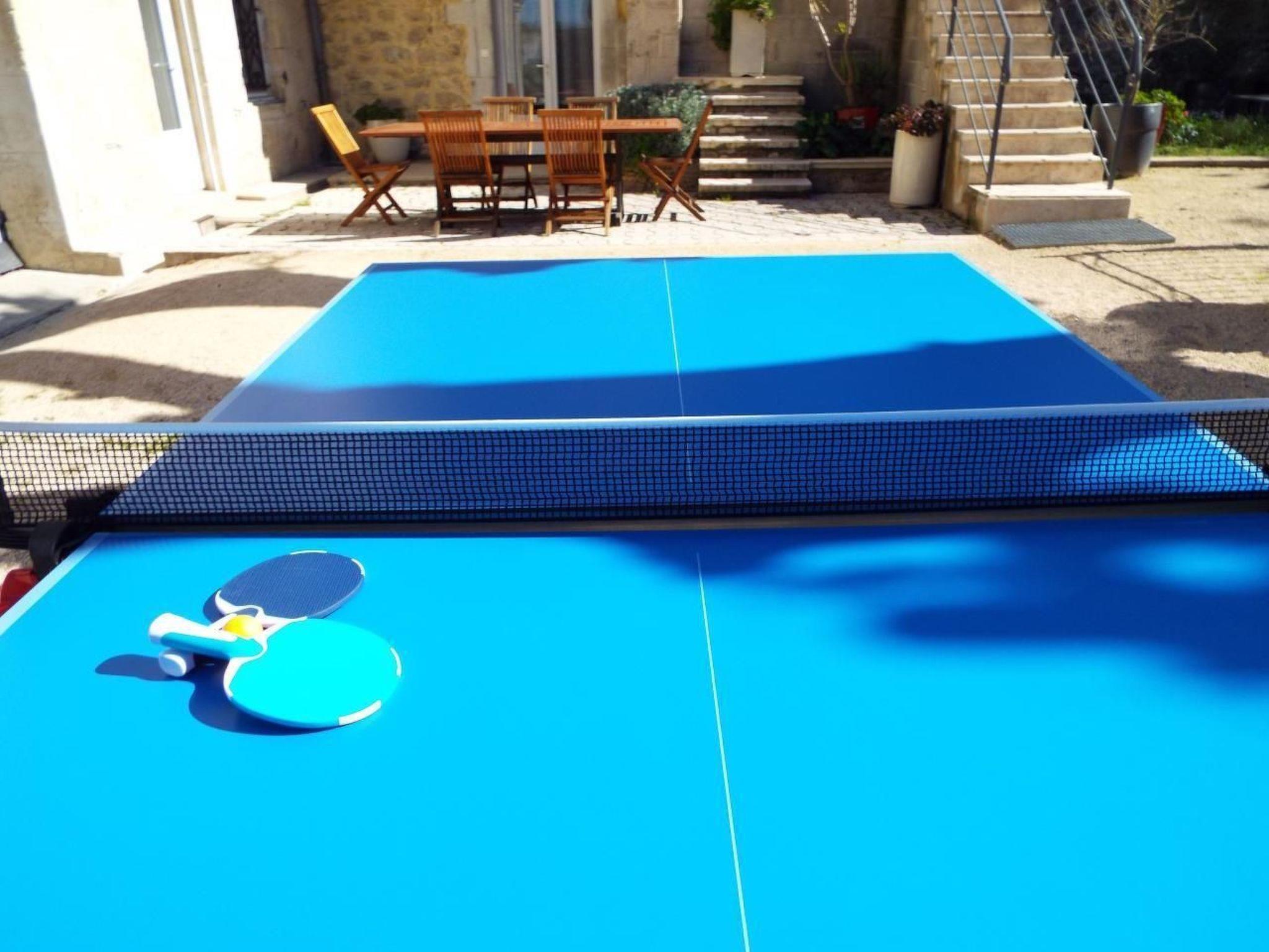 A table tennis table and basketball hoop for amateur players.