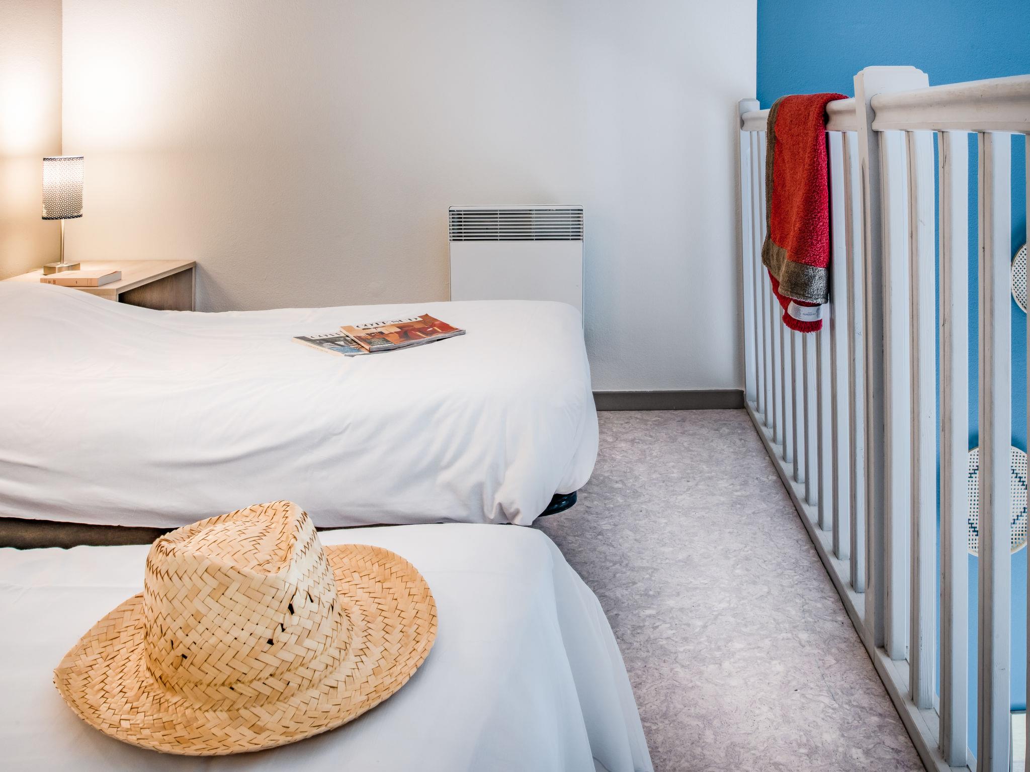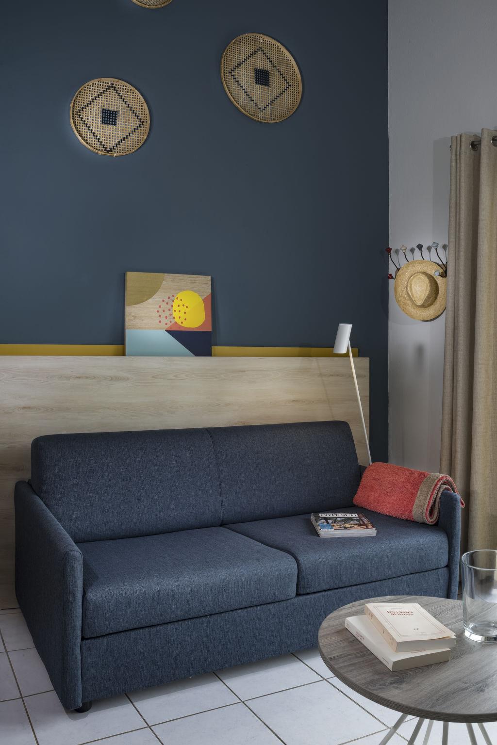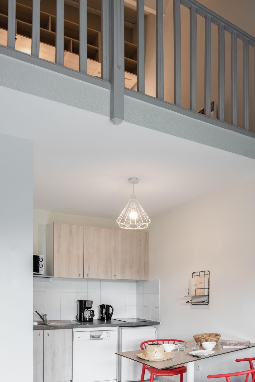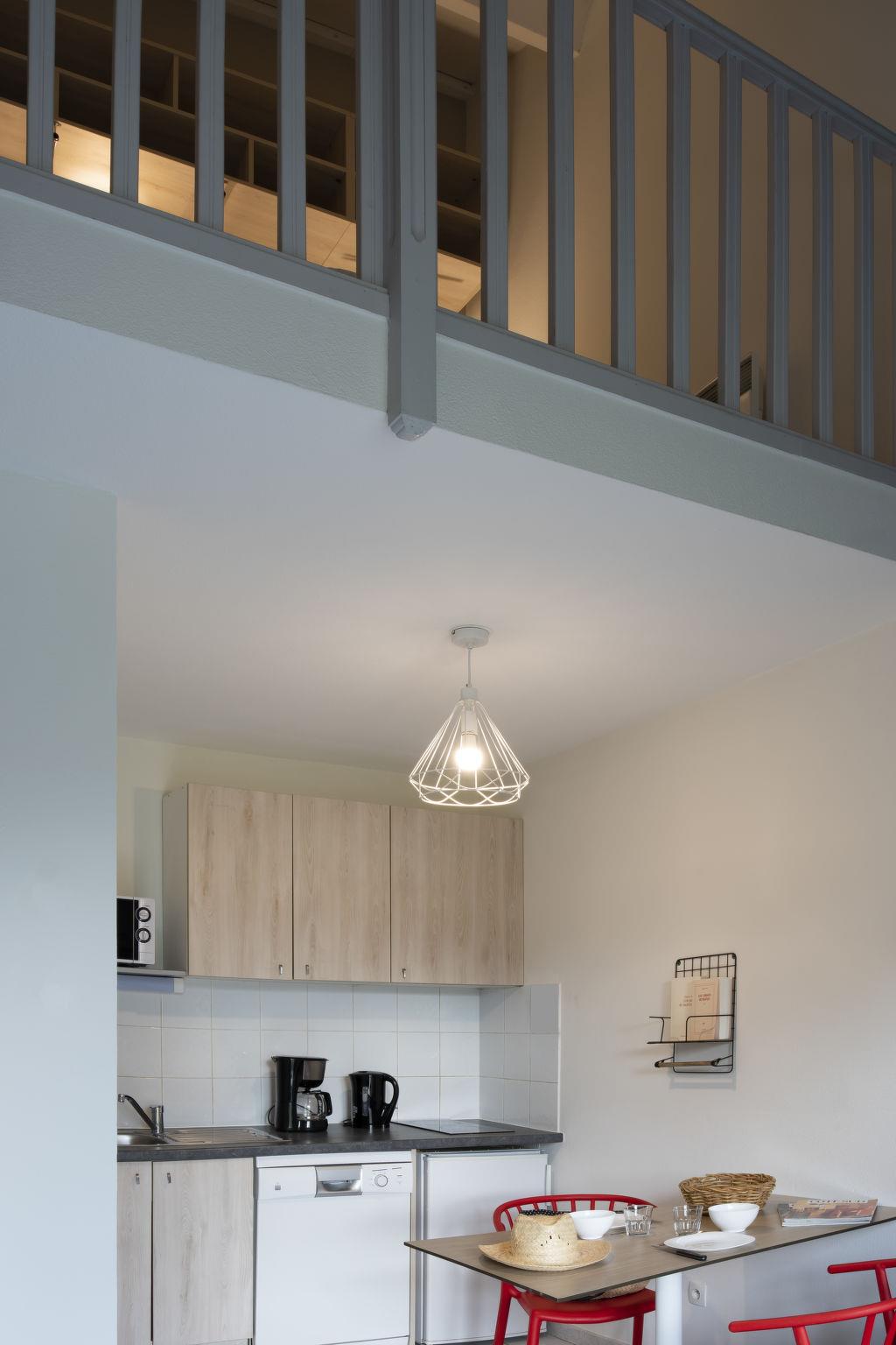 "Domaine du Golf", 1-room terraced house 32 m2 on 2 levels. Object suitable for 2 adults + 2 children. Bright, renovated in 2019, modern and stylish furnishings: living/sleeping room with 1 double sofabed (140 cm, length 190 cm), dining table, TV and air conditioning. Exit to the terrace. Kitchenette (2 hot plates, dishwasher, microwave, electric coffee machine). Shower/WC. Upper floor: open gallery with 2 beds. Electric heating. Terrace. Terrace furniture. Facilities: Internet (WiFi, free). Please note: maximum 1 pet/ dog allowed. Smoke alarm. The opening of the swimming pool may vary depending on the weather. Bakery service in July and August only. Instead of an enclosed bedroom, some sleeping areas are located in an open-plan area (gallery, alcove, etc.).