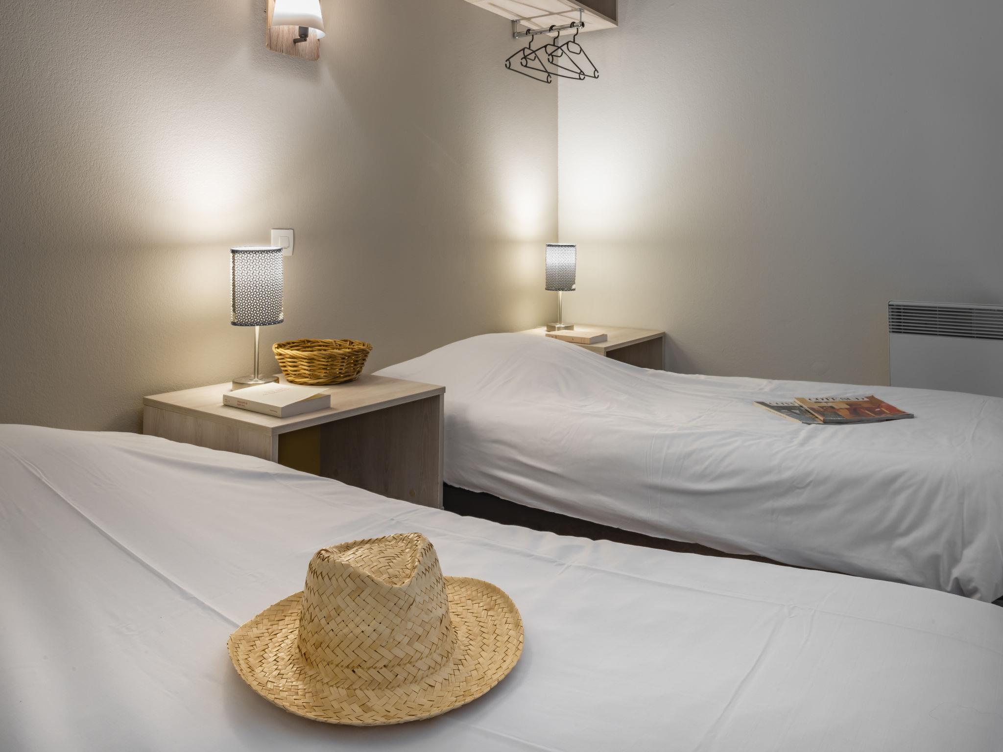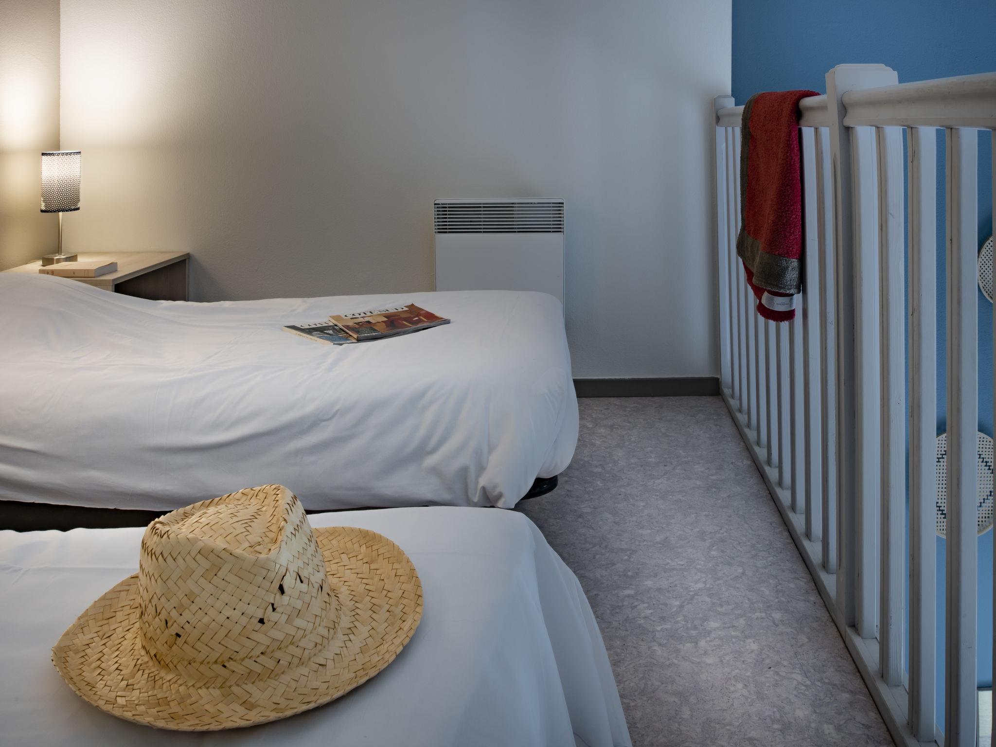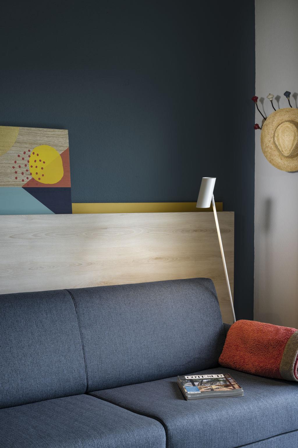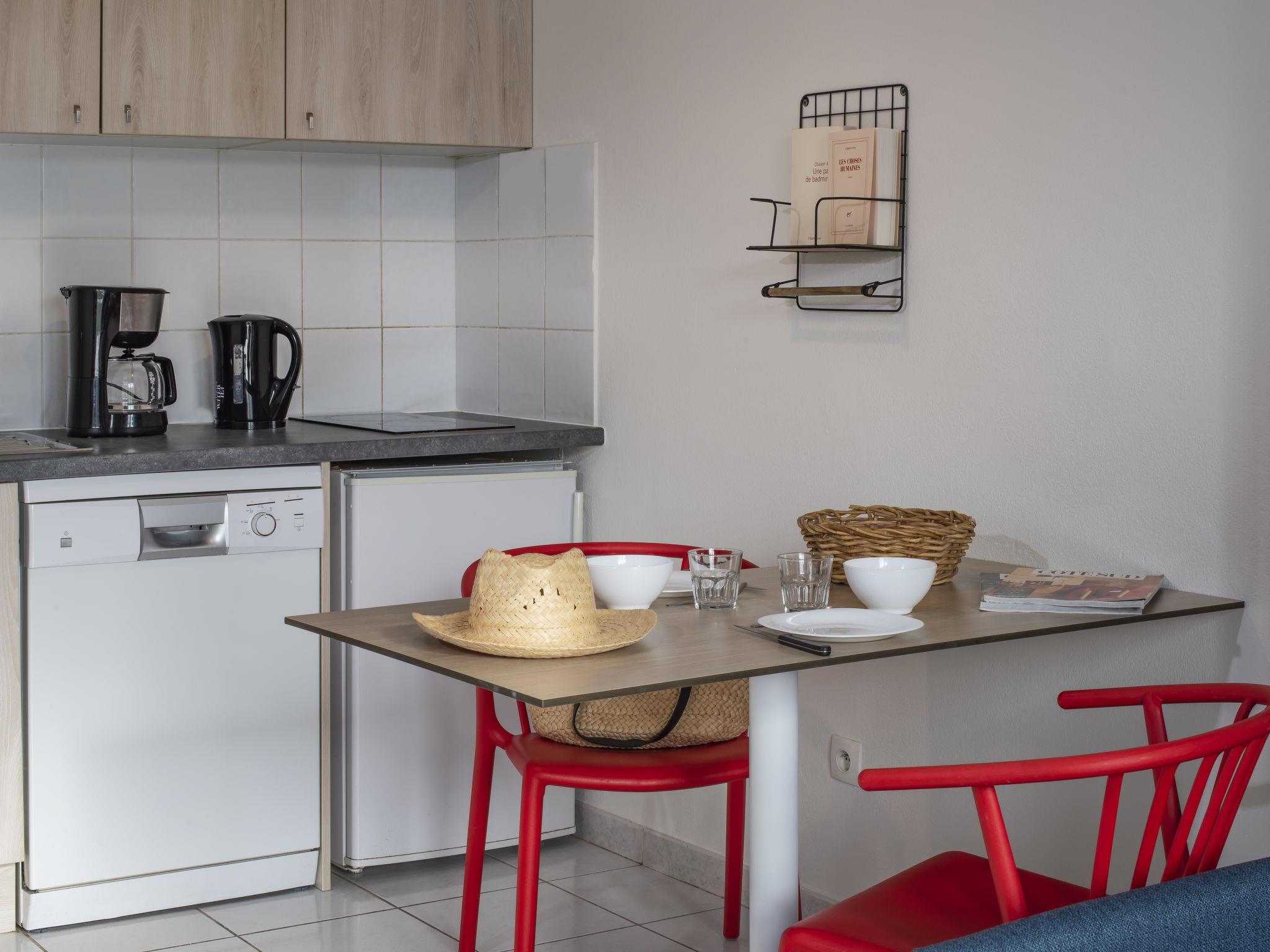 "Domaine du Golf", 1-room terraced house 32 m2 on 2 levels. Object suitable for 2 adults + 2 children. Bright, renovated in 2019, modern and stylish furnishings: living/sleeping room with 1 double sofabed (140 cm, length 190 cm), dining table, TV and air conditioning. Exit to the terrace. Kitchenette (2 hot plates, dishwasher, microwave, electric coffee machine). Shower/WC. Upper floor: open gallery with 2 beds. Electric heating. Terrace. Terrace furniture. Facilities: Internet (WiFi, free). Please note: maximum 1 pet/ dog allowed. Smoke alarm. The opening of the swimming pool may vary depending on the weather. Bakery service in July and August only. Instead of an enclosed bedroom, some sleeping areas are located in an open-plan area (gallery, alcove, etc.).