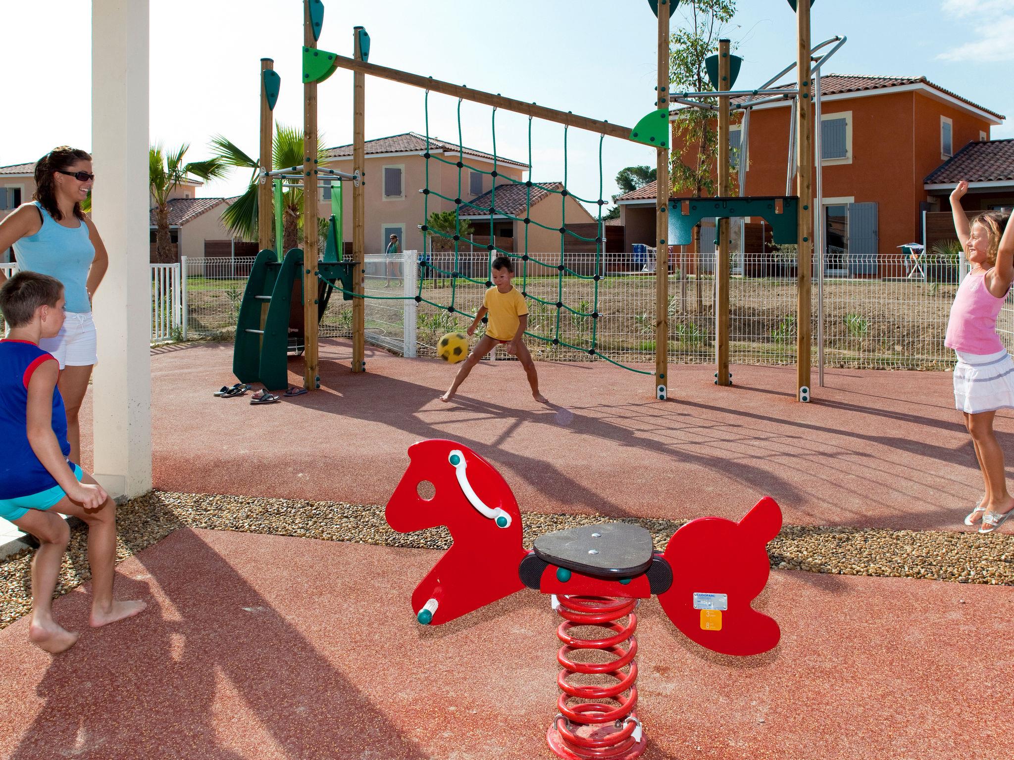 Child friendly, modern resort "Domaine du Golf". 220 houses in the resort. 18 km from the centre of Montpellier, 2.5 km from the centre of Fabrègues, 16 km from the centre of Palavas-les-Flots, 12 km from the sea, in the countryside, on the golf course. For shared use: beautiful, well-kept garden 11 ha (fenced) with lawn and plants, swimming pool fenced (550 m2, depth 30 - 160 cm, seasonal availability: 15.Apr. - 30.Sep.). Unconventional pool shape. Table tennis, boccia, terrace, garden furniture, children's playground. In the complex: reception, bistro, fitness room, washing machine, tumble dryer (for shared use, extra). Bread roll service. Footpath to the house. Central parking spaces. Supermarket 2 km, restaurant 2 km, sandy beach "Frontignan-Plage" 12 km. Golf course (6 hole) 100 m. Please note: car-free holiday complex. Entertainment in the season. The photograph shows a typical example. The holiday properties may differ in living space, floorplan, equipment and furnishing.