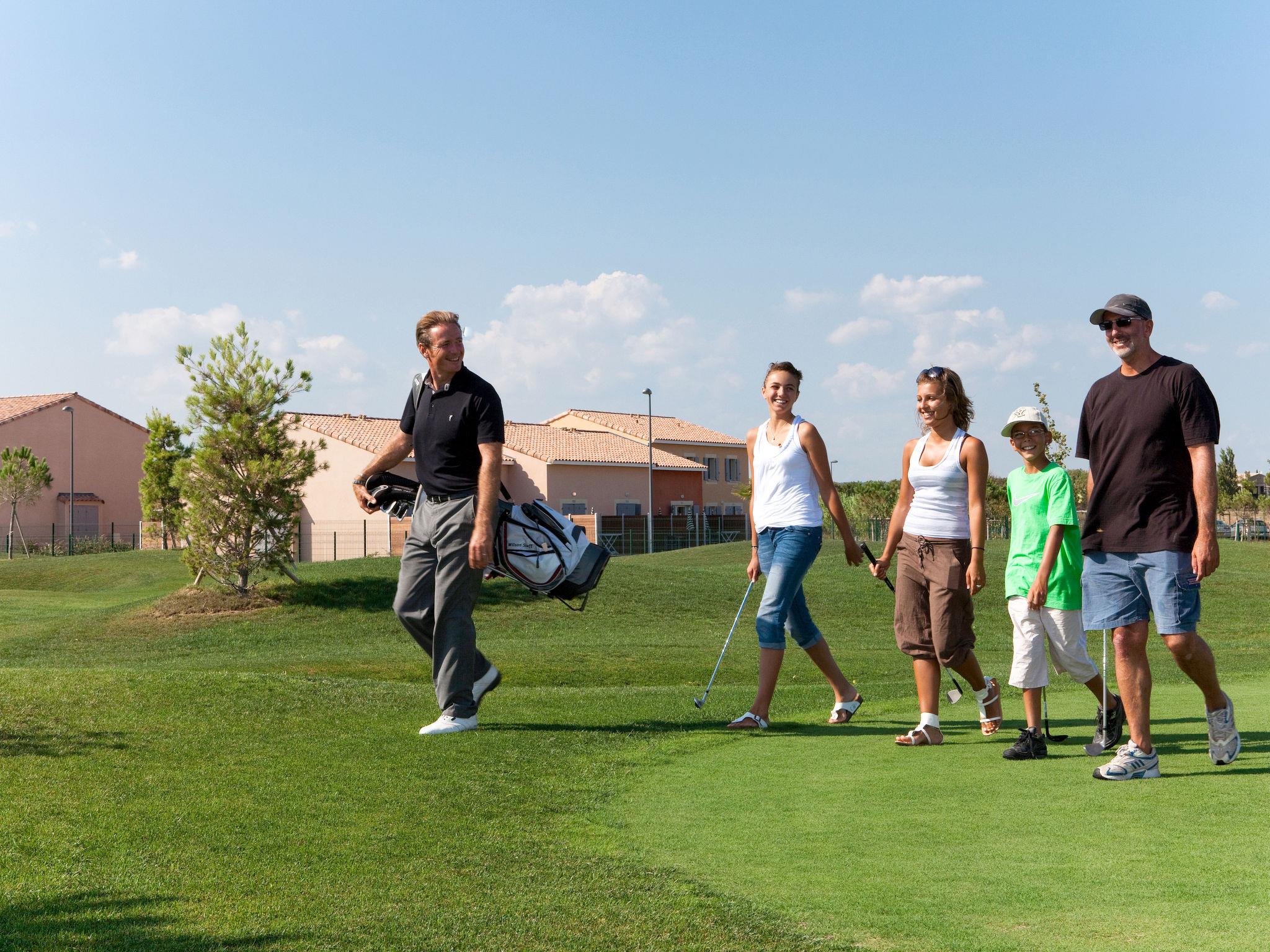 Child friendly, modern resort "Domaine du Golf". 220 houses in the resort. 18 km from the centre of Montpellier, 2.5 km from the centre of Fabrègues, 16 km from the centre of Palavas-les-Flots, 12 km from the sea, in the countryside, on the golf course. For shared use: beautiful, well-kept garden 11 ha (fenced) with lawn and plants, swimming pool fenced (550 m2, depth 30 - 160 cm, seasonal availability: 15.Apr. - 30.Sep.). Unconventional pool shape. Table tennis, boccia, terrace, garden furniture, children's playground. In the complex: reception, bistro, fitness room, washing machine, tumble dryer (for shared use, extra). Bread roll service. Footpath to the house. Central parking spaces. Supermarket 2 km, restaurant 2 km, sandy beach "Frontignan-Plage" 12 km. Golf course (6 hole) 100 m. Please note: car-free holiday complex. Entertainment in the season. The photograph shows a typical example. The holiday properties may differ in living space, floorplan, equipment and furnishing.