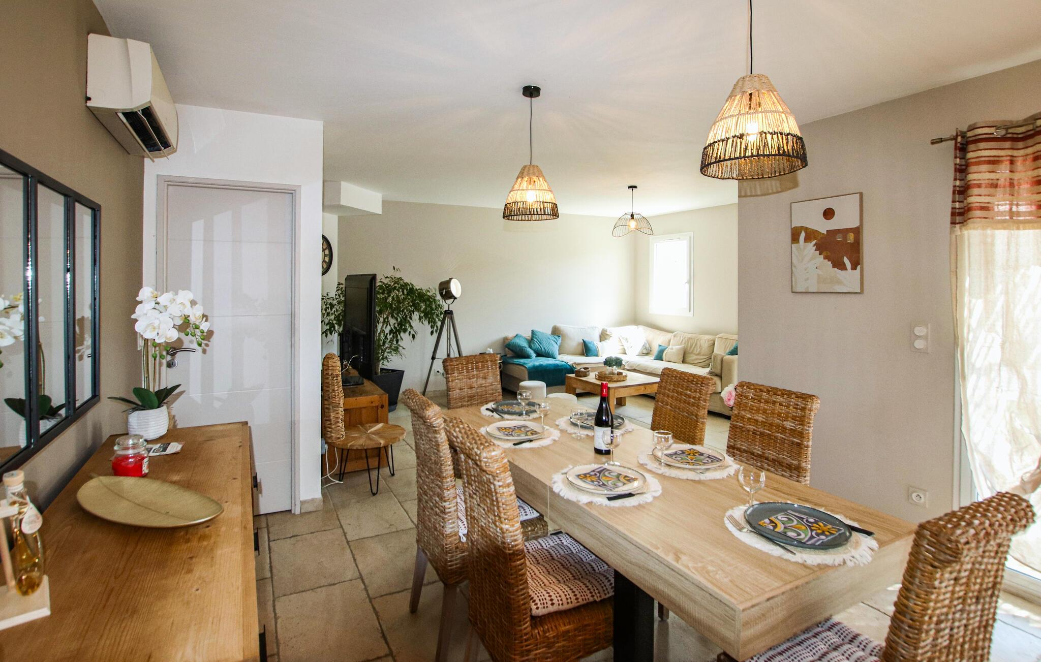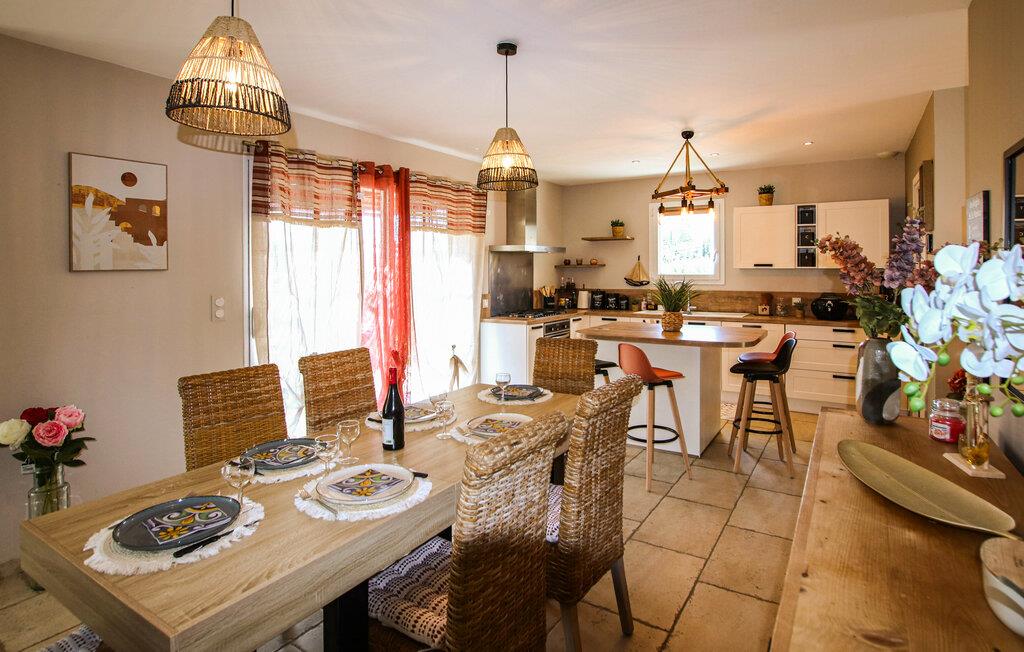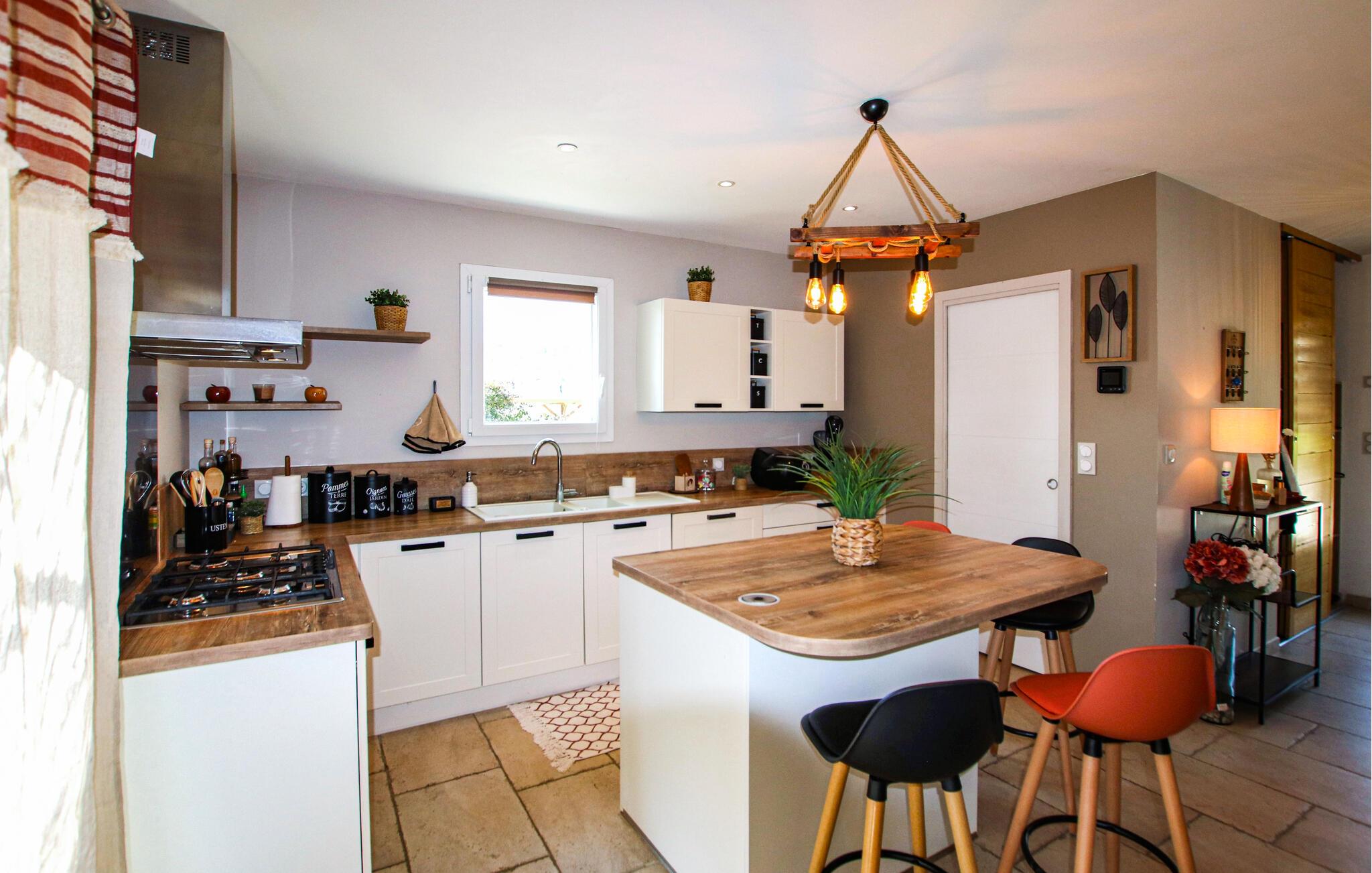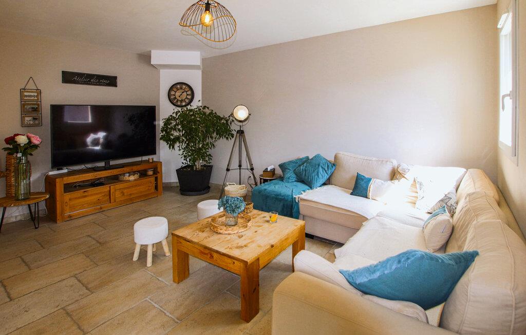 Ihr komfortables Ferienhaus verspricht entspannte Tage im Herzen der Provence. Freuen Sie sich auf gesellige kulinarische Erlebnisse in der modernen Küche und auf entspannte Mahlzeiten mit Blick ins Grüne. Genießen Sie das stilvolle Ambiente im geschmackvoll eingerichteten Wohnzimmer und machen Sie es sich auf dem einladenden Sofa für einen Filmabend gemütlich.