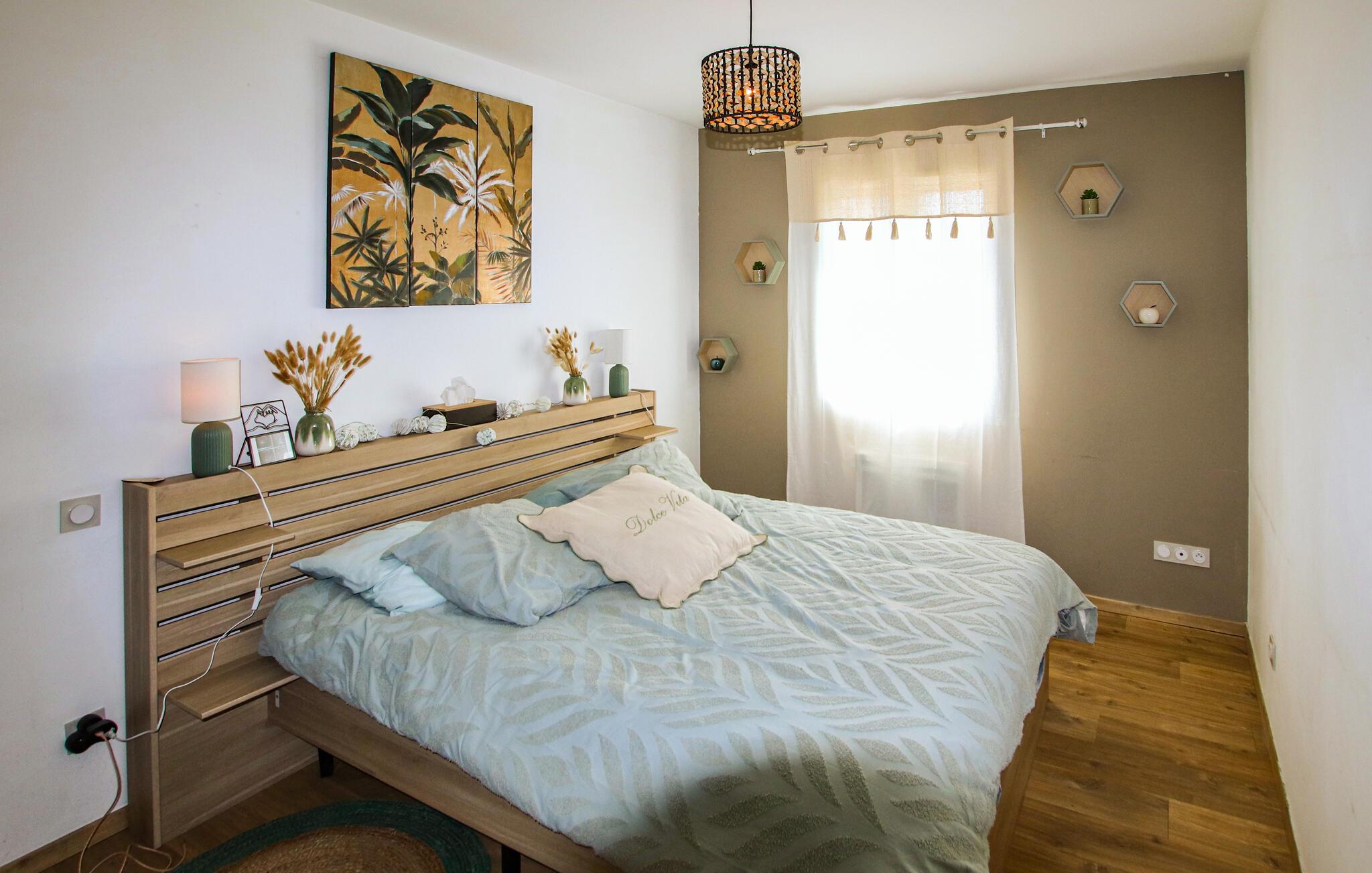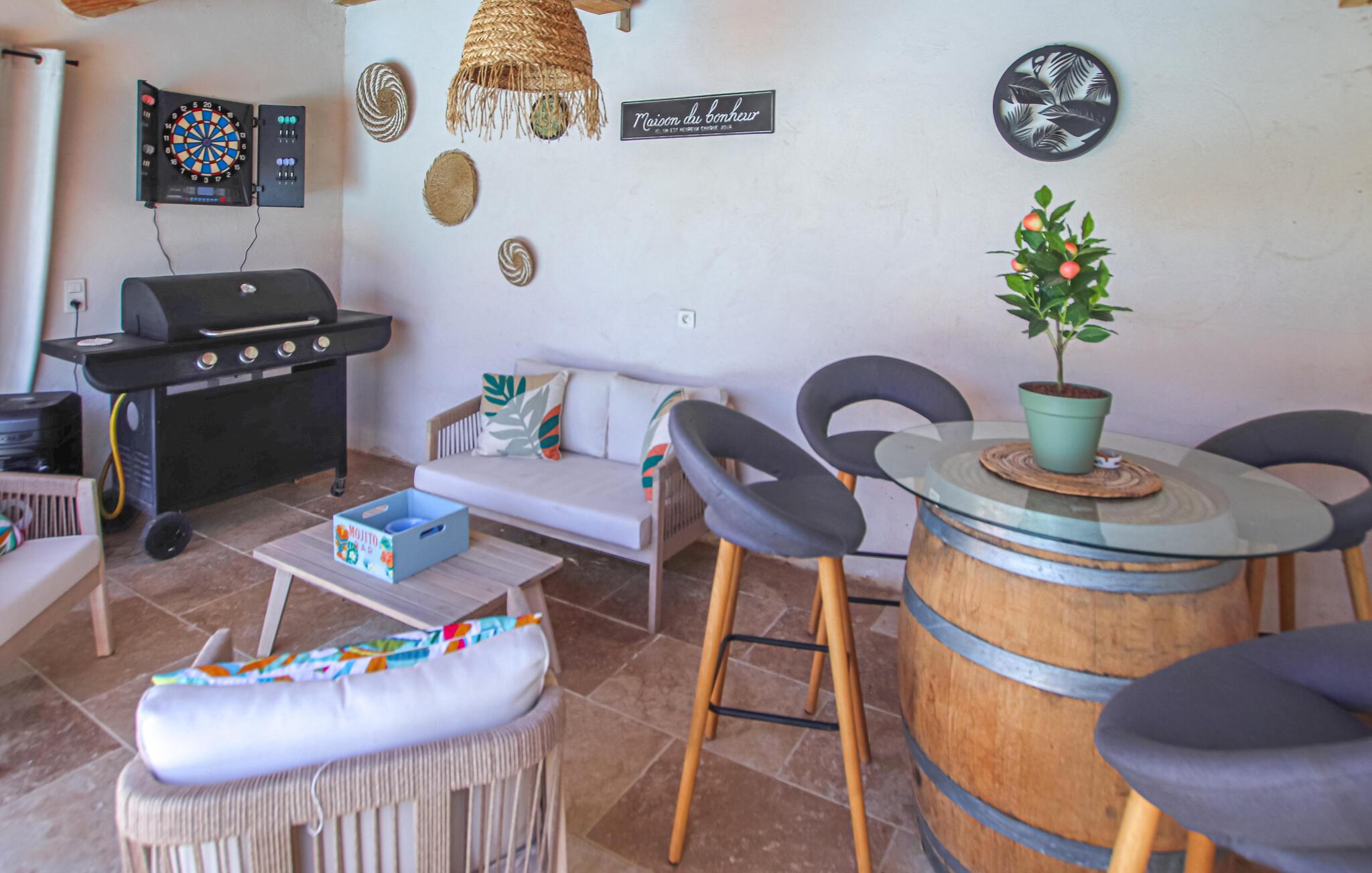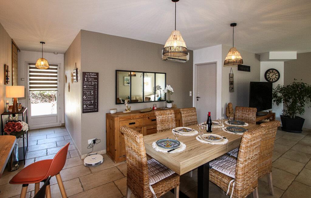 Ihr komfortables Ferienhaus verspricht entspannte Tage im Herzen der Provence. Freuen Sie sich auf gesellige kulinarische Erlebnisse in der modernen Küche und auf entspannte Mahlzeiten mit Blick ins Grüne. Genießen Sie das stilvolle Ambiente im geschmackvoll eingerichteten Wohnzimmer und machen Sie es sich auf dem einladenden Sofa für einen Filmabend gemütlich.