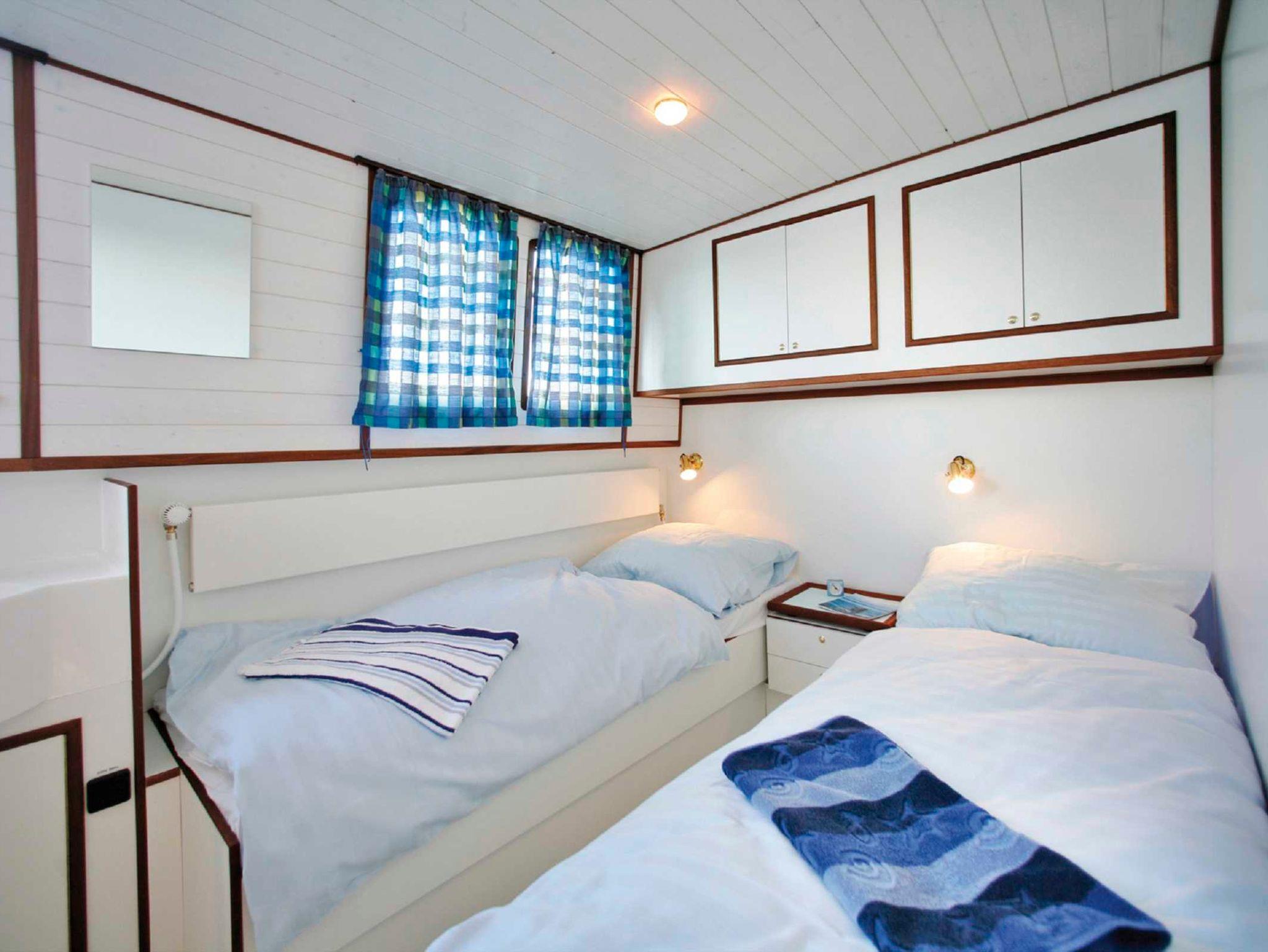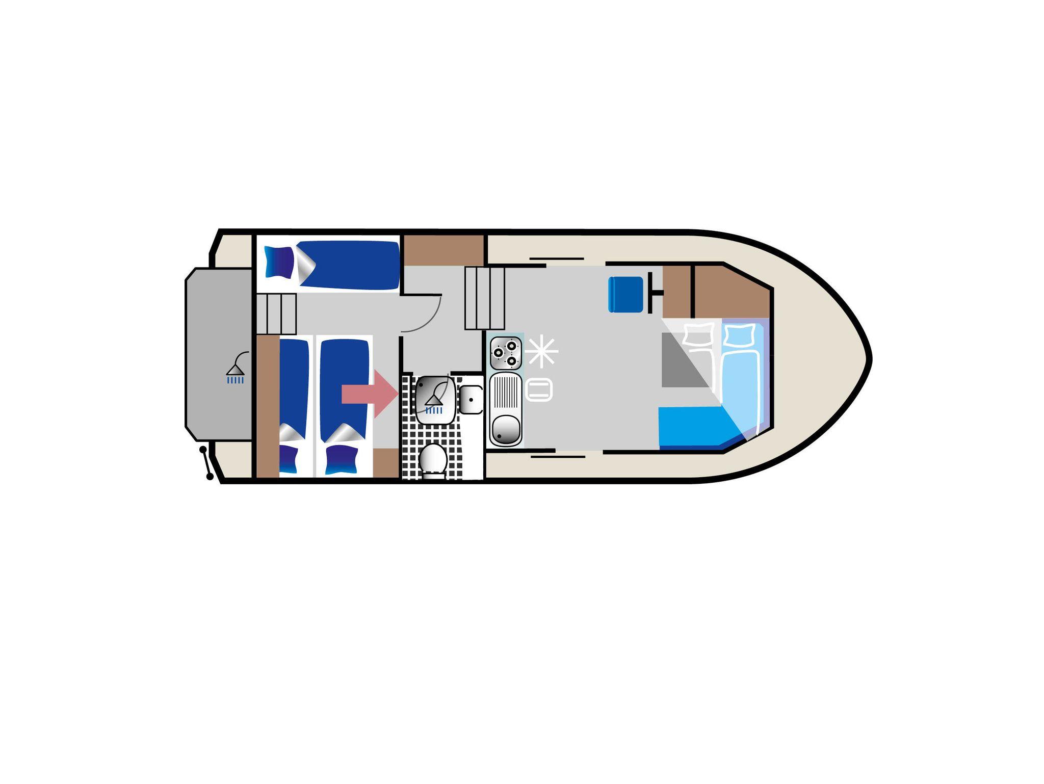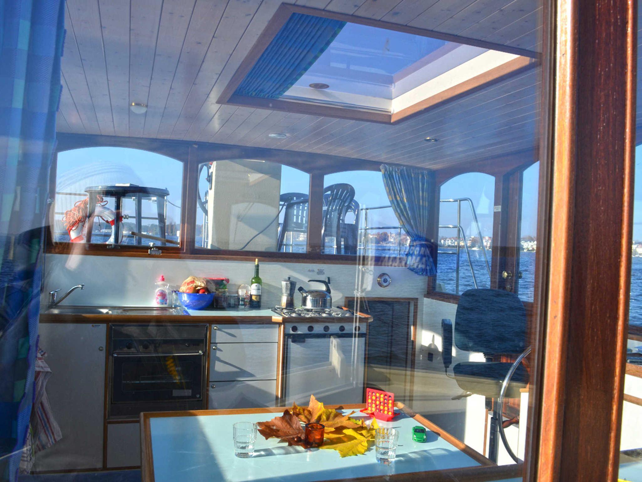 Modernes Hausboot im traditionellen Stil, Salon und Steuerstand mittschiffs erhöht, zweiter Steuerstand auf dem großen Sonnendeck, hydraulisches Bugstrahlruder, große Badeplattform mit Badeleiter und Außendusche (Warm- und Kaltwasser), Anschluss für Landstrom und iPhone, iPad, iPod, MP3-Player oder Laptop, Mückenschutzgitter an den Fenstern der Schlafkabine, Warmwasserheizung, voll ausgestattete Pantry und Salon erhöht im geräumigen Steuerhaus, Anschluss für Landstrom, Wassertank 800 l, Schmutzwassertank 1.000 l*, Dieseltank: 530 l. Heckkabine mit einer Doppel- und einer Einzelkoje, ideal für Paare oder kleine Familien, Nasszelle mittschiffs.