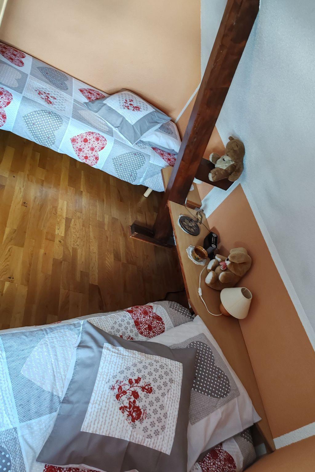 The gîte comprises: - 1 fully-equipped kitchen: oven, dishwasher, microwave, coffee machine, kettle, toaster, various frying pans, etc. - 1 living room with sofa bed, armchair, coffee table, bookcase with many books, mini-stereo with charging station for Iphone, TV (TNT HD) with DVD player (DVDs available free of charge) - 1 dining area with a large table and 6 chairs. 1 bedroom with a 160 x 200 bed, two bedside tables, a wardrobe and a cot. 1 bedroom with two separate 90 x 190 beds, wardrobe and bedside tables. - 1 WC separate from the showers. - 1 shower room with shower, washbasin, washing machine and storage cupboard for towels (provided free of charge). - 1 large covered terrace with barbecue and garden furniture. On the ground floor you will find a room dedicated to the various options we can offer you, such as breakfasts, table d'hôtes, etc.
