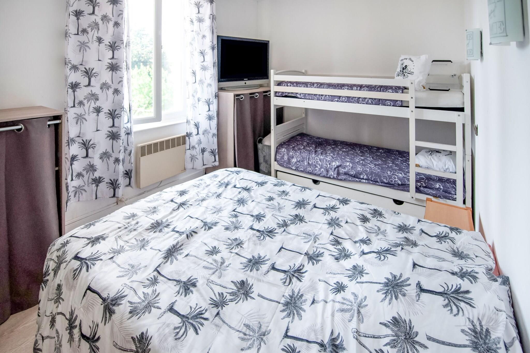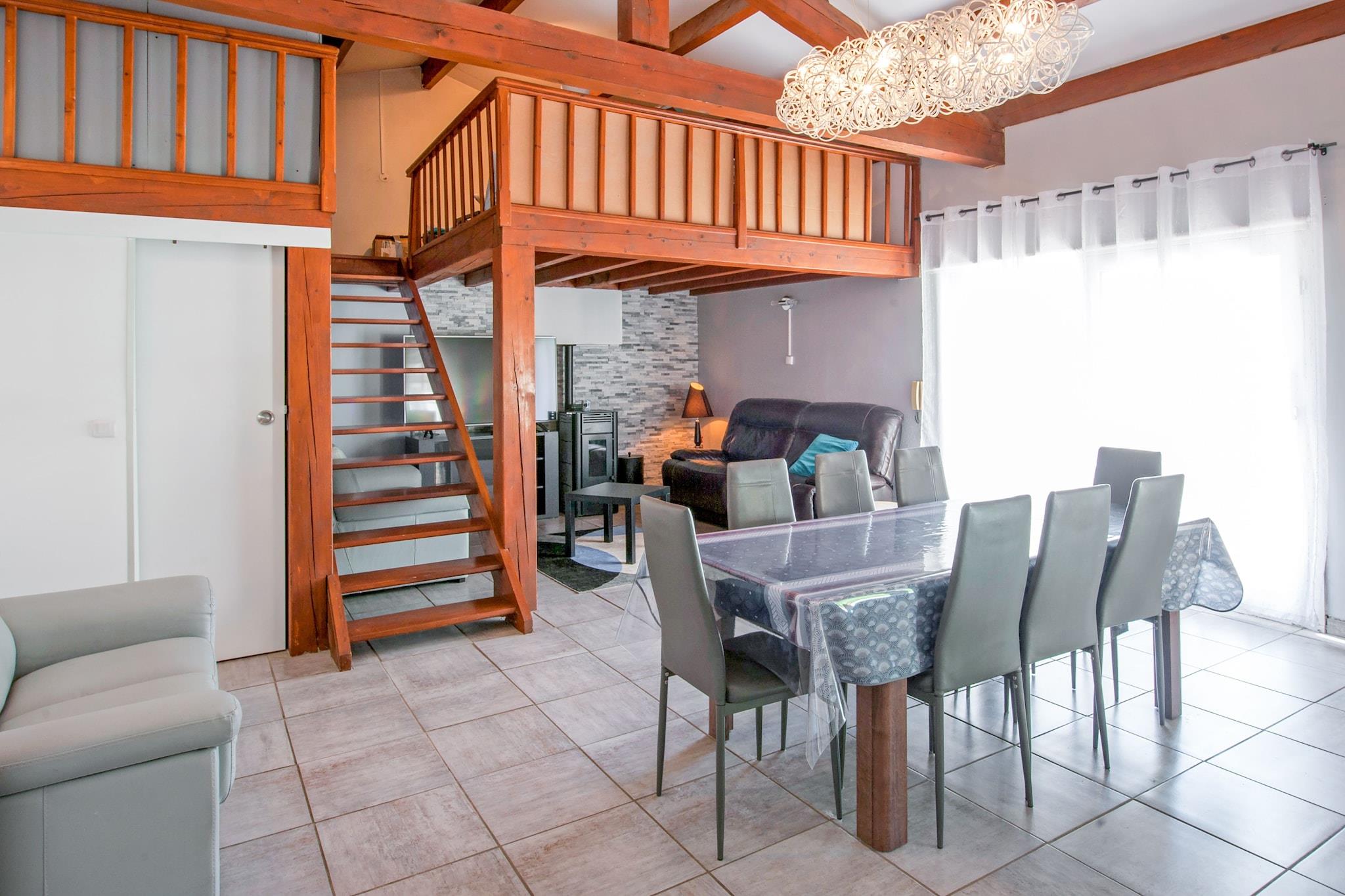 Ground floor: (Living room(TV, seating area), dining room(dining table(10 persons)), Kitchen(electric kettle, toaster, hood, oven, microwave, dishwasher, fridge-freezer), Bedroom with bathroom(double bed(160 x 200 cm), Bubble bath, shower, toilet), toilet, washing room(tumble dryer, washing machine, ironing board, iron)) mezzanine: (double bed) On the 1st floor: (bedroom(double bed(140 x 200 cm), bunk bed), Bedroom with bathroom(double bed(180 x 200 cm), shower), bathroom(shower, washbasin, toilet)) cot, air conditioning, garden, garden furniture, BBQ, parking, swimming pool(private, 8 x 4 m.)