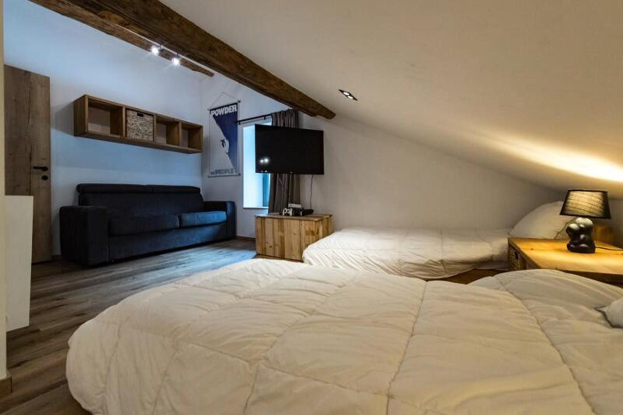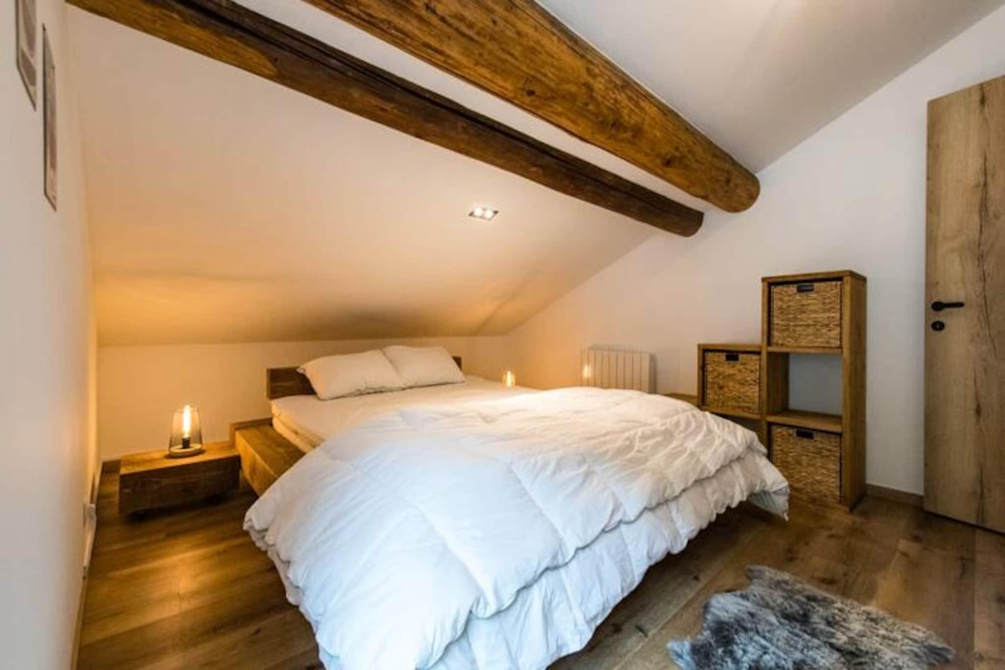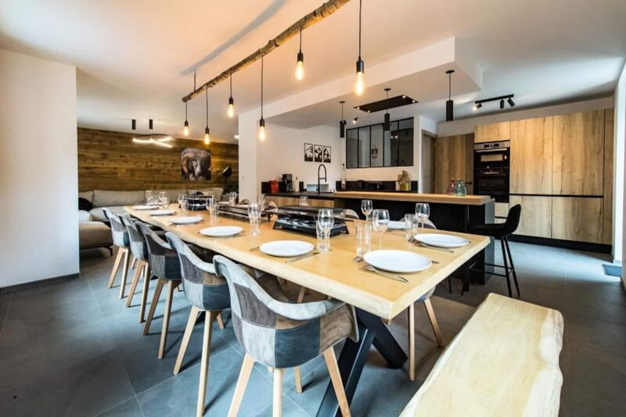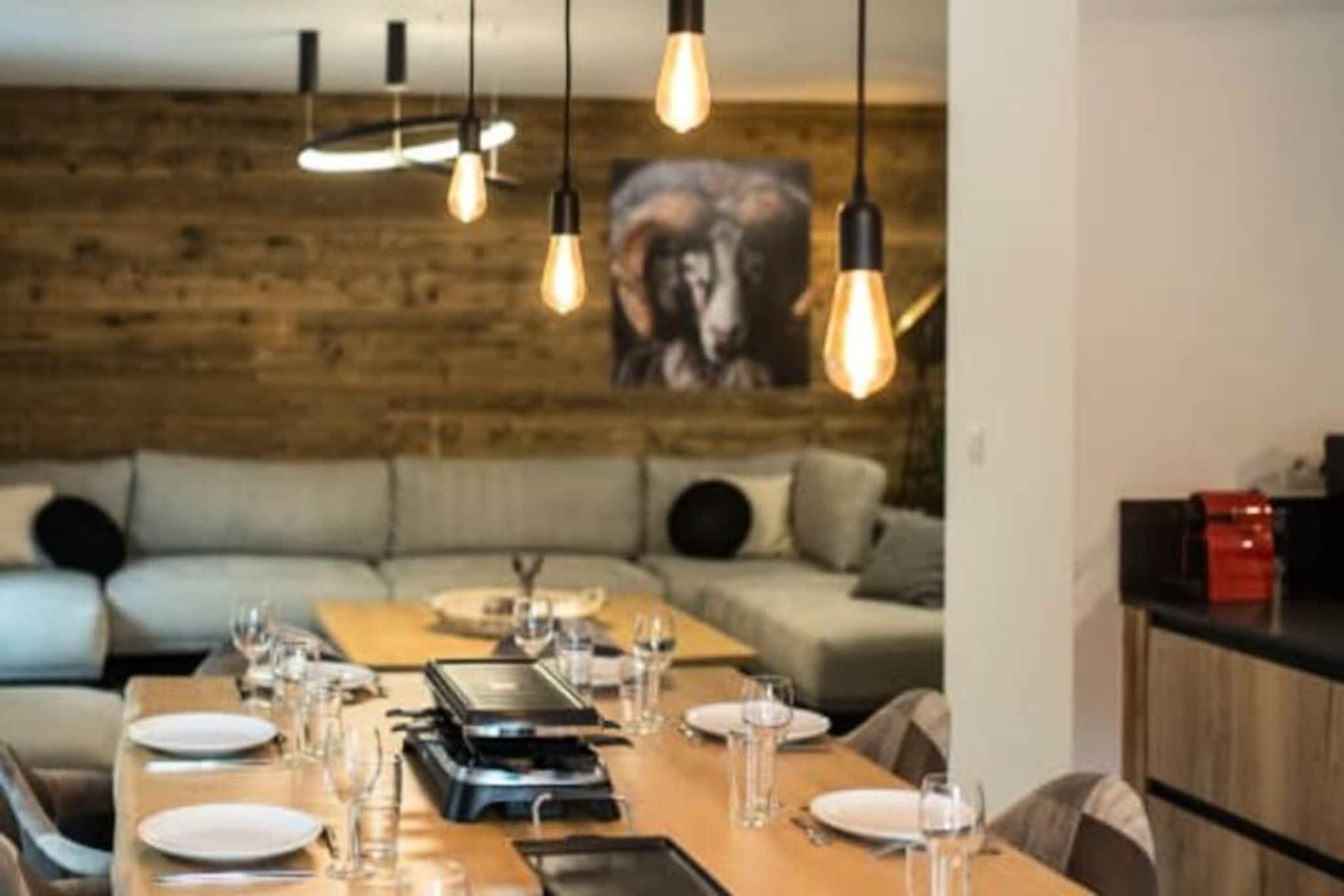High in the heart of the French Alps, this stunning 220m² triplex chalet offers a harmonious blend of traditional alpine charm and modern luxury. With breathtaking views of the surrounding peaks, this fully renovated retreat is designed to host up to 15 guests in comfort and style. Whether you're planning a winter ski adventure or a summer escape, this chalet provides the perfect base for unforgettable mountain experiences. The spacious interior boasts six beautifully appointed bedrooms and five modern bathrooms, ensuring ample space and privacy for all. The main living area features a cozy lounge with a streaming-enabled TV, a dining area that comfortably seats all guests, and a fully equipped open kitchen with everything from raclette grills to coffee machines. A second living room with its own kitchen on the lower level adds extra convenience and independence for larger groups. Upstairs, a dedicated children’s room with four single beds, a sofa, and a PS3 gaming console ensures younger guests are entertained. Step outside onto one of the two large terraces, perfect for soaking up the alpine sun or enjoying meals al fresco. The chalet also offers ski lockers at the base of the Orelle cable car, secure bike storage, and ample free parking nearby. Located just 1 km from the Orelle \