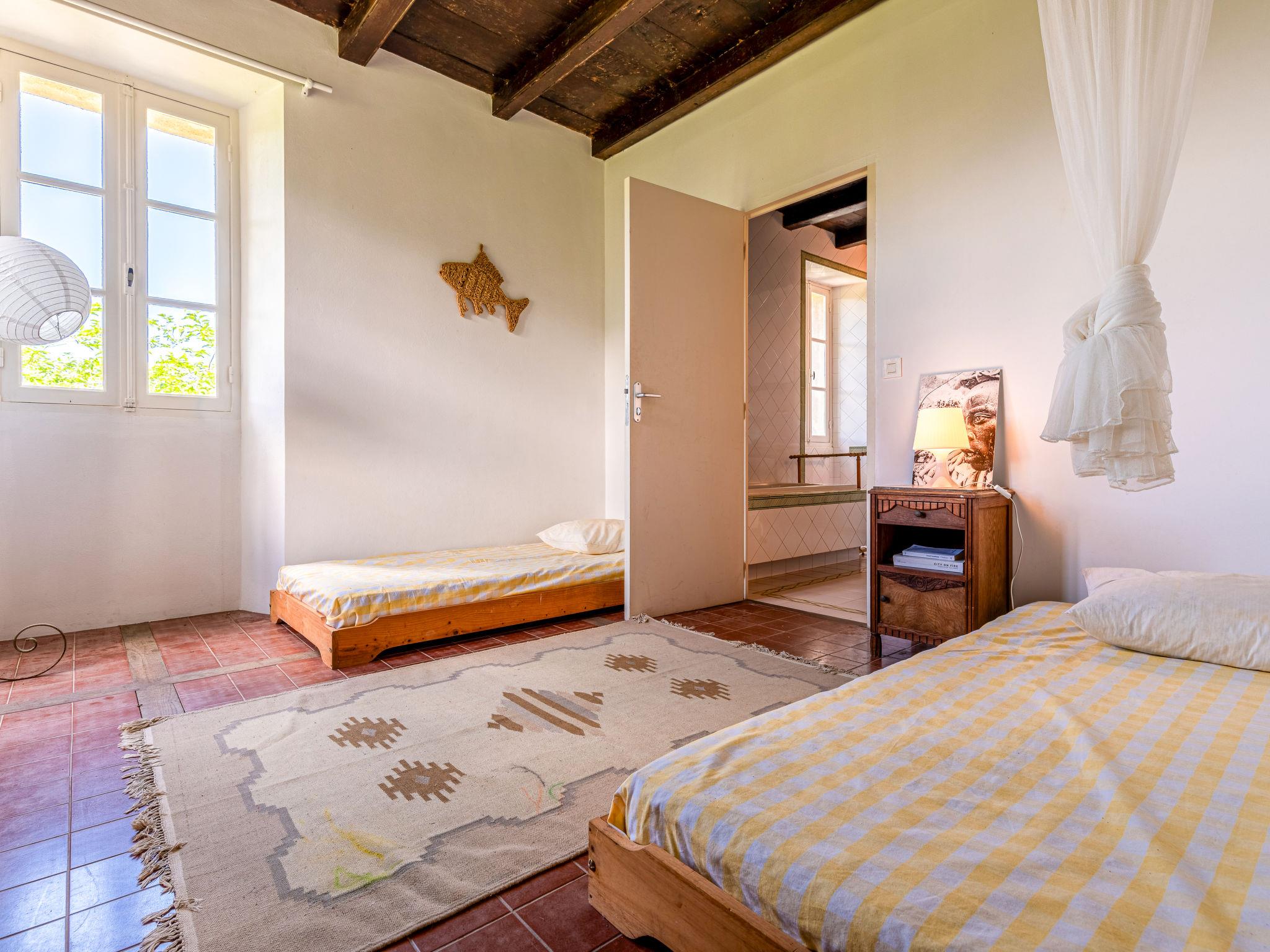 "Maison Penta", 5-room house 90 m2 on 3 levels. Bright, comfortable and rustic furnishings: living/dining room with dining table. Exit to the terrace. Open kitchen (oven, dishwasher, toaster, kettle, microwave, electric coffee machine). Air-conditioning. Upper floor: (exterior staircase). 1 room with 1 french bed (160 cm, length 200 cm). 1 room with 2 beds (90 cm, length 190 cm). Bath/WC. Heating, air-conditioning. 2nd upper floor: with sloping ceilings, 3 rooms, each room with 2 beds (90 cm, length 190 cm). Shower/WC. Heating, air-conditioning. Terrace 50 m2 partly roofed. Terrace furniture, sitting area. Very beautiful view of the mountains, the valley and the countryside. Facilities: washing machine. Internet (WiFi). Please note: suitable for families. Non-smokers only. Smoke alarm. Offer by a private individual according to Art. 155, IV of CGI.