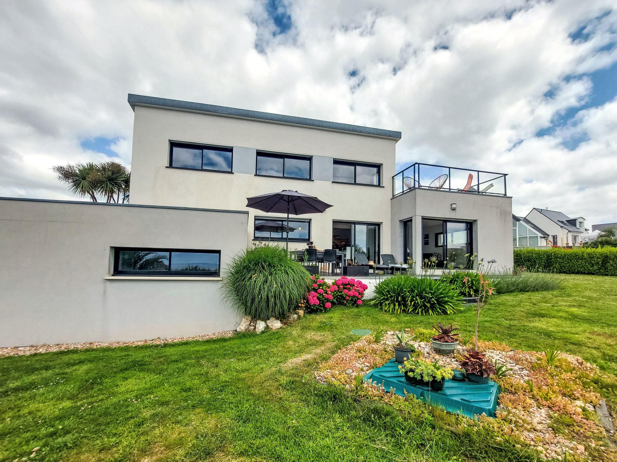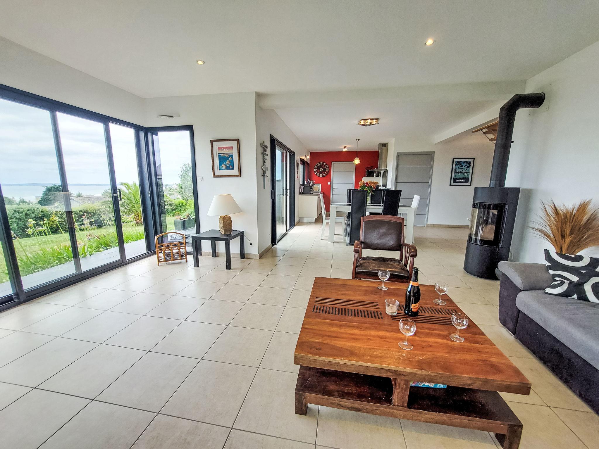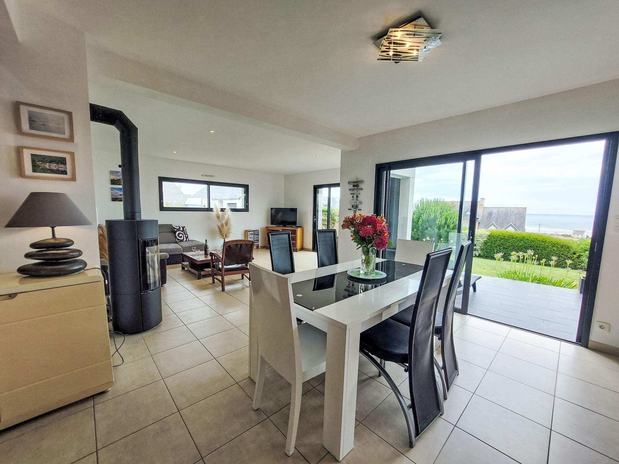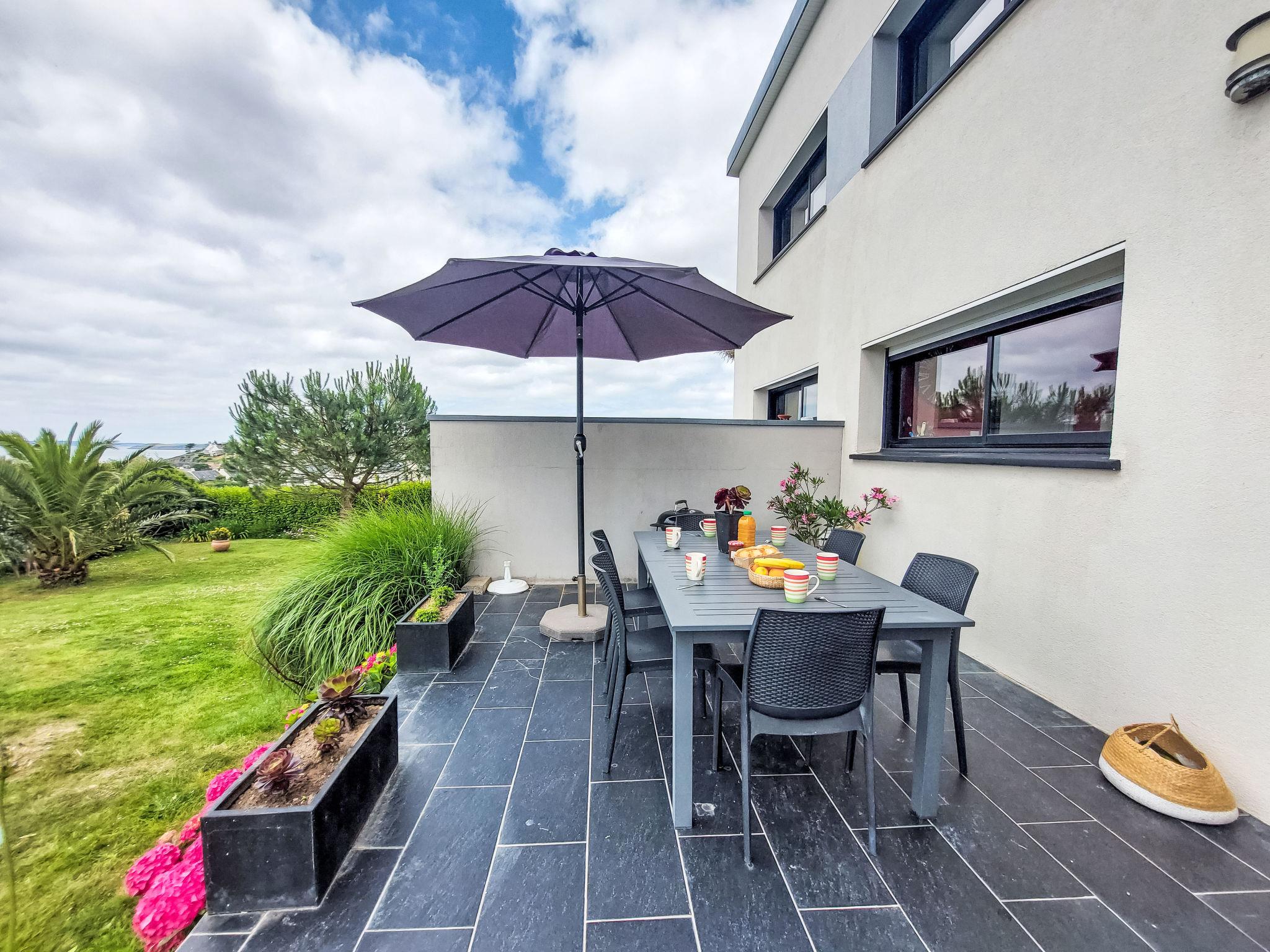 "L'Iroise", 4-room house 160 m2 on 2 levels. Beautiful and modern furnishings: living/dining room with Scandinavian wood stove, dining table and satellite TV. Exit to the terrace. 1 room with 1 french bed (140 cm, length 190 cm). Open kitchen (oven, dishwasher, 3 induction hot plates, toaster, kettle, microwave, freezer, electric coffee machine) with bar. Shower/WC. Underfloor heating. Upper floor: 1 room with sloping ceilings with 1 french bed (140 cm, length 190 cm). 1 room with 2 beds (90 cm, length 190 cm). Bathroom, sep. WC. Electric heating. Parquet floors. Balcony, terrace, south facing position. Terrace furniture, balcony furniture, electric barbecue, deck chairs (4). View of the sea and the bay. Facilities: washing machine, iron, children's high chair, baby cot, hair dryer. Internet (WiFi, free). Please note: non-smoking house. Maximum 1 pet/ dog allowed. Smoke alarm. When there are less than the maximum number of guests staying at the property, not all of the bedrooms will be available for use. Offer by a private individual according to Art. 155, IV of CGI.