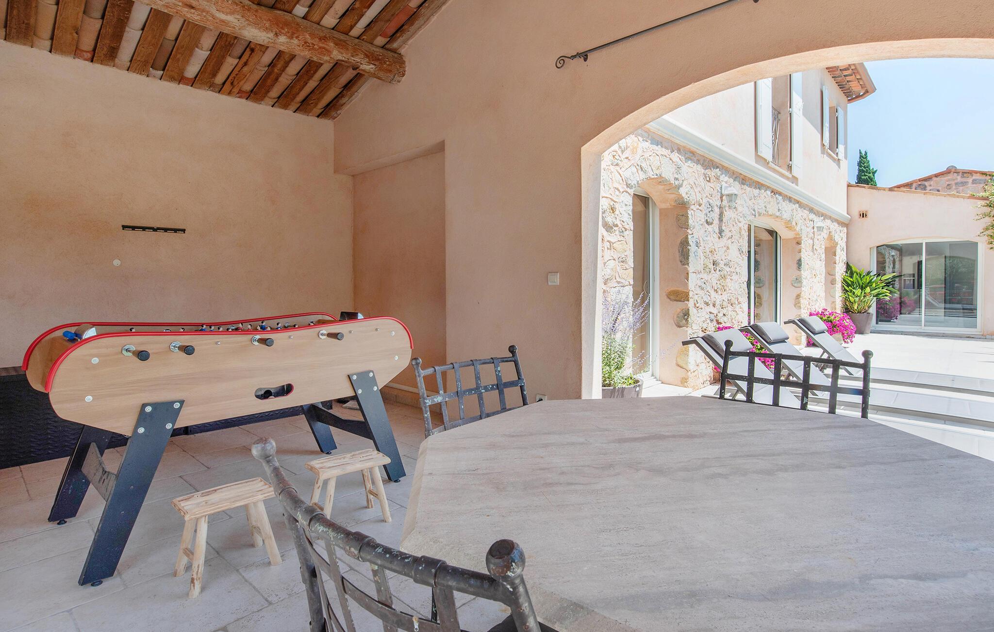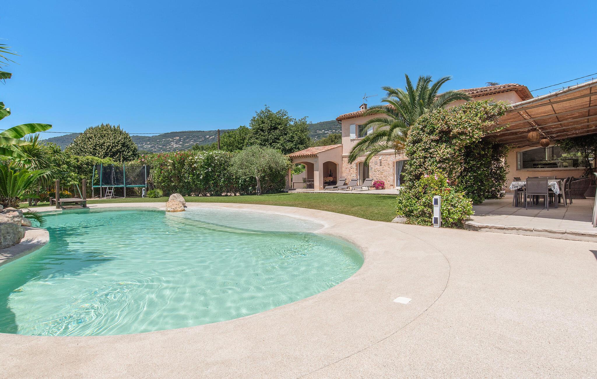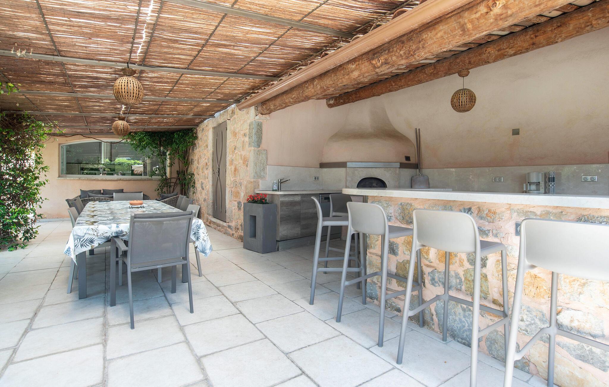 Der gepflegte Außenbereich ist eine Ruheoase, in der Sie das mediterrane Klima in vollen Zügen genießen werden. Der herrliche Pool ist mit einem kleinen Strand versehen und liegt im Herzen des uneinsehbaren Gartens. Lassen Sie Ihre Kinder auf dem Trampolin toben, vergnügen Sie sich beim Tischfußball, plaudern Sie bei einem Glas Wein im Schatten und bereiten Sie in der Sommerküche leckere Beilagen für ein Grillfest vor.