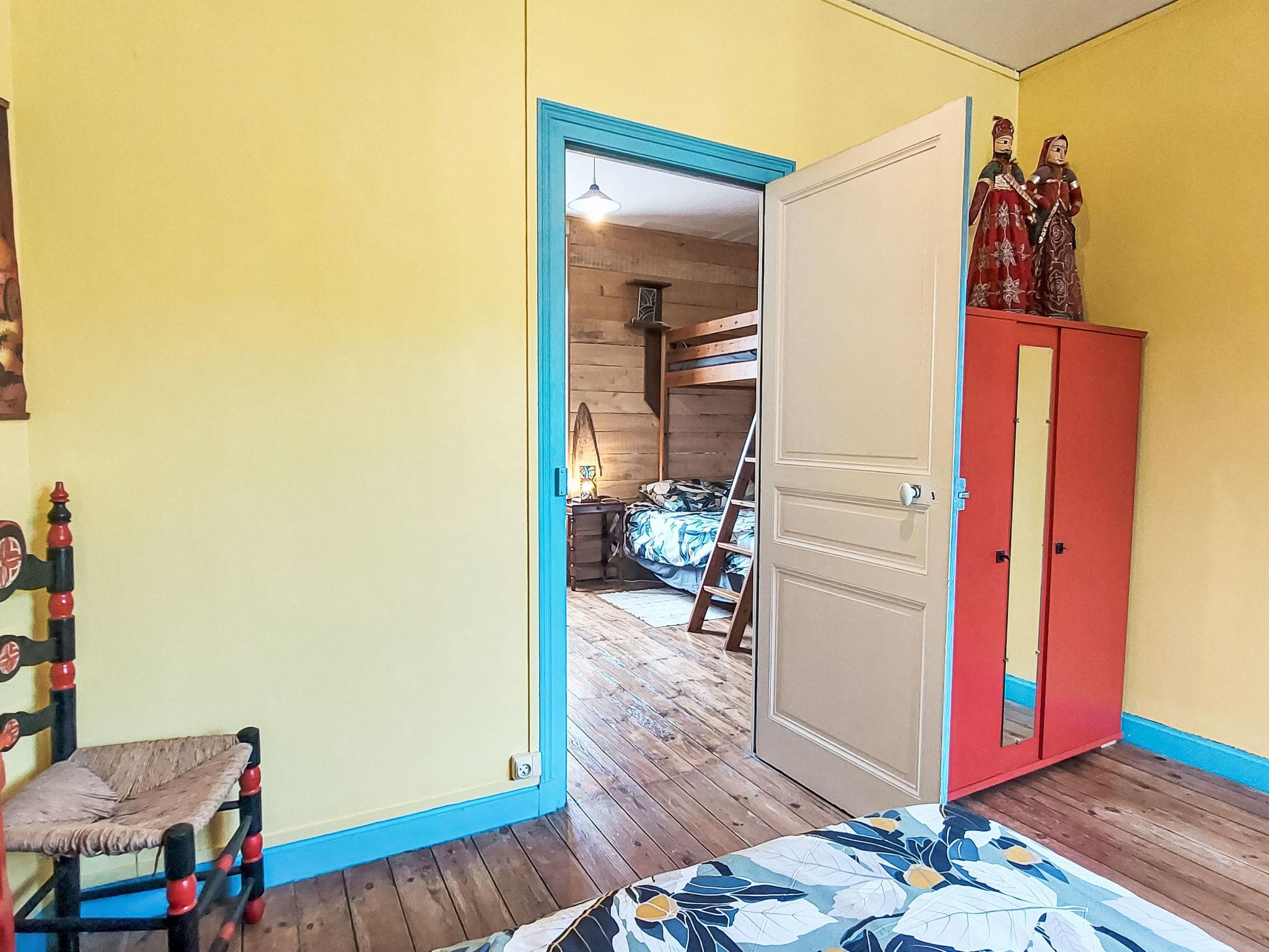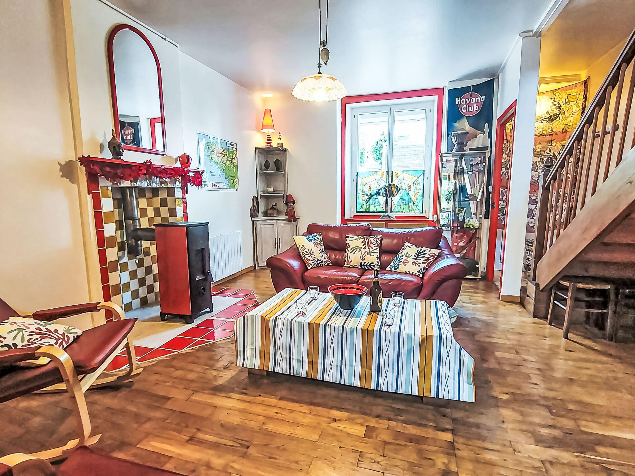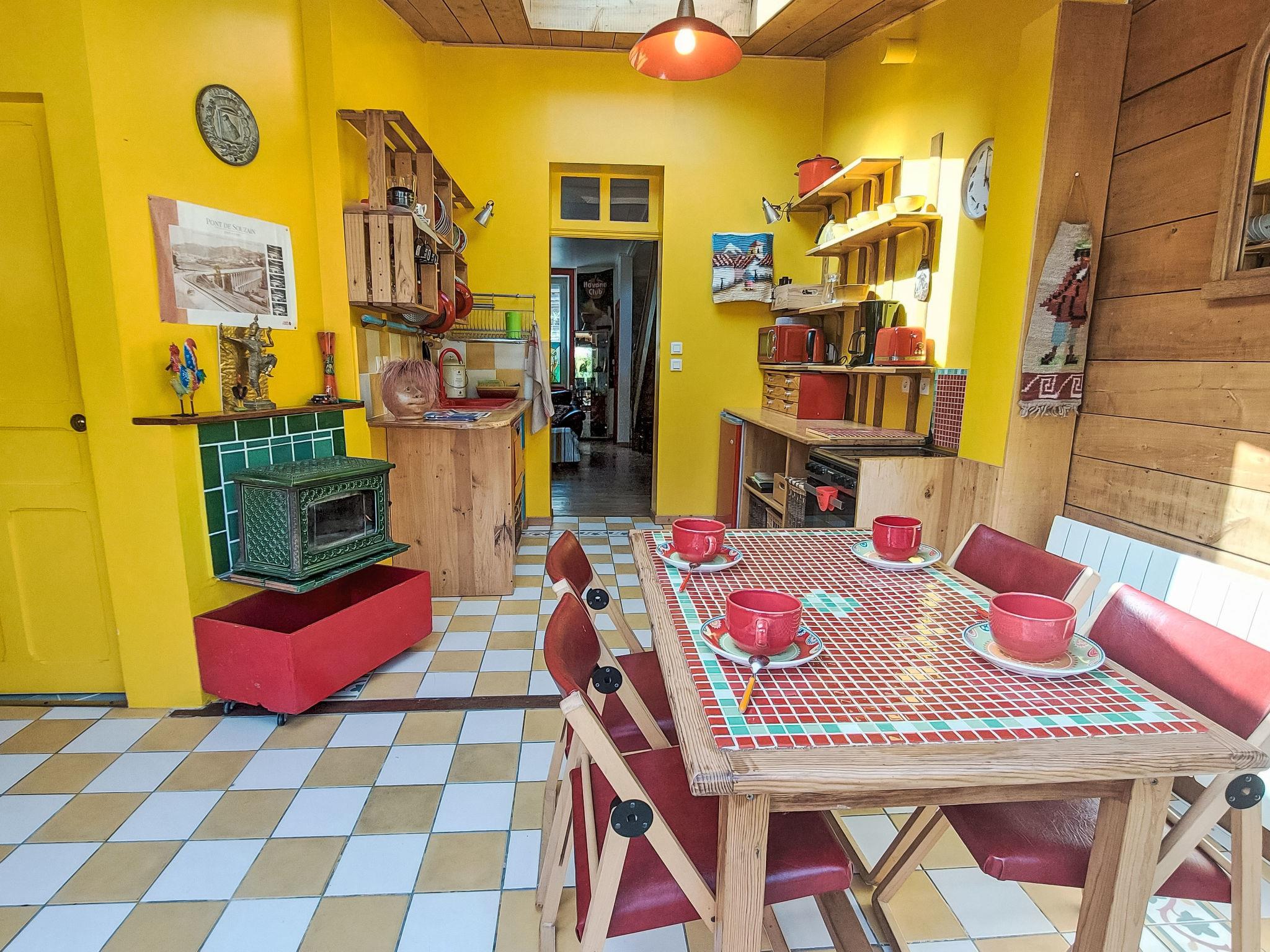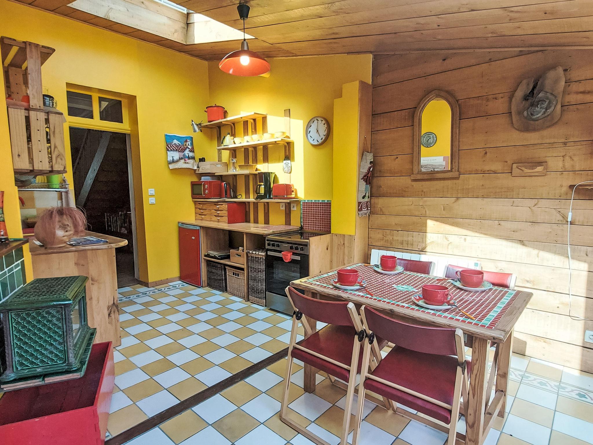 "L'Oté rouge", 3-room terraced house 80 m2 on 2 levels. Practical and wooden furniture furnishings: living room with TV, radio and wood-burning stove. Small, open kitchen (oven, dishwasher, 4 induction hot plates, toaster, kettle, microwave, freezer, electric coffee machine) with dining table. Exit to the garden. Shower/WC. Upper floor: walk-through room with 1 french bed (140 cm, length 190 cm). Interconnecting room with 1 x 1 bunk beds (90 cm, length 190 cm), 1 french bed (140 cm, length 190 cm). Patio. Terrace furniture, barbecue (portable), deck chairs (2), box-room. Facilities: washing machine. Internet (WiFi, free). Please note: non-smoking house. Smoke alarm. Bed layout is flexible. There are more sleeping options available than the maximum number of people allowed which may, however, not be exceeded.
