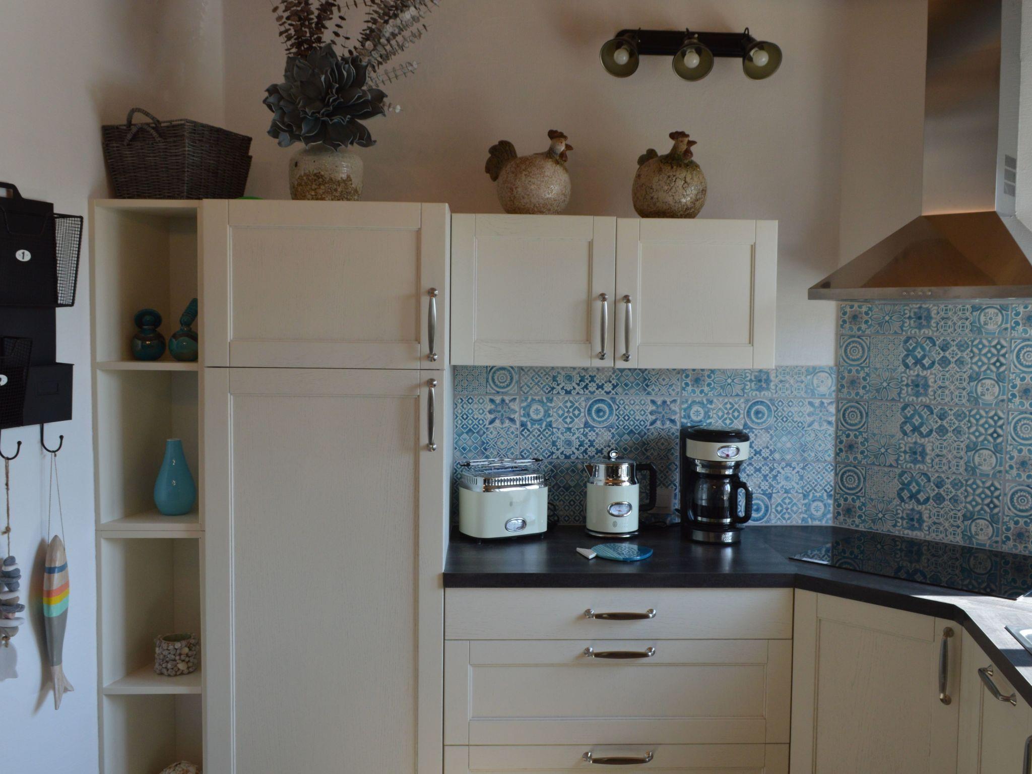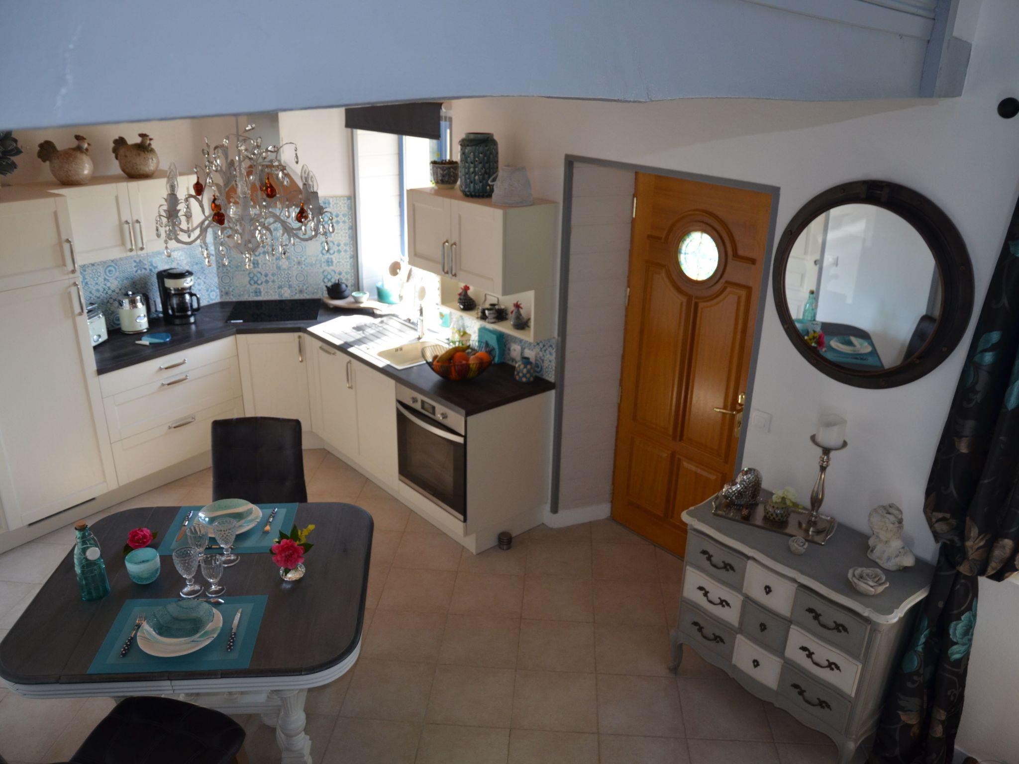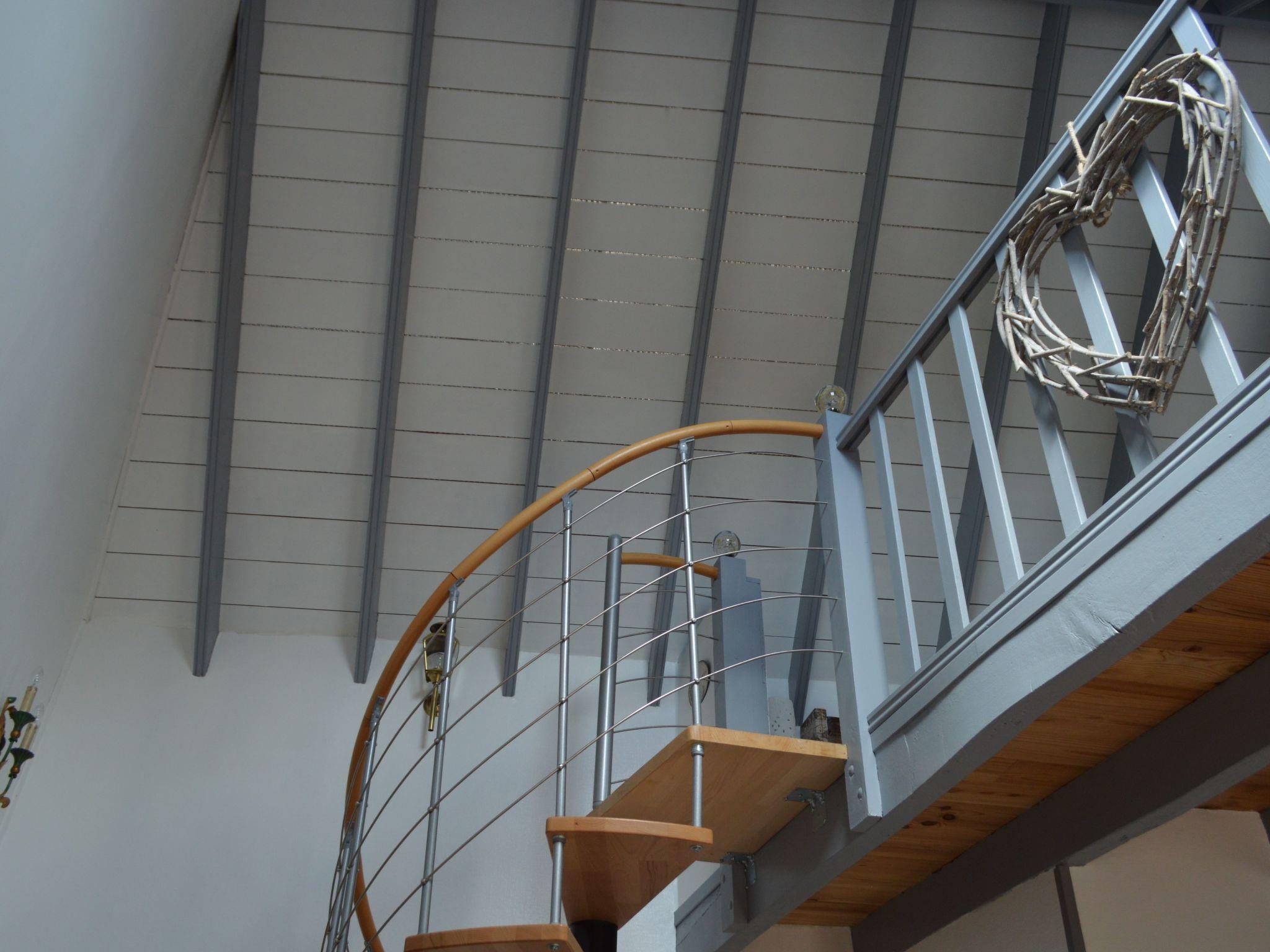 The ground floor comprises a living room with a wood-burning stove, a flat-screen TV and a two-seater leather sofa and lounger. Next to the living room is a new, fully-equipped built-in kitchen with induction hob, oven, microwave, coffee maker, kettle, teapot, toaster, dishwasher and dining area. Next to the kitchen is a bathroom with shower and washbasin, hairdryer, washing machine and WC. A spiral staircase leads to the first floor, where there is a mezzanine bedroom with a 160*200 bed, cupboard and wardrobe.