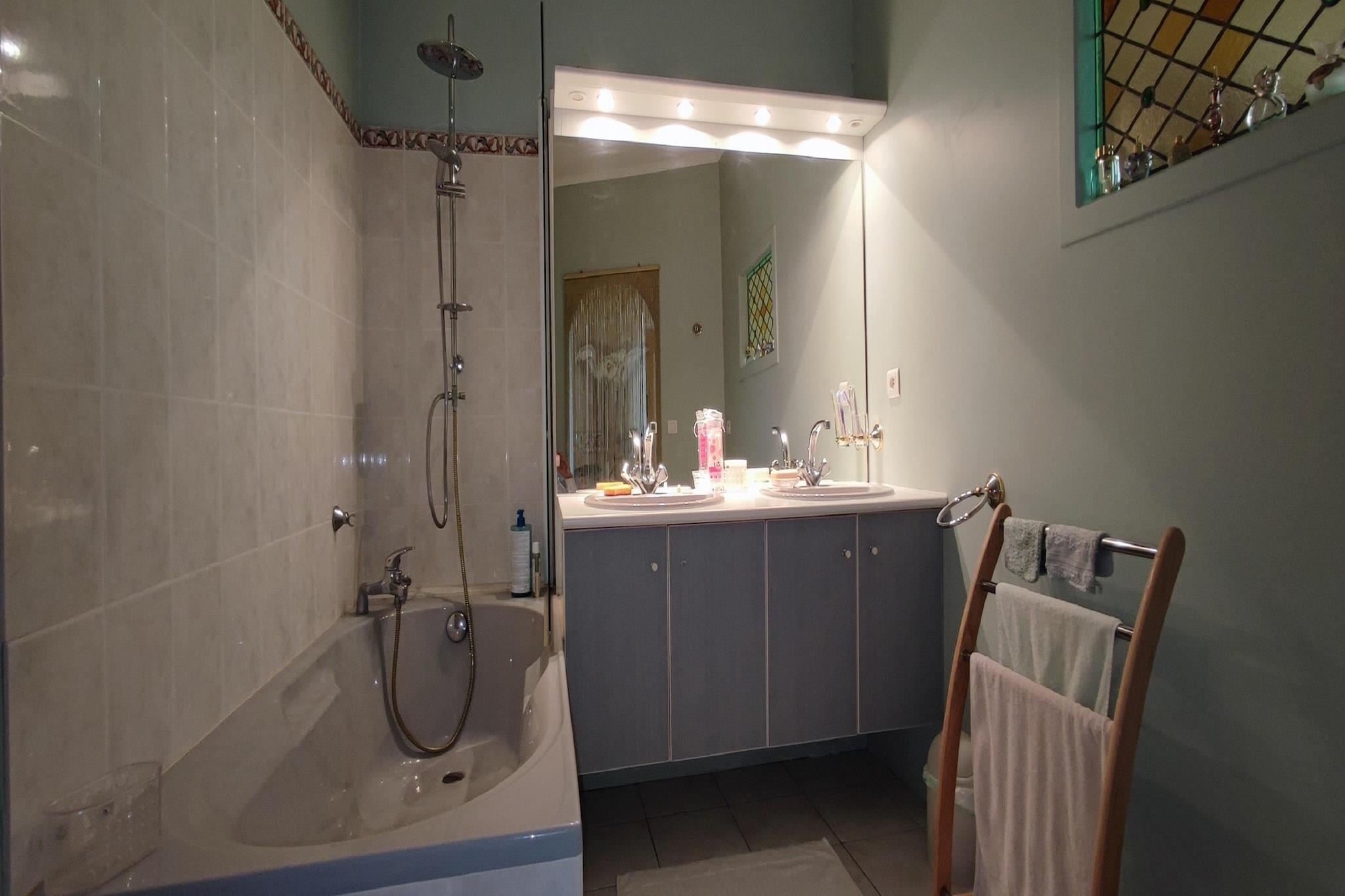 Ground floor: (Living room(TV, fireplace, seating area), dining room(dining table), Kitchen(toaster, cooker, hood, coffee machine, oven, microwave, dishwasher, fridge-freezer), toilet, terrace) On the 1st floor: (bedroom(double bed), bedroom(double bed), bedroom(single bed), bedroom(double bed), bathroom(bath tub, washbasin, toilet), bathroom(bathtub with shower, washbasin, toilet), bathroom(shower, washbasin, toilet)) garden doors, courtyard, terrace, garden, garden furniture, sun loungers, BBQ, parking, swimming pool(private, 12 x 5 m., opened from May upto and including Oct), boules court, table tennis table