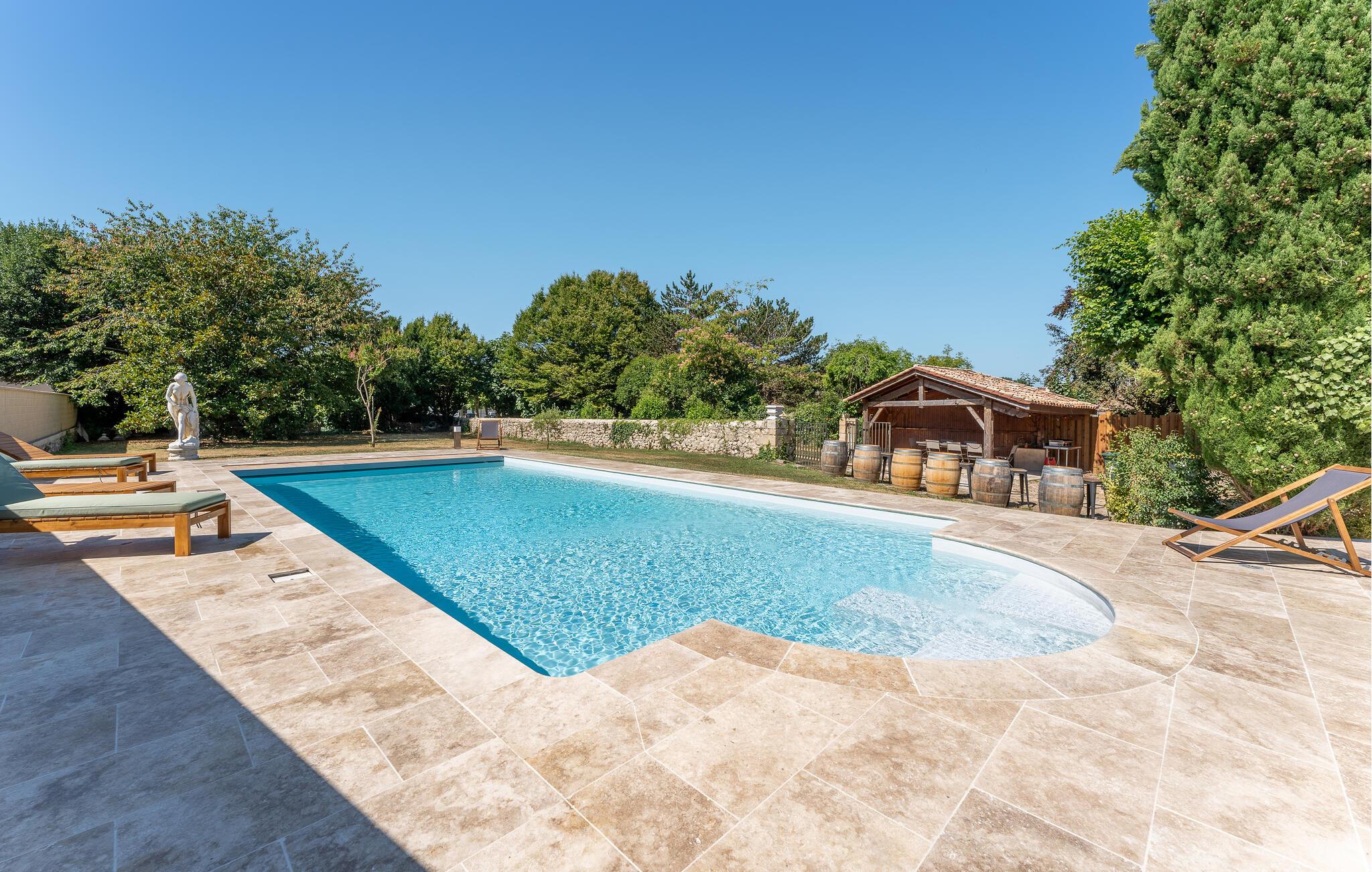 Ziehen Sie morgens gemächlich Ihre Bahnen im herrlichen, kristallklaren Pool oder lassen Sie die friedliche Atmosphäre auf der Sonnenliege oder bei einem sonnigen Frühstück auf der charmanten Natursteinterrasse auf sich wirken. Entspannen Sie im Whirlpool, während die Kinder im weitläufigen, eingezäunten Grundstück ein Picknick veranstalten, und entfachen Sie an lauen Sommerabenden den Grill.