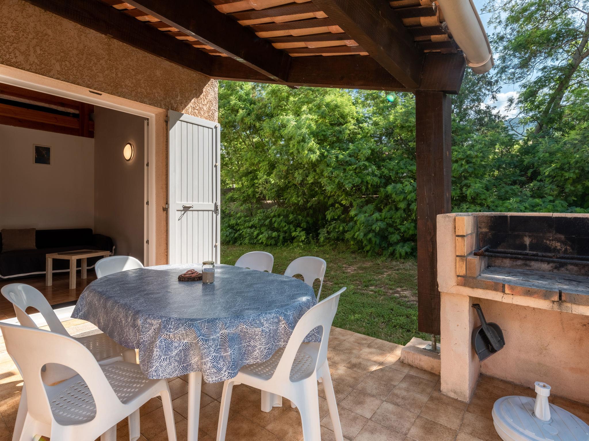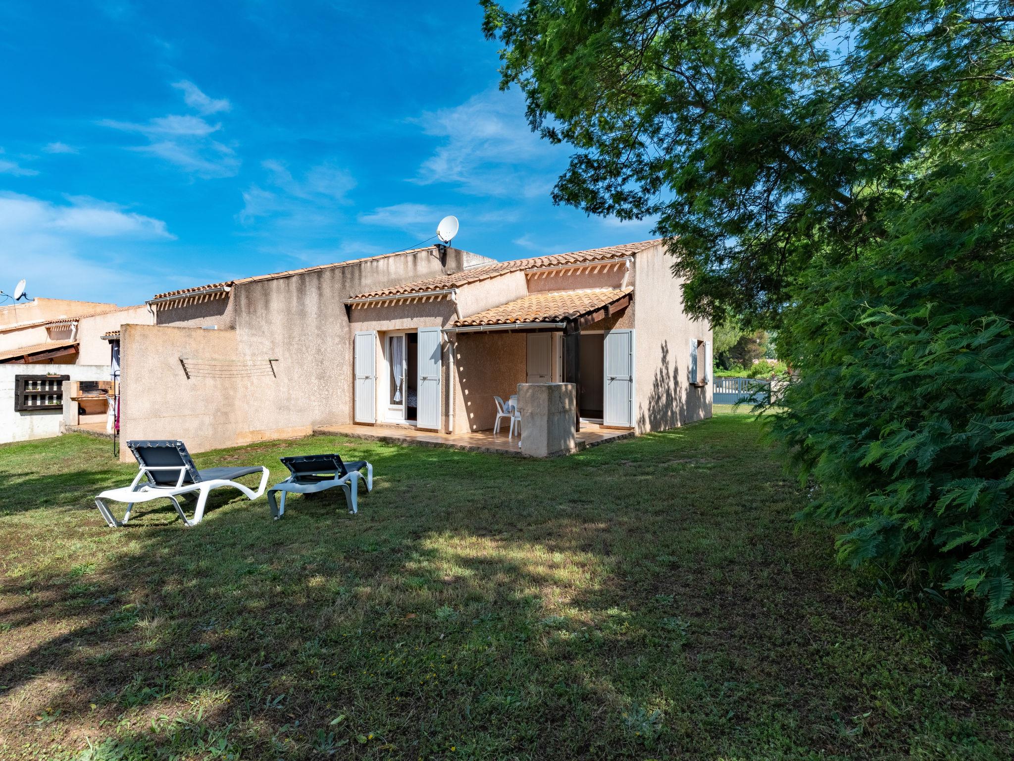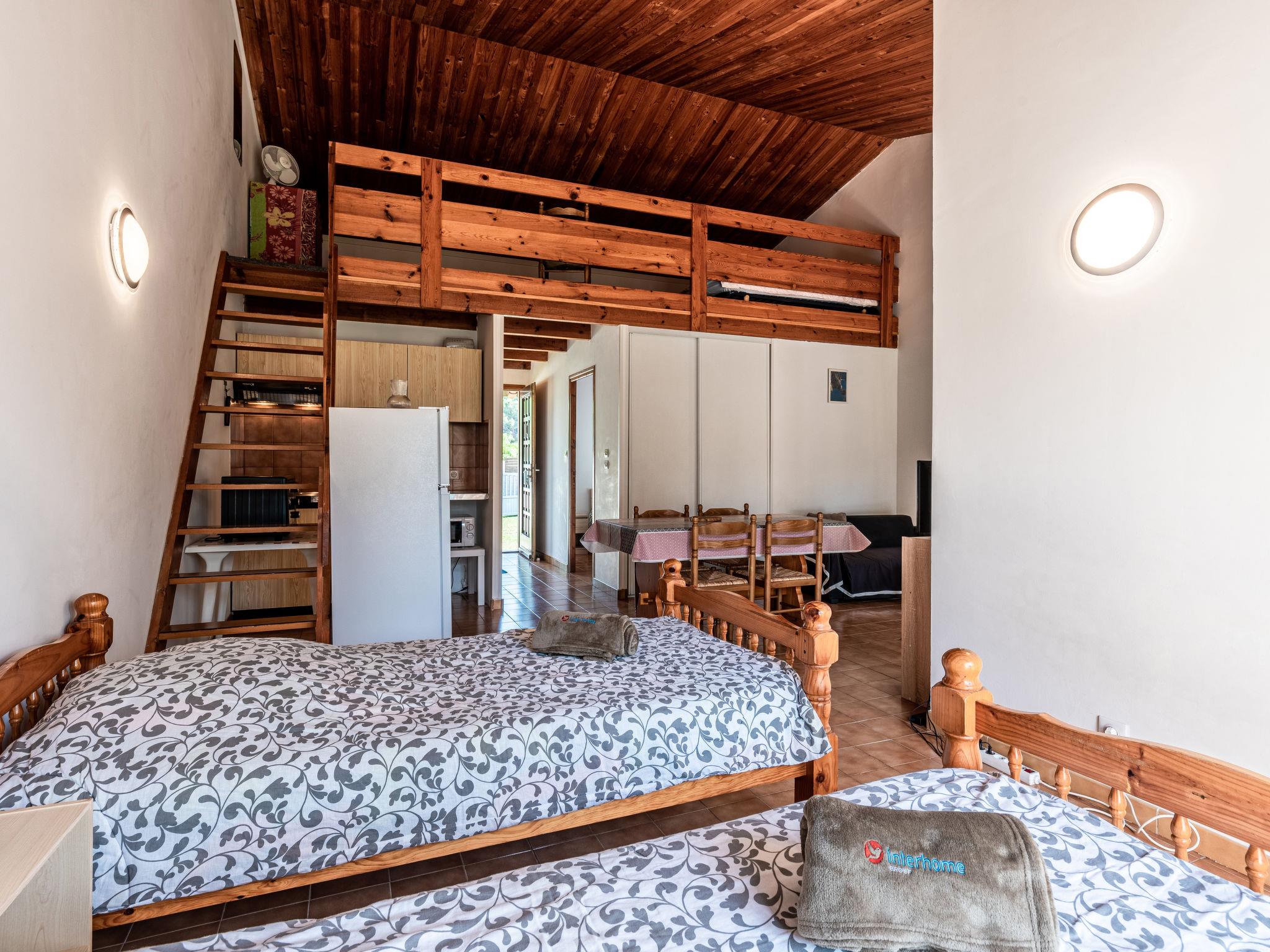 "La Pinède, bungalow 6 pers.", 2-room semi-detached house 65 m2 on 2 levels. Practical and wooden furniture furnishings: living/sleeping room with 2 beds, dining table and satellite TV. 1 room with 1 french bed. Kitchenette (2 hot plates, toaster, kettle, microwave, freezer, grill, electric coffee machine). Shower/WC. Electric heating. Upper floor: open gallery with 2 beds. Terrace 15 m2 partly roofed. Terrace furniture, barbecue. Please note: non-smokers only. Maximum 1 pet/ dog allowed. Smoke alarm. Instead of an enclosed bedroom, some sleeping areas are located in an open-plan area (gallery, alcove, etc.).