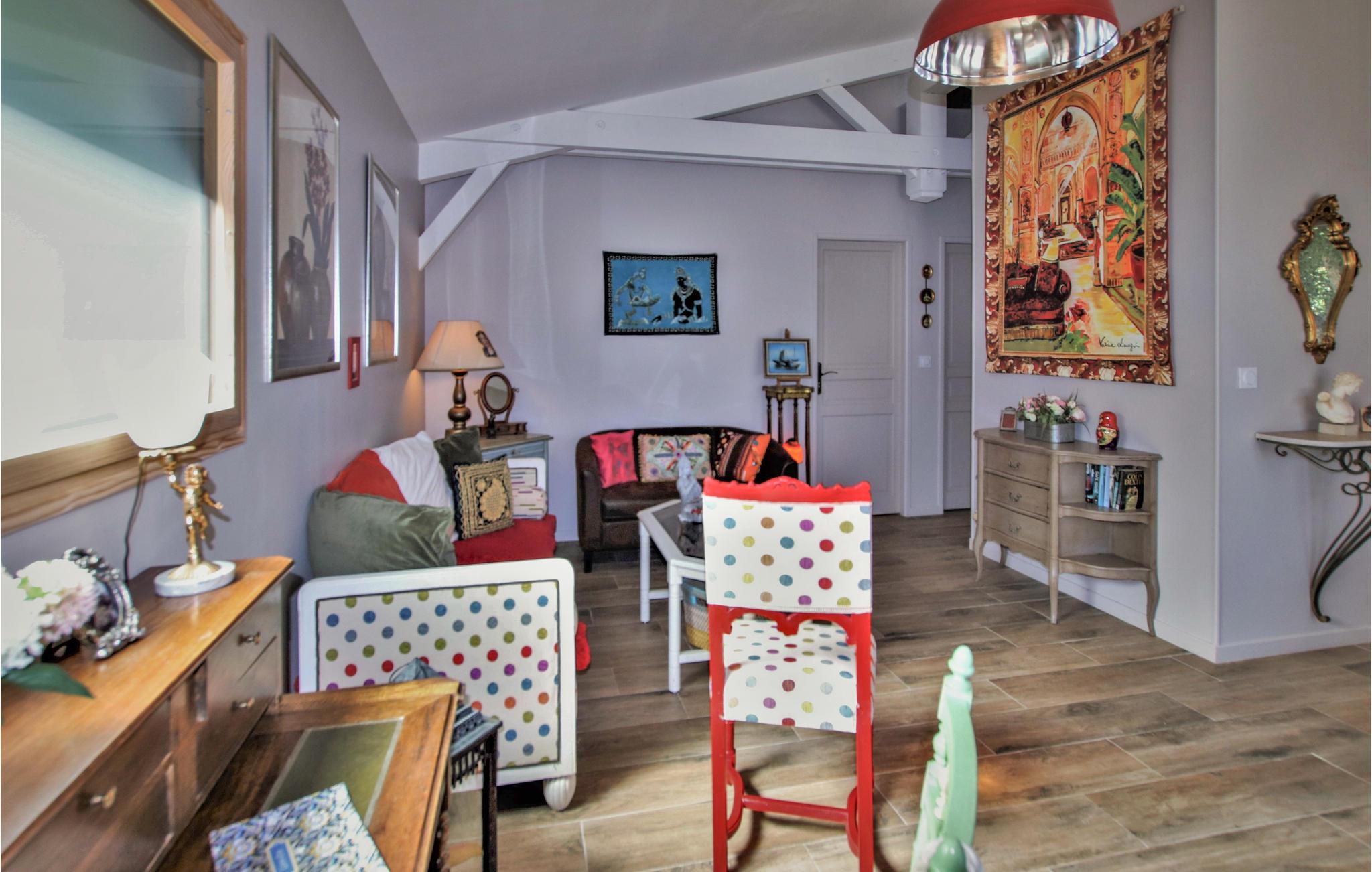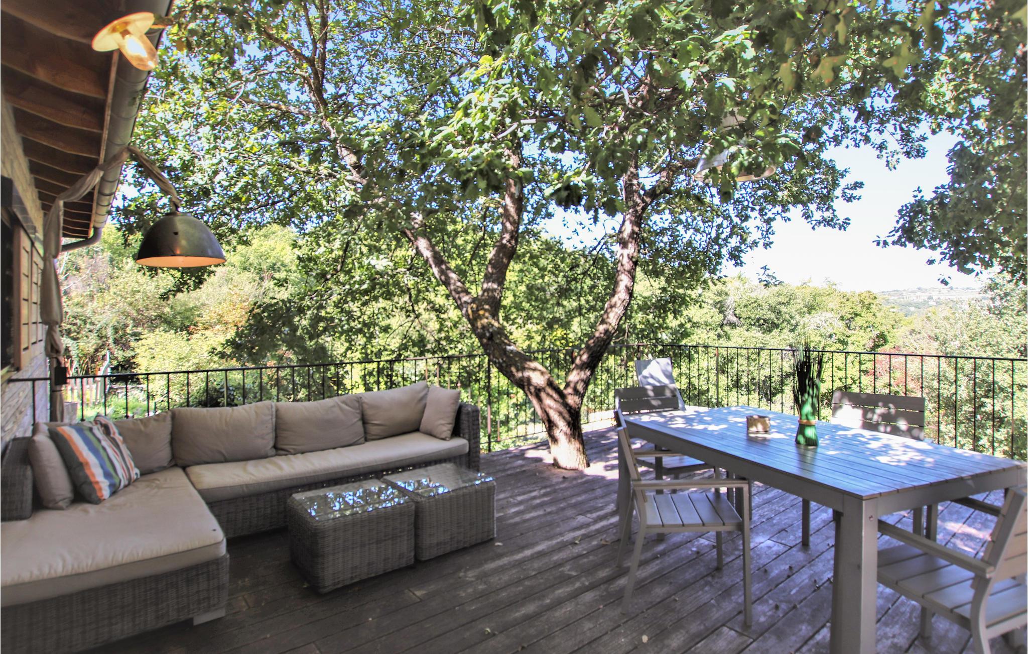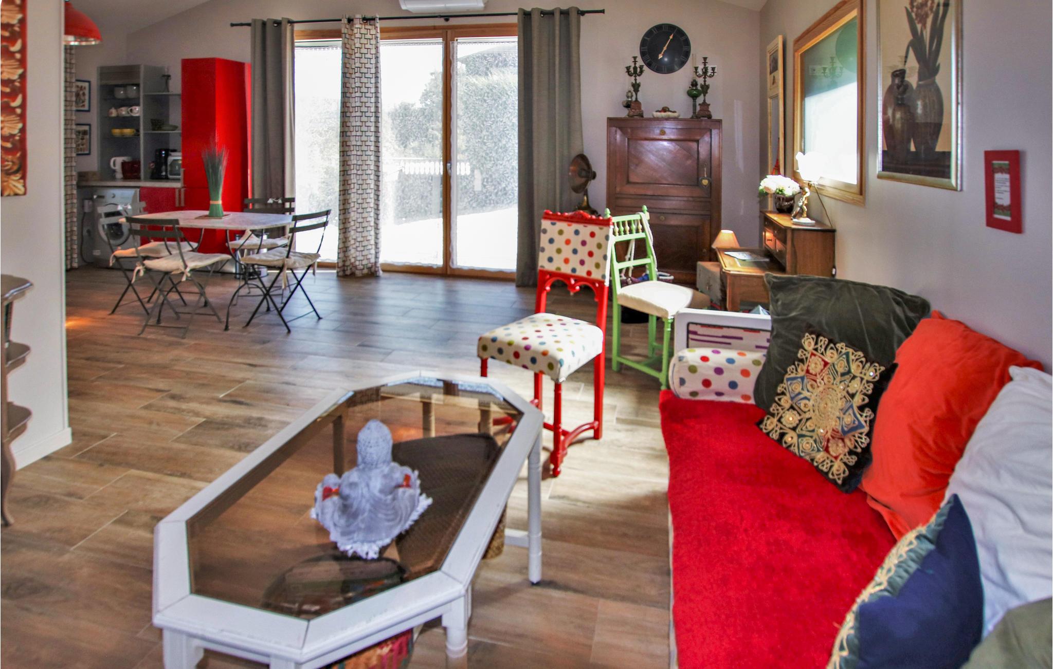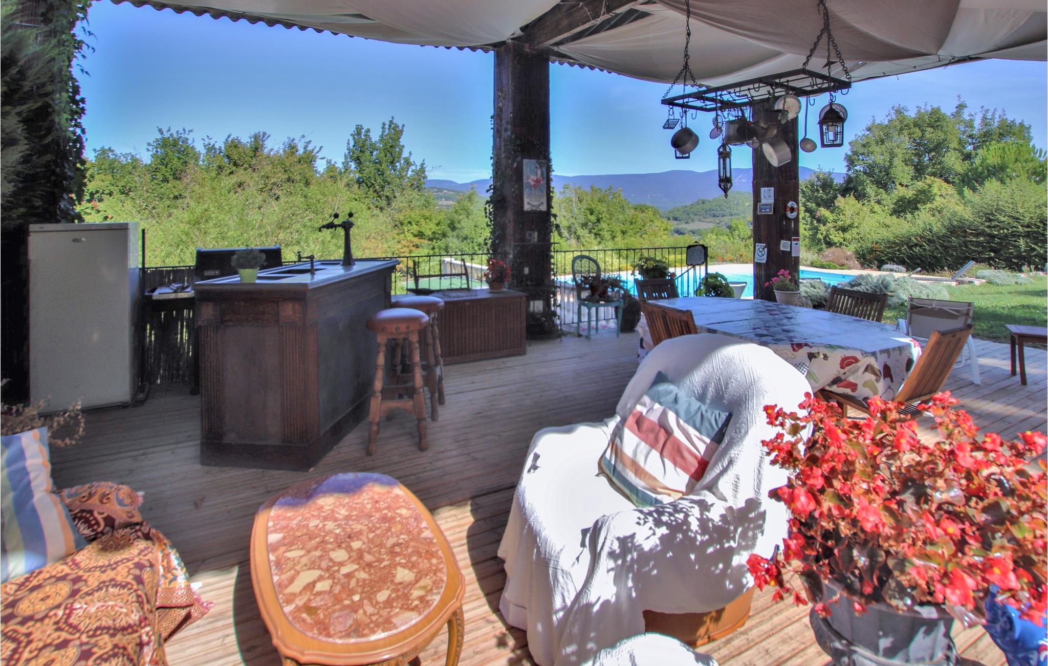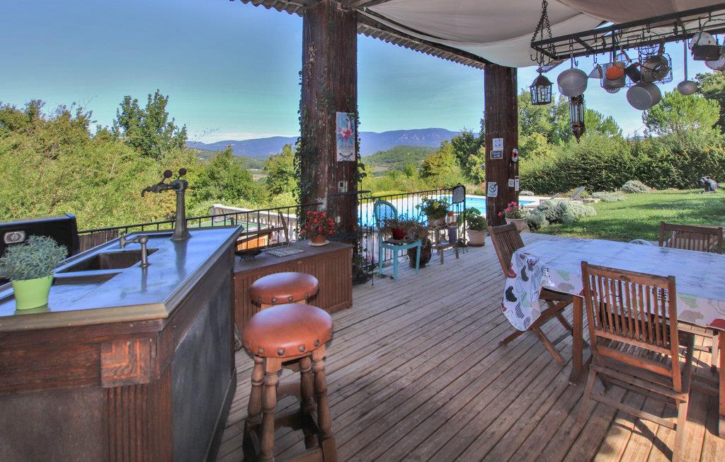 Das Haus hat eine weitläufige und angenehm schattige Terrasse, einen sichtgeschützten Privatpool und eine Sommerküche mit Blick auf das Luberon-Massiv. Die Unterkunft überzeugt durch einen großzügigen Schnitt, hochwertige Möbel und eine hochwertige Dekoration. Von dem großen Wohnzimmer mit offener Küche hat man Zugang nach draußen.