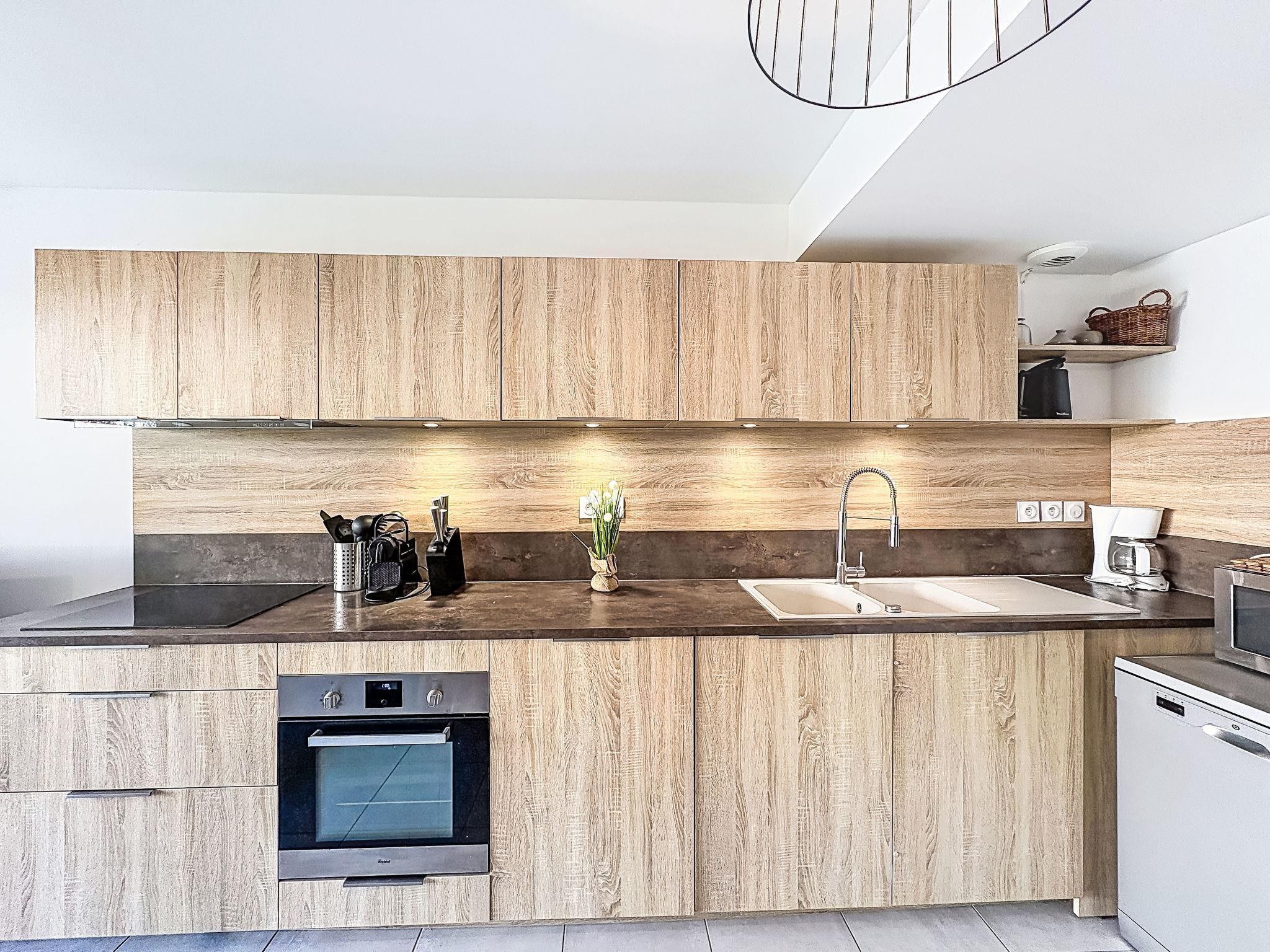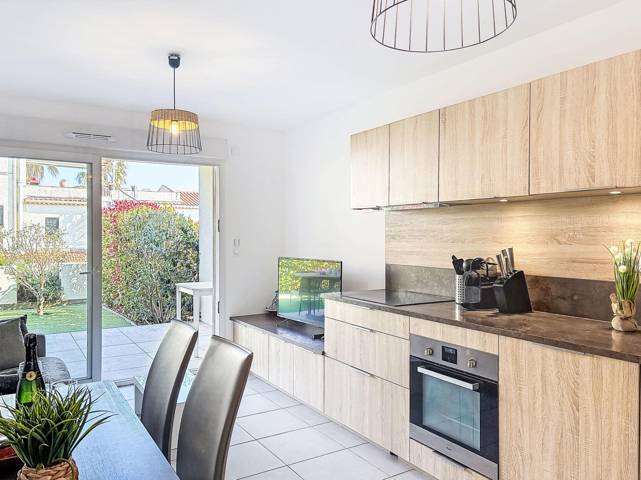 3-room apartment 55 m2, on the ground floor, south-east facing position. Beautiful and modern furnishings: living/dining room with panoramic window with TV (flat screen), air conditioning and electric shutters. Exit to the garden, to the terrace. 1 room with 1 french bed (1 x 140 cm, length 190 cm), TV (flat screen), air conditioning. Exit to the garden, to the terrace. 1 room with 1 french bed (1 x 140 cm, length 190 cm), air conditioning. Exit to the garden, to the terrace. Open kitchen (oven, dishwasher, 3 induction hot plates, toaster, kettle, microwave, freezer, electric coffee machine, Capsules for coffee machine (Nespresso) extra). Shower, sep. WC. Heating. Terrace 15 m2, roofed, garden 73 m2. Terrace furniture, deck chairs (2). View of the garden. Facilities: washing machine, iron, hair dryer. Parking space n 15 (1 car). Please note: suitable for families. Non-smokers only. TV only FR. Smoke alarm. FJS1151HT@