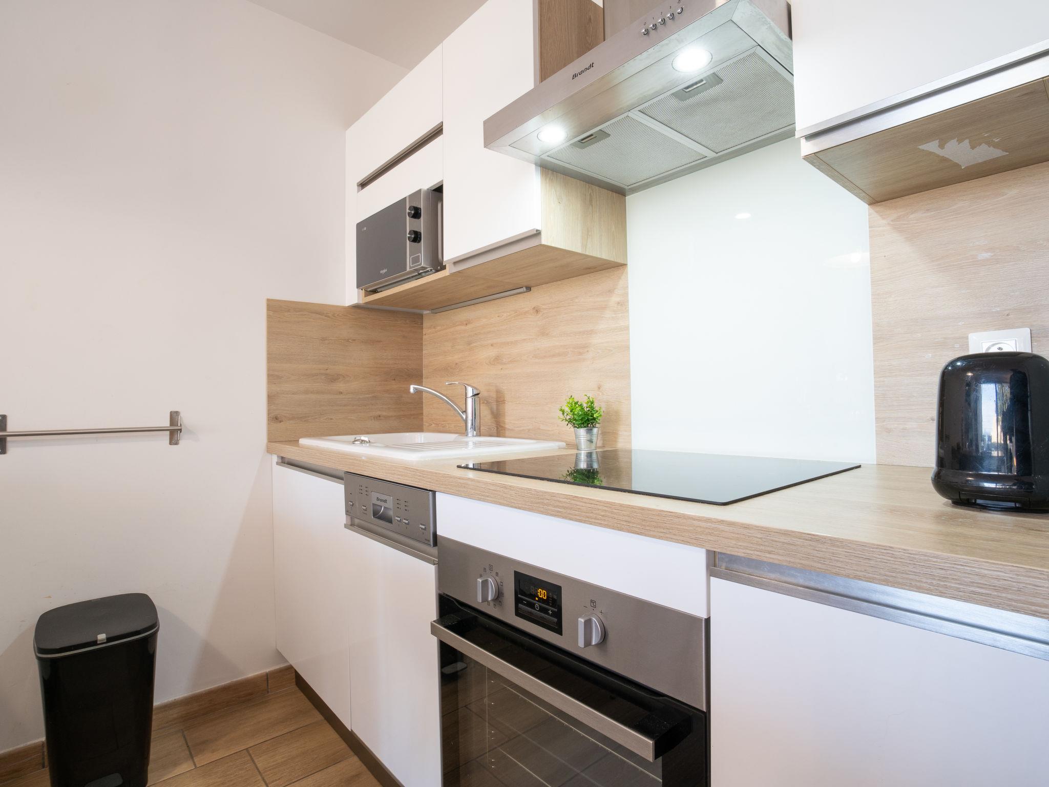 2-room apartment 45 m2, on the ground floor, east facing position. Renovated in 2021, beautiful and modern furnishings: living room with panoramic window with 1 double sofabed (140 cm, length 190 cm), TV (flat screen), fan and electric shutters. Exit to the terrace. 1 room with 2 beds (90 cm, length 190 cm), fan. Open kitchen (oven, dishwasher, 3 ceramic glass hob hotplates, toaster, kettle, microwave, freezer, electric coffee machine) with dining nook. Shower/WC. Electric heating. Terrace 20 m2, east facing position. Terrace furniture, deck chairs (4). View of the sea. Facilities: iron. Internet (WiFi, extra). Parking space n B13. Please note: suitable for families. Non-smoking house. TV only FR. Smoke alarm. FJS831HT